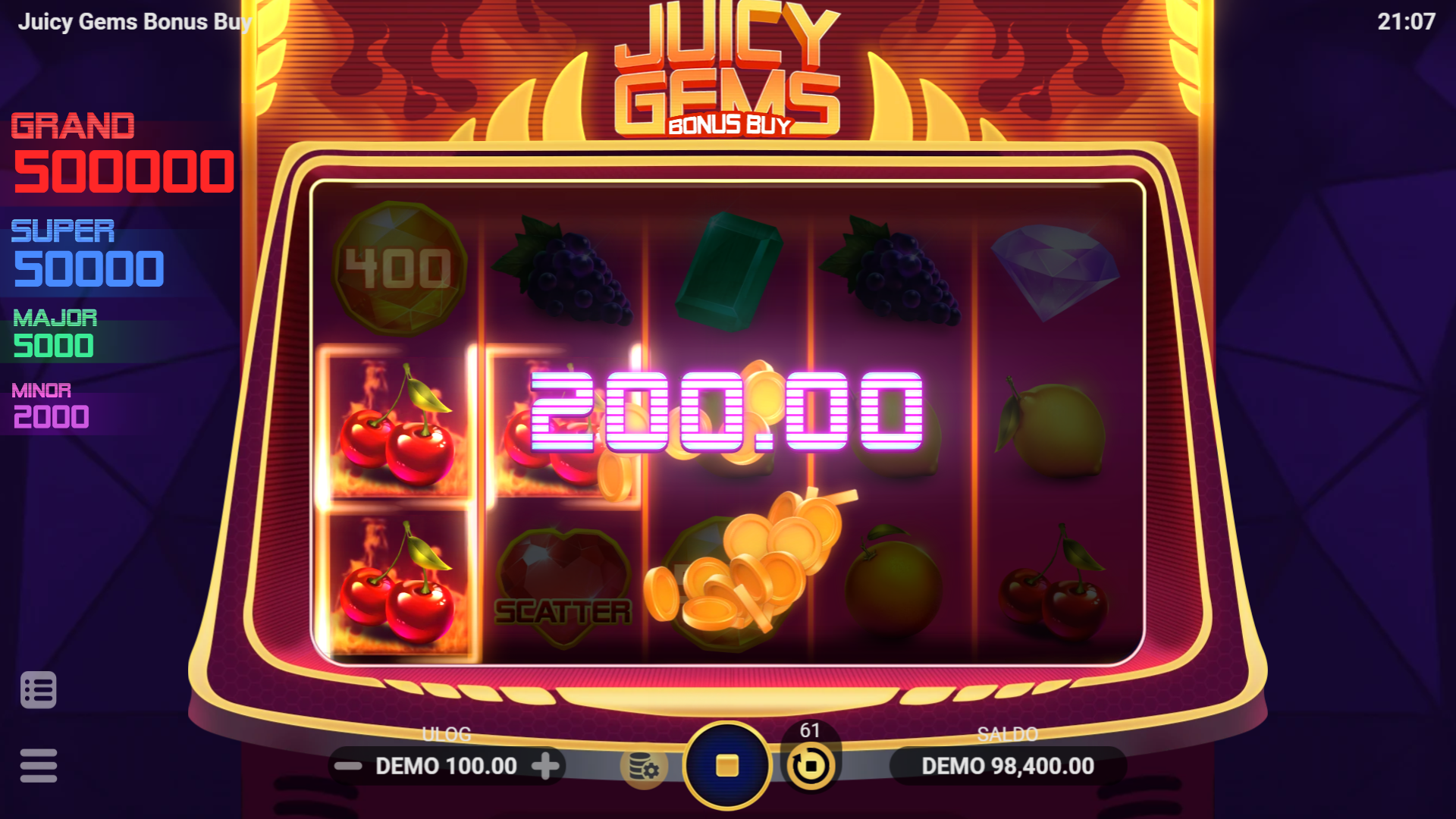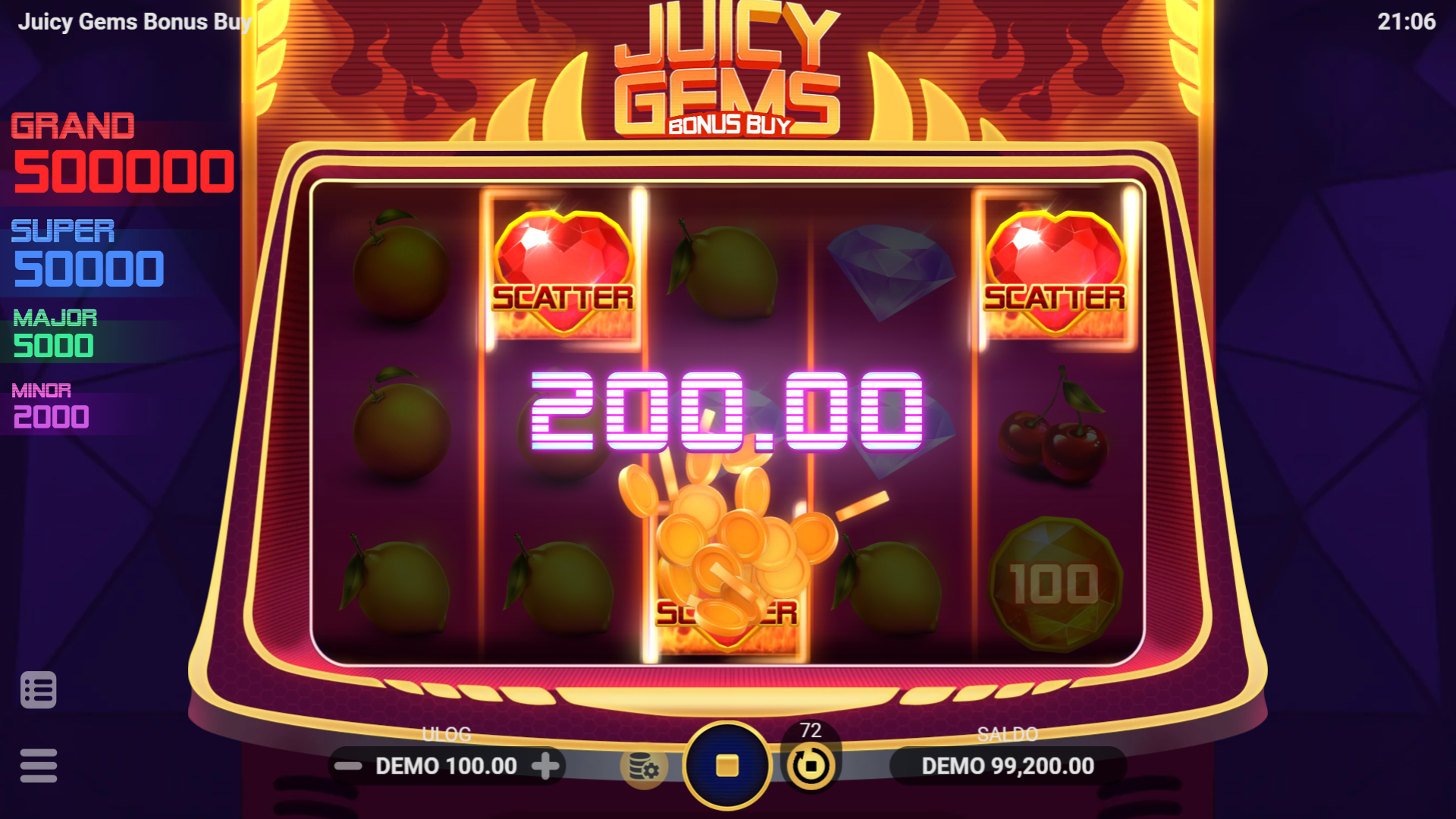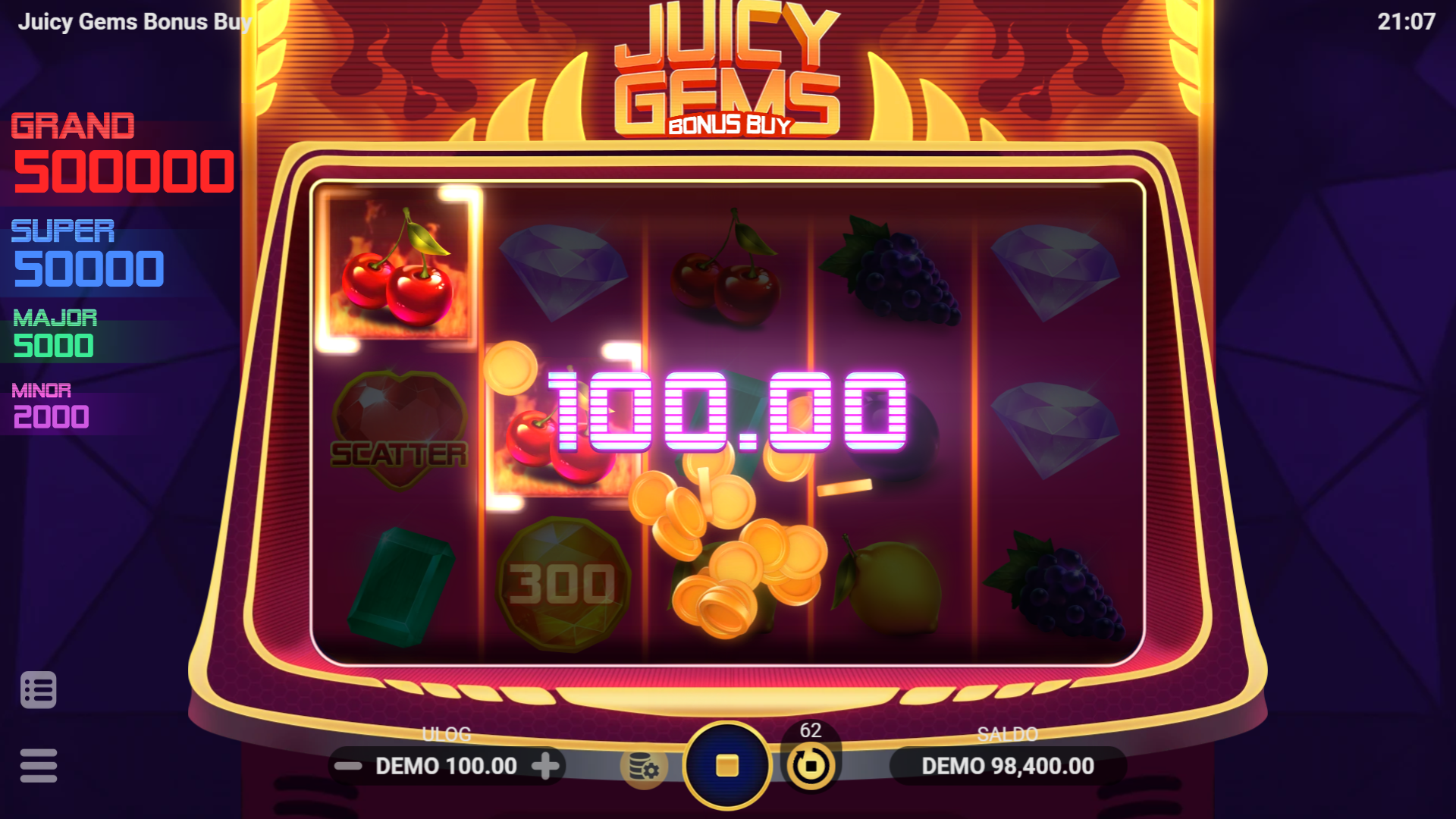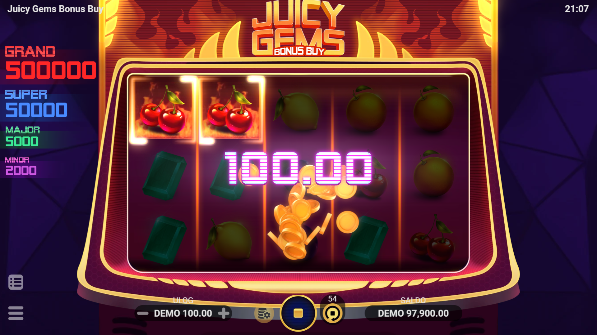 Juicy Gems Bonus Buy pruža jednostavan i dinamičan gameplay. Igra se na 5 valjaka i 3 reda s 5 fiksnih dobitnih linija. Uz uobičajene simbole, posebnu pažnju posveti Scatter i Bonus simbolima jer oni aktiviraju bonus igru. Ako sakupiš 5 ili više Bonus simbola, ulaziš u Bonus igru s 3 početne vrtnje. Svaki put kad novi Bonus simbol padne na valjke, broj vrtnji se resetira na 3, a simboli ostaju zaključani. Posebnost igre je i mogućnost osvajanja čak 4 jackpota, od Minor do Grand jackpota, što igru čini izuzetno uzbudljivom i potencijalno unosnom.