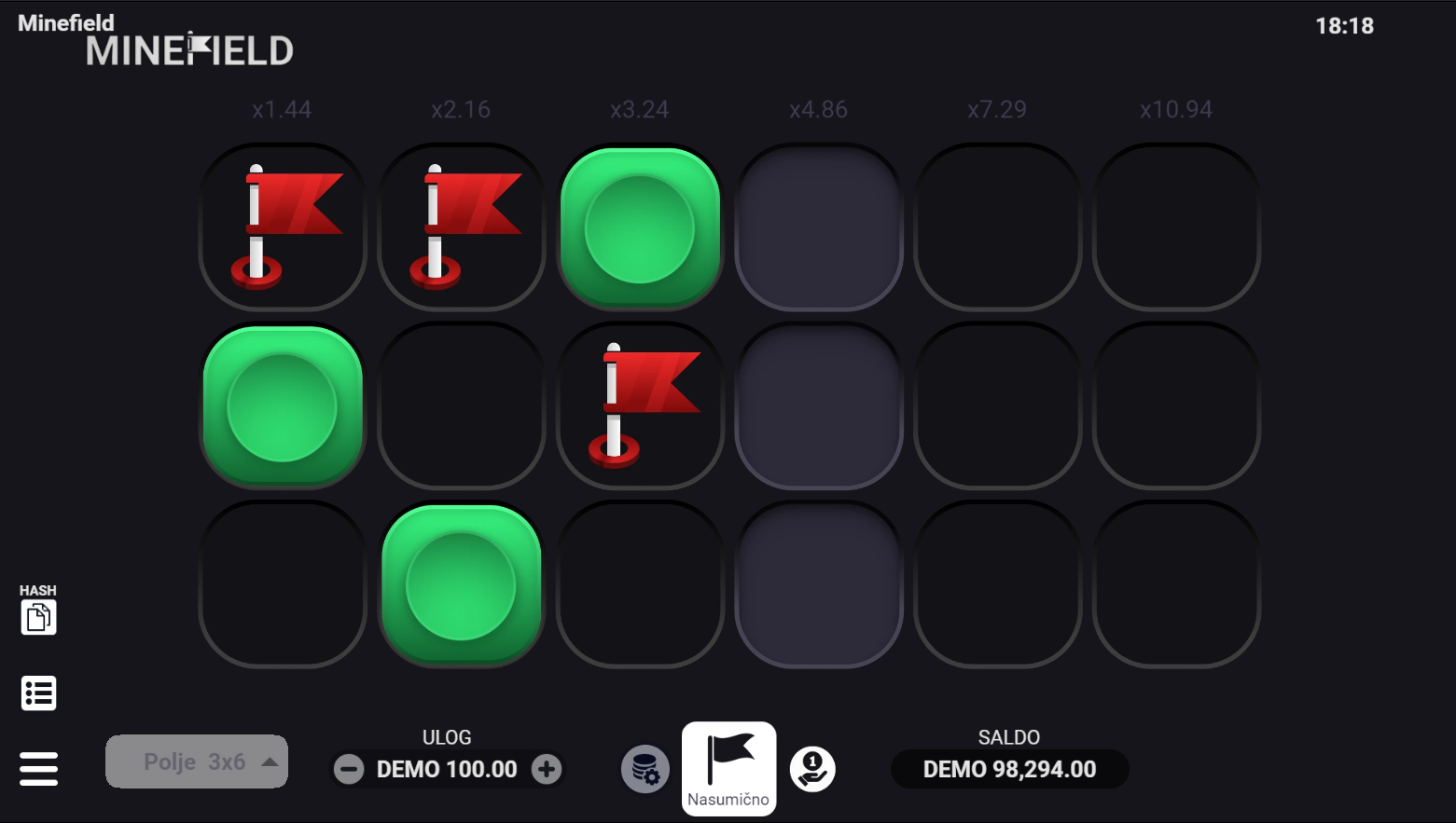 Gameplay u Mine Fieldu je jednostavan i napet. Počinješ odabirom iznosa uloga i veličine polja. Što je polje manje, opasnost je veća, ali su i isplate za svaki uspješan korak veće. Za svaki korak odaberi osvijetljeni kvadrat. Ako je kvadrat siguran, možeš nastaviti dalje ili prikupiti trenutni dobitak. Ako je u kvadratu mina, gubiš ulog i sve dobitke u toj rundi. Svaki korak donosi uzbuđenje i priliku za veću nagradu.