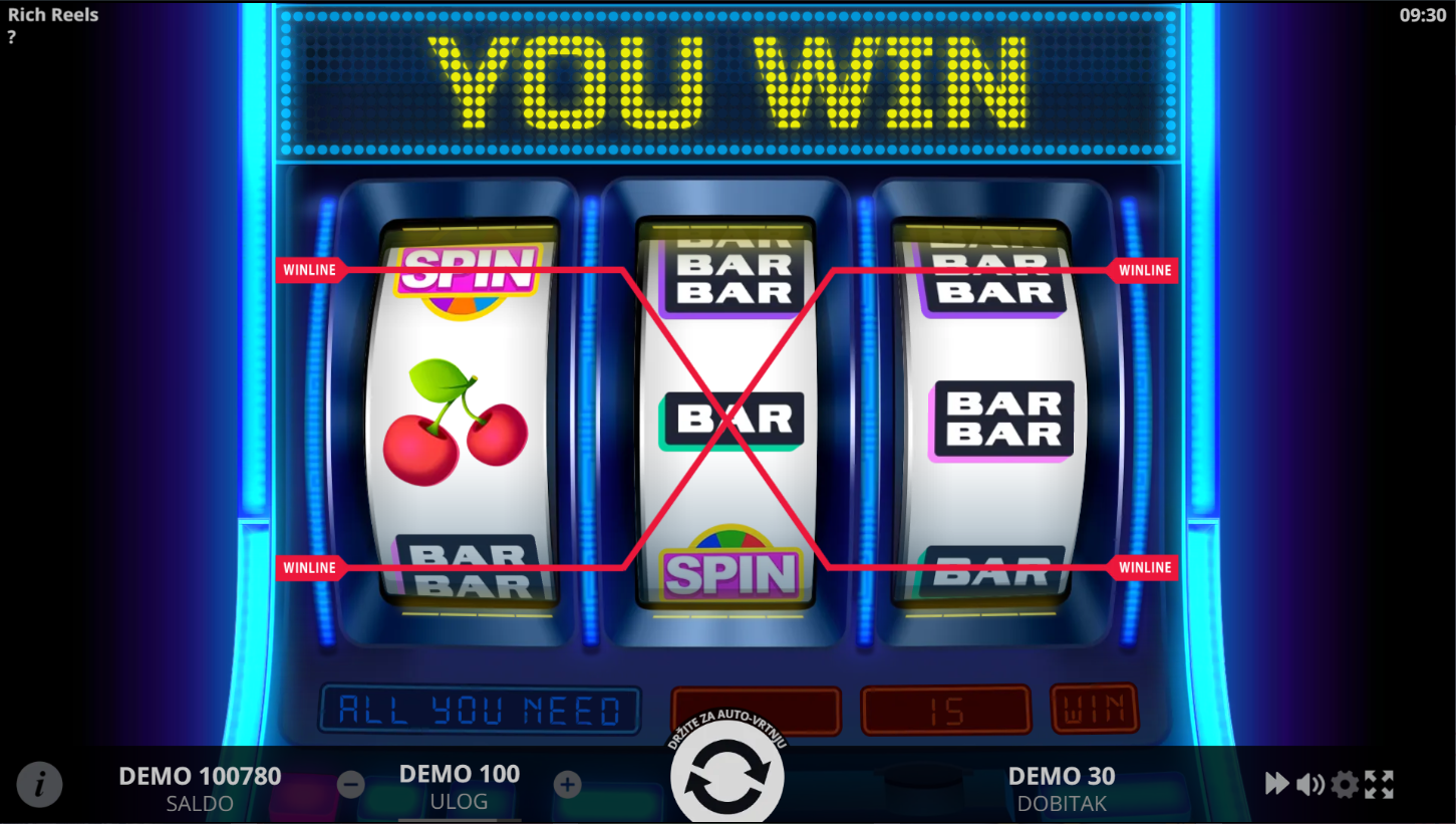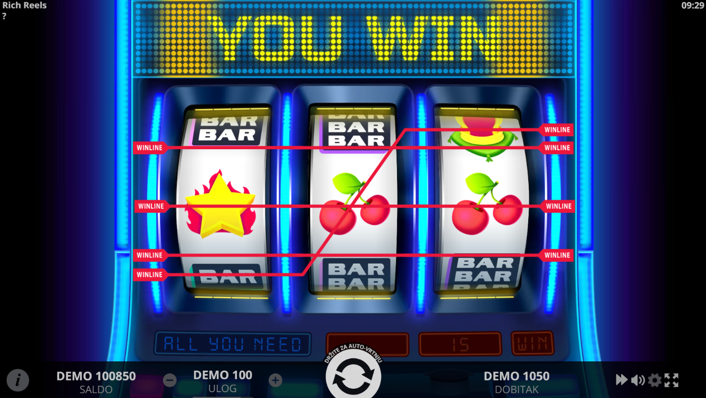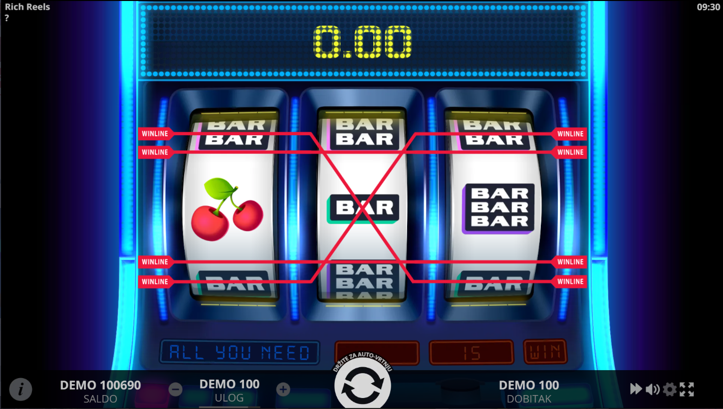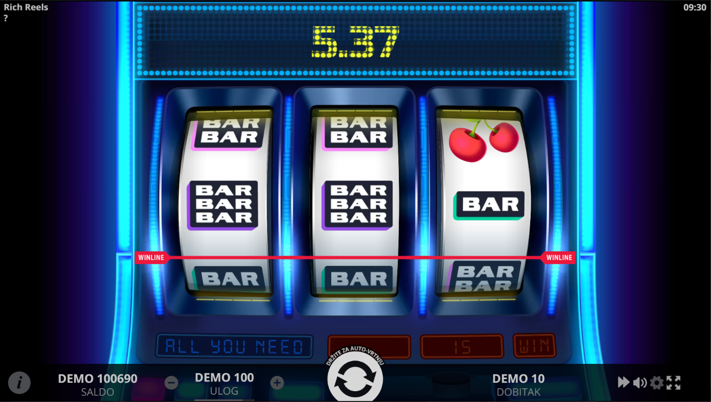 Rich Reels je retro slot od Evoplay-a koji vraća klasičnu atmosferu voćnih automata. Igra se na 3 kolone, 3 reda i 5 fiksnih linija. Simboli uključuju trešnje, zvona, BAR-ove i zlatne krune, a sve je predstavljeno u sjajnom i elegantnom stilu. Dizajn kombinira starinsku jednostavnost s modernim vizualnim efektima.