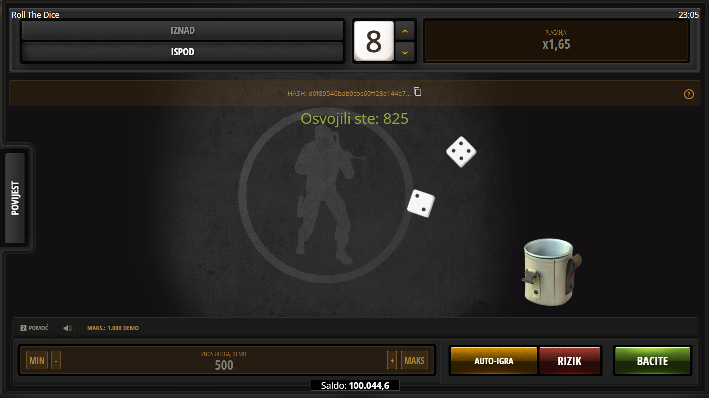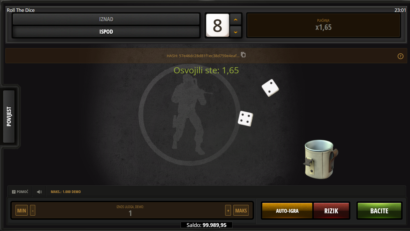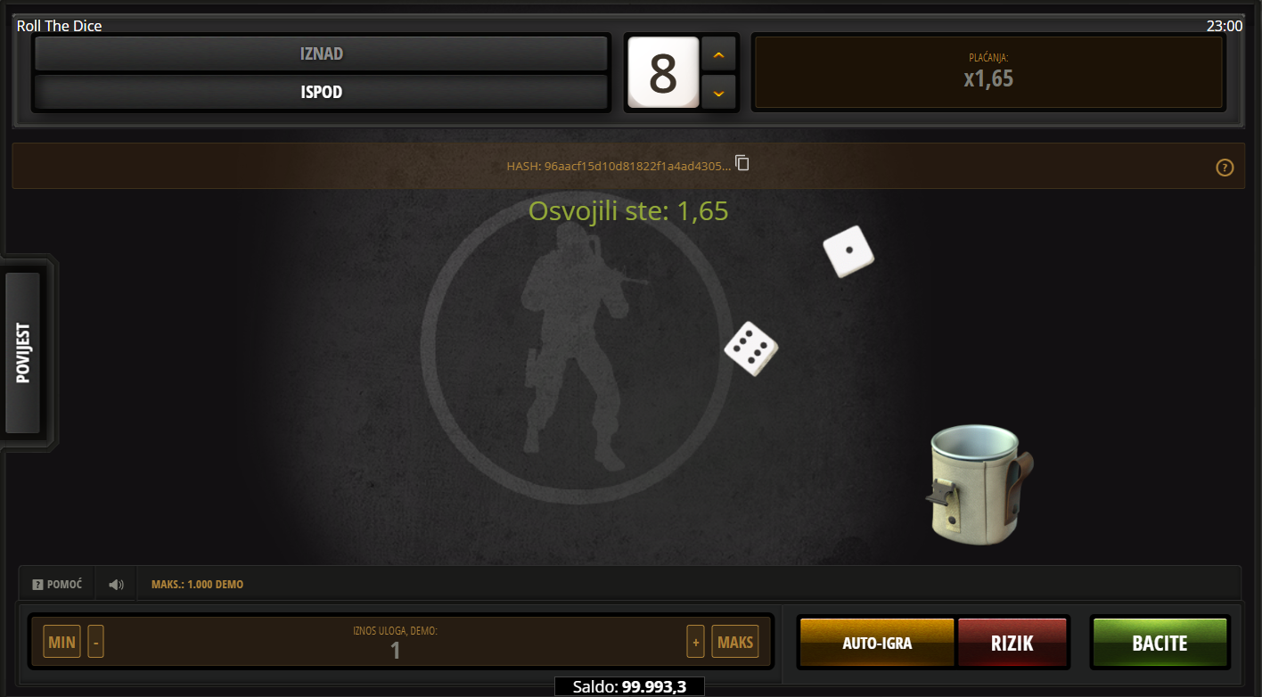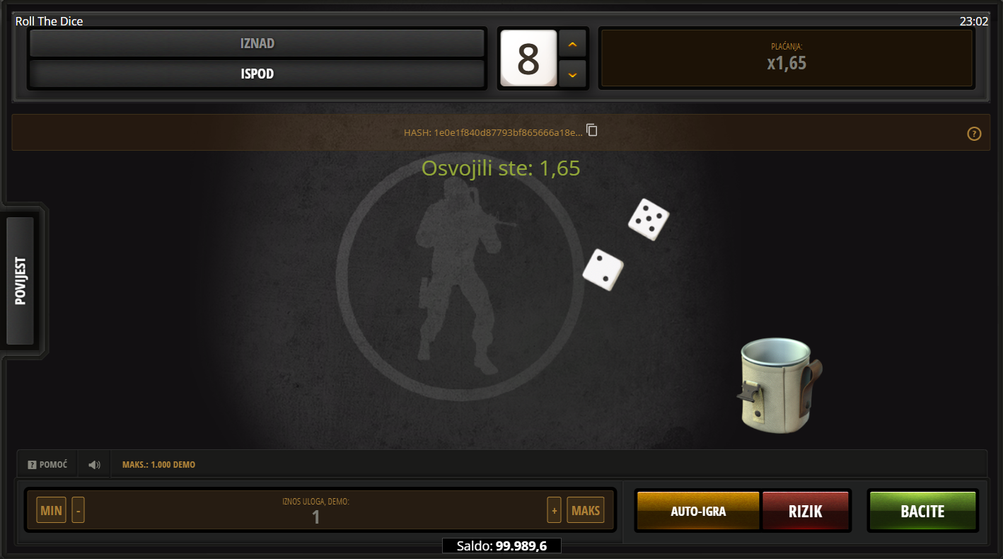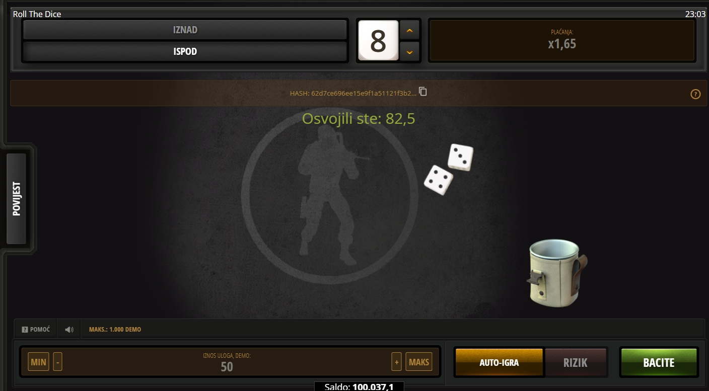 Roll The Dice ima RTP 95,83% i nisku volatilnost što pruža manje, ali češće dobitke!