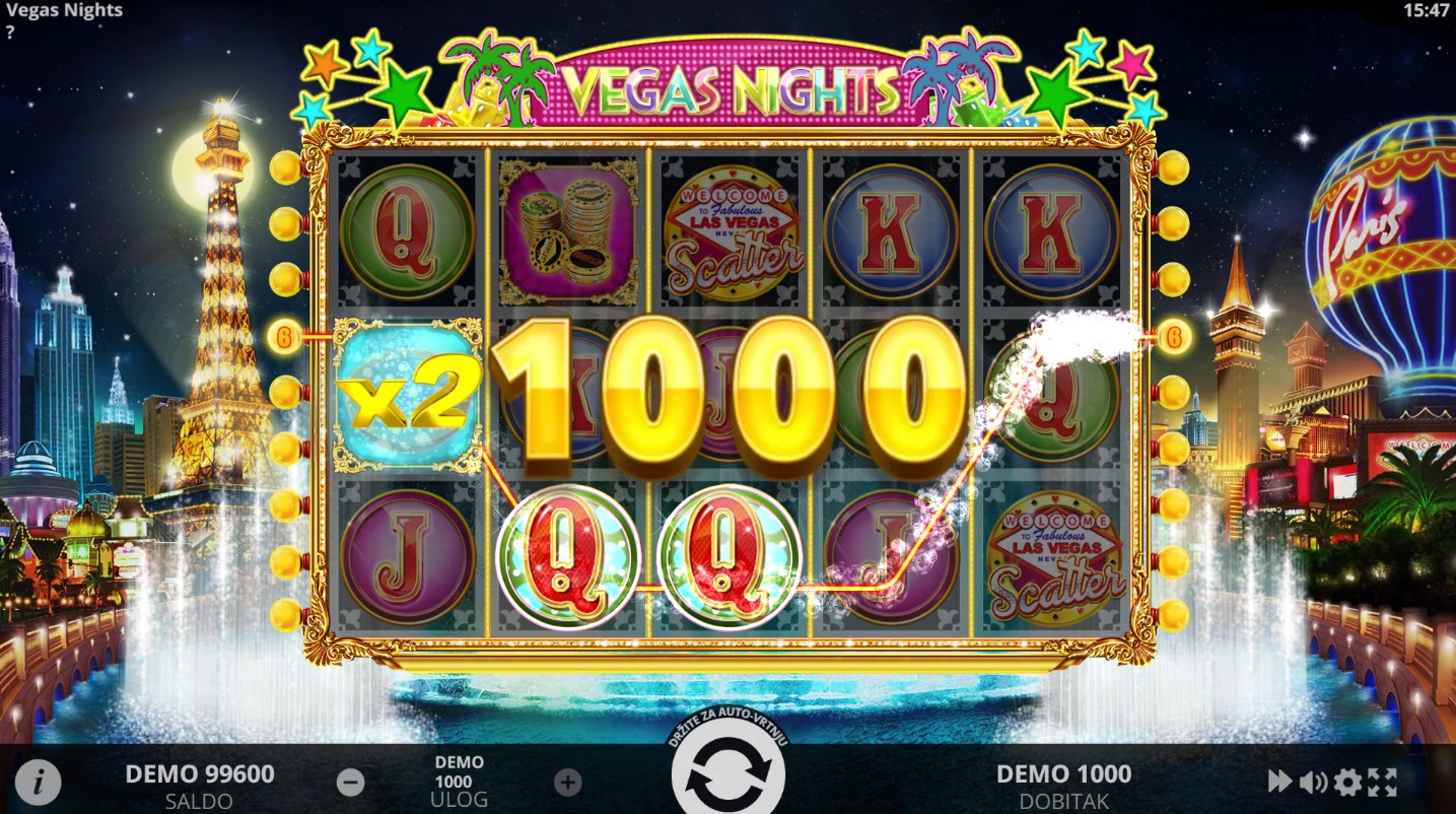 Zakorači u svijet Las Vegasa i uživaj na 5 bubnjeva i 3 reda s 9 fiksnih dobitnih linija. Složi dobitne kombinacije simbola slijeva nadesno, koristi Wild multiplikatore za povećanje dobitaka i aktiviraj besplatne vrtnje pomoću Scatter simbola. Zbrajanjem multiplikatora po liniji možeš postići i do 25x, što čini svaku vrtnju napetom i dinamičnom. Vegas Nights spaja glamur, uzbuđenje i visok potencijal dobitaka, idealno za ljubitelje klasičnih slotova s modernim značajkama.