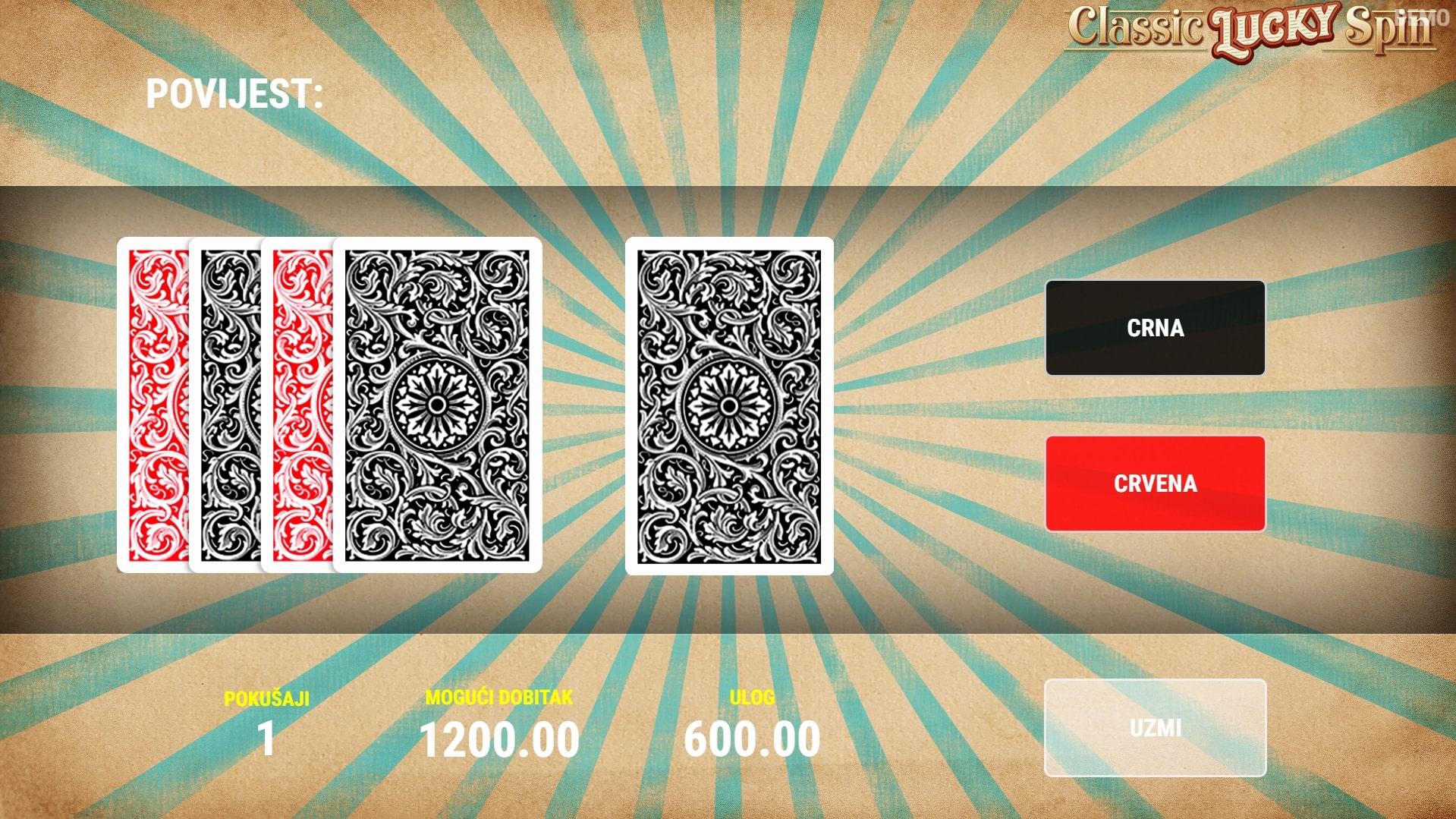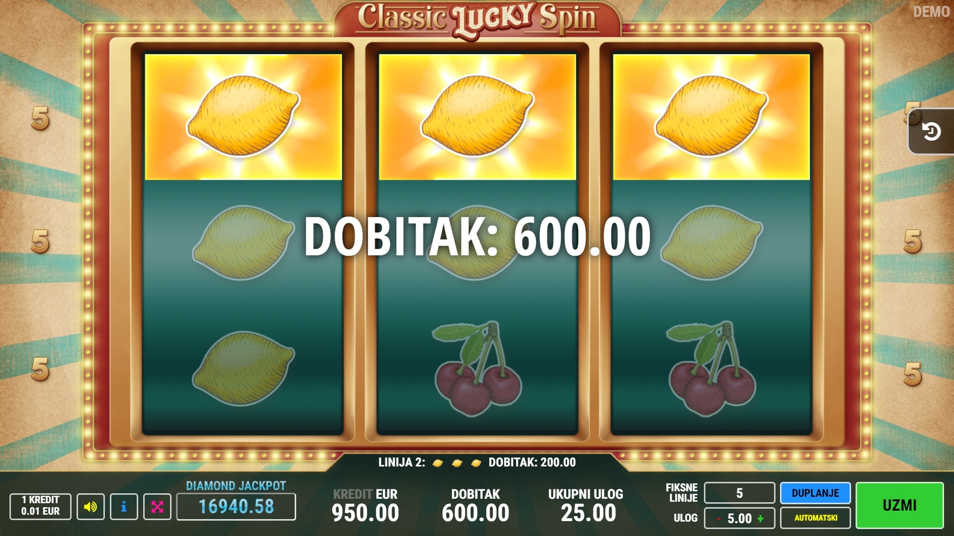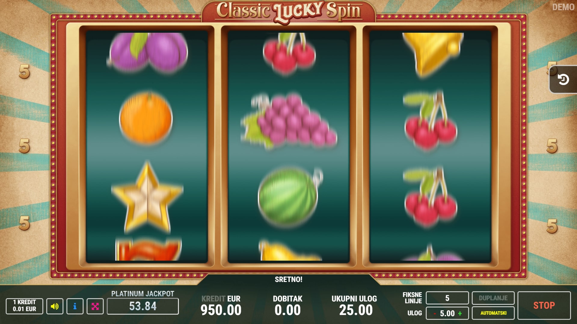 Classic Lucky Spin slot je igra retro karaktera koja vodi igrača u svijet tropskog voća i osvježavajućih dobitaka. Najviše isplaćuju sedmice, a zatim slijede zvijezde i zvona te razno voće. U slučaju dobitka, igrač ga može pokušati udvostručiti pogađanjem boje karte okrenute licem prema dolje. Zaigraj Classic Lucky Spin te ostvari vrhunske nagrade!