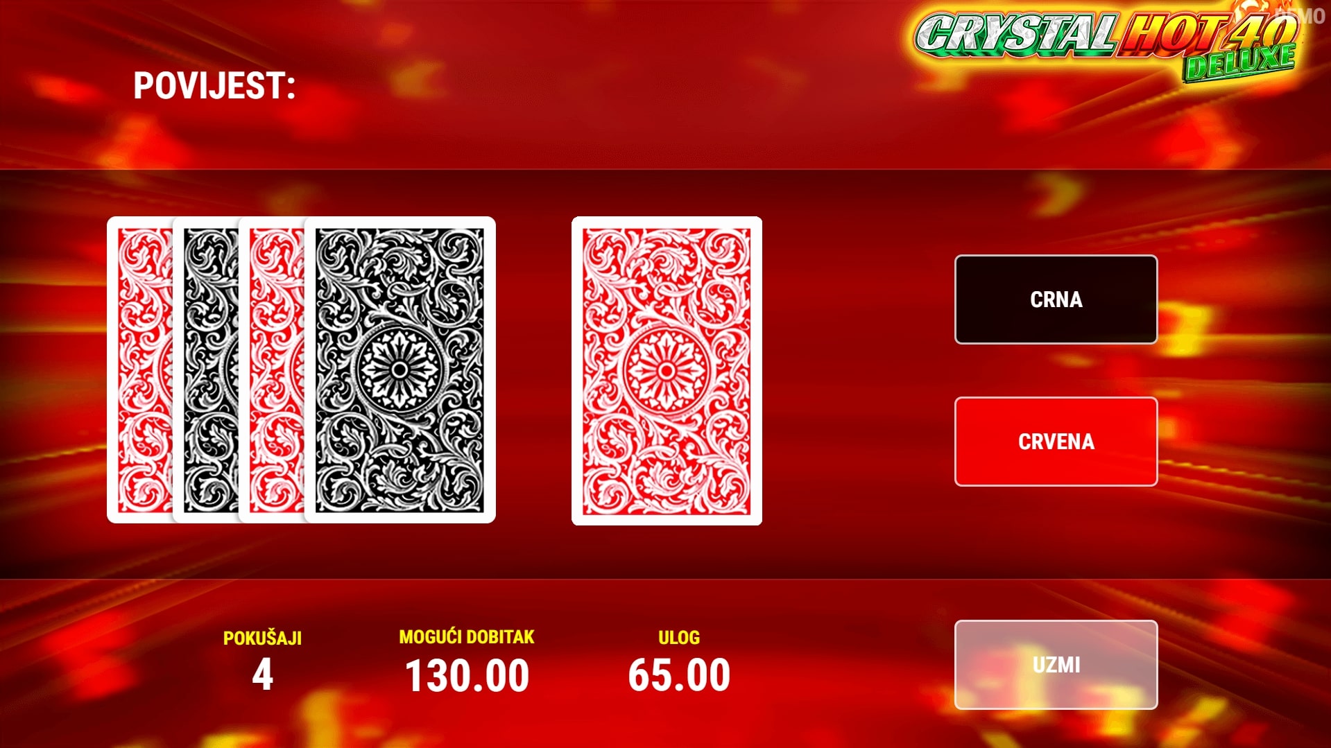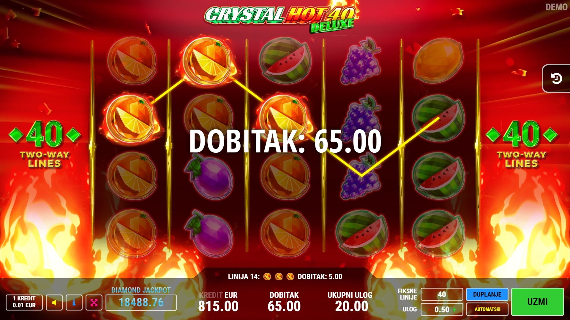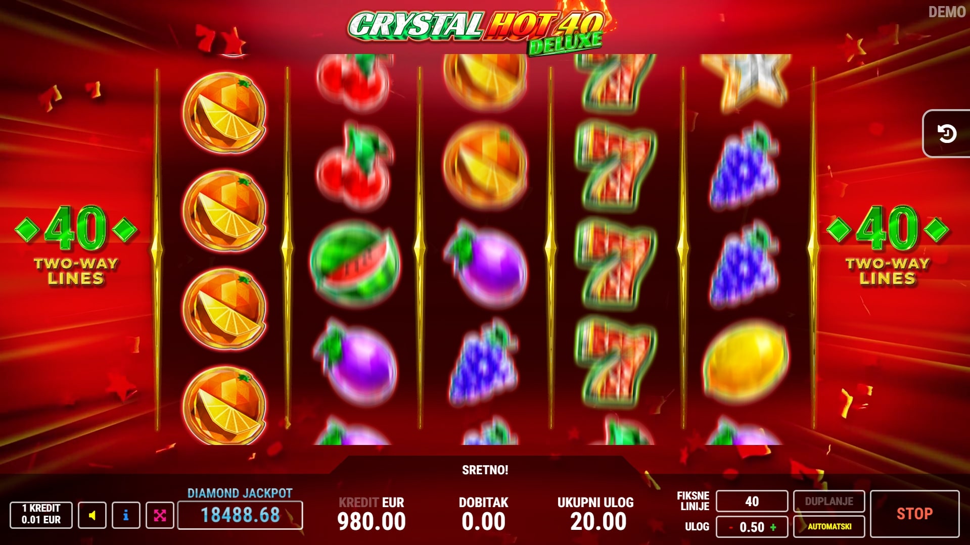 Crystal Hot 40 Deluxe slot je igra klasičnog karaktera koja vodi igrača u svijet voća i slasnih dobitaka. Simboli naranča i limuna kao da su napravljeni od dijamanata, dok najviše isplaćuju simboli grožđa, sedmica i zvijezda. Sedmice također služe kao zamjena za druge simbole, a zvijezda može isplatiti vrhunske dobitke neovisno o isplatnim linijama. U slučaju dobitka, igrač ga može 'poduplati' pogađanjem boje karte okrenute licem prema dolje. Zaigraj Crystal Hot 40 Deluxe te osvoji vrhunske nagrade!