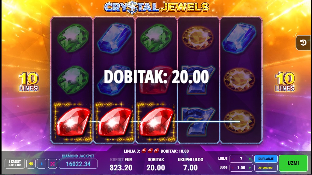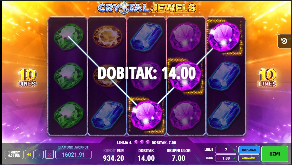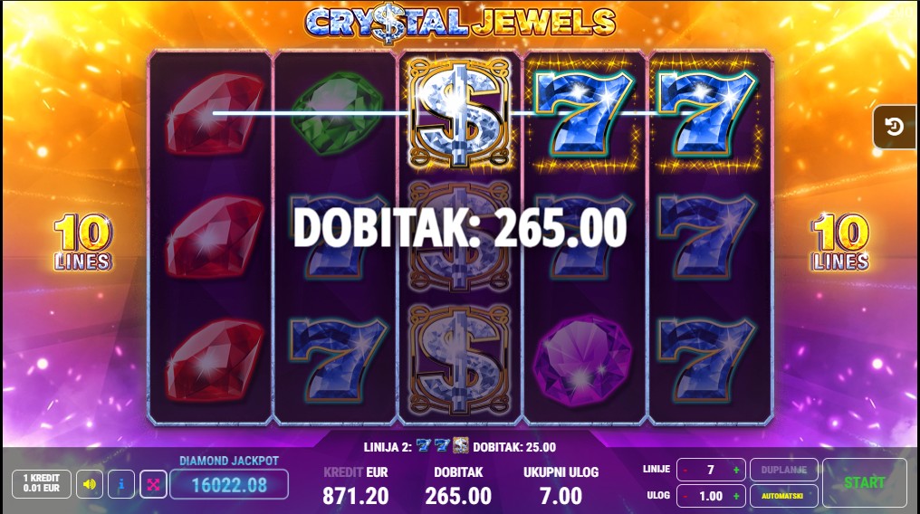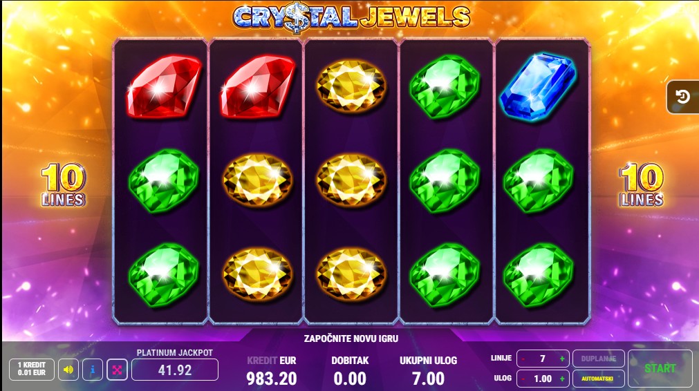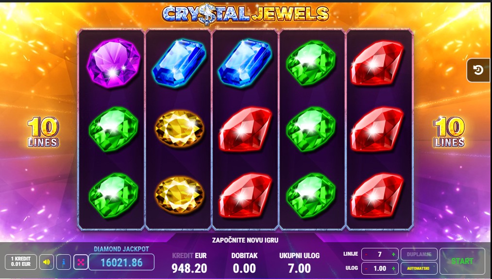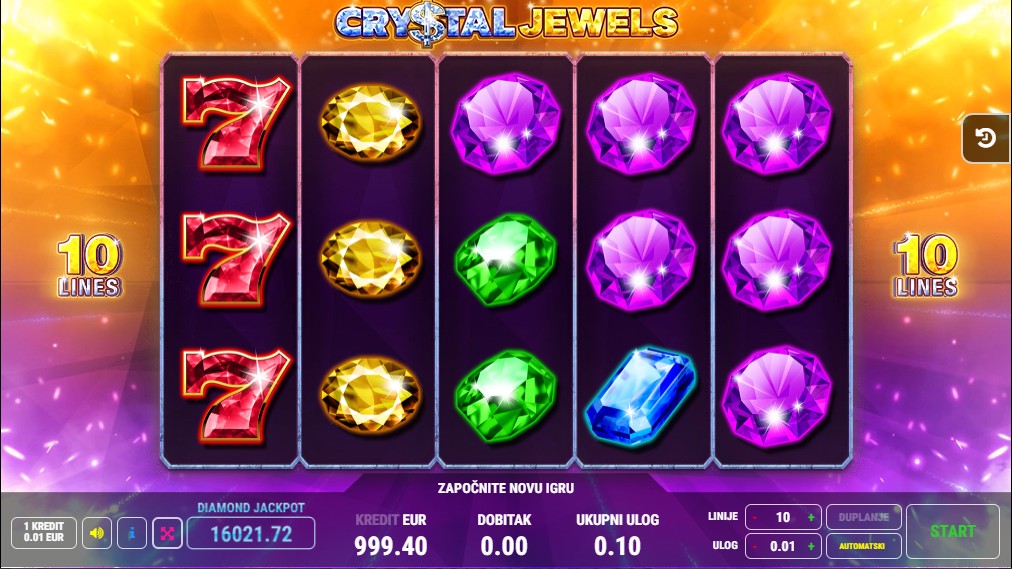 Crystal Jewels vodi te u blještavu avanturu gdje je cilj složiti dobitne kombinacije simbola na 5 valjaka i 10 isplatnih linija s lijeva na desno. Wild simboli mogu zamijeniti bilo koji drugi simbol osim Scattera i doprinjeti stvaranju dobitnih kombinacija, dok Scatter simboli donose posebne nagrade neovisno o poziciji na bubnjevima. Dodatnom uzbuđenju donosi i misteriozni jackpot, koji može pasti potpuno nasumično nakon bilo kojeg spina, dodajući dodatnu dozu adrenalina i neizvjesnosti. Svaki dobitak možeš i udvostručiti pogađanjem boje karte u zabavnoj bonus igri. Svaka vrtnja nosi potencijal iznenađenja i luksuznih nagrada.