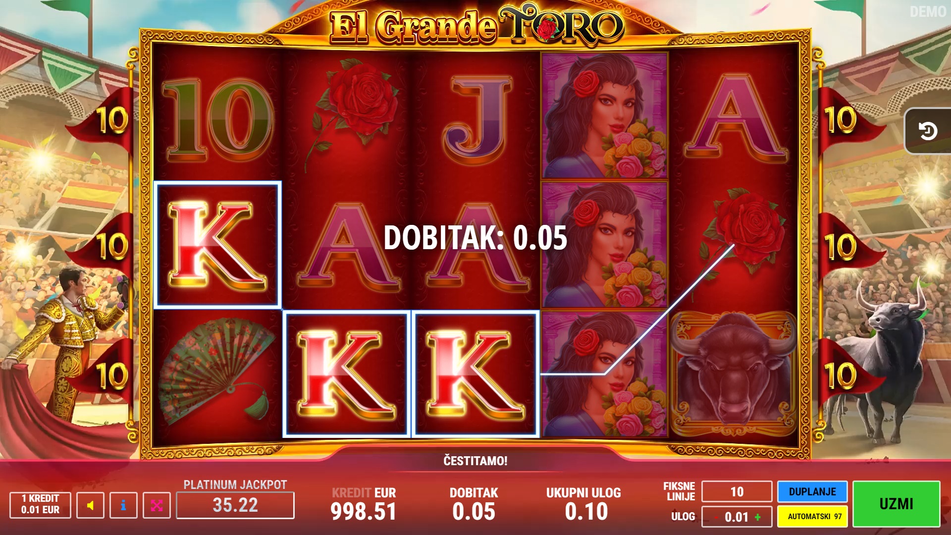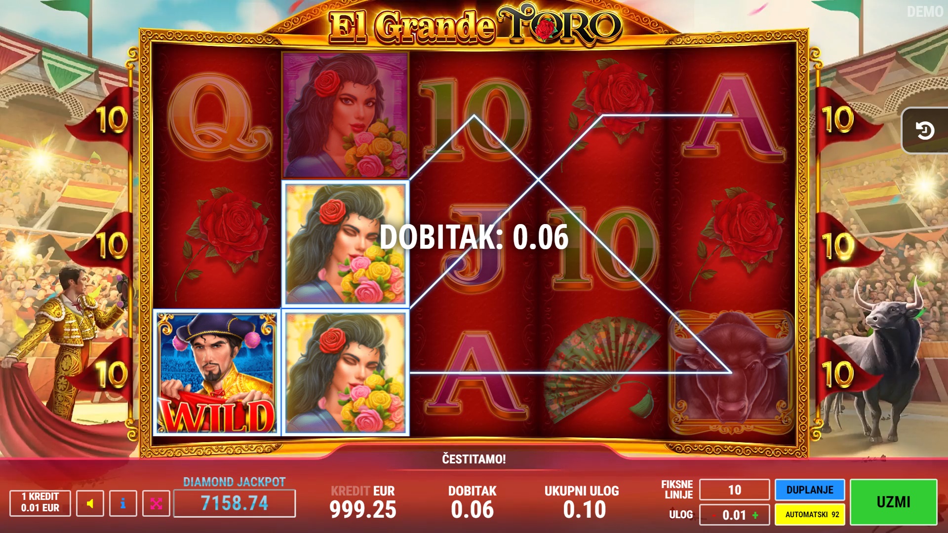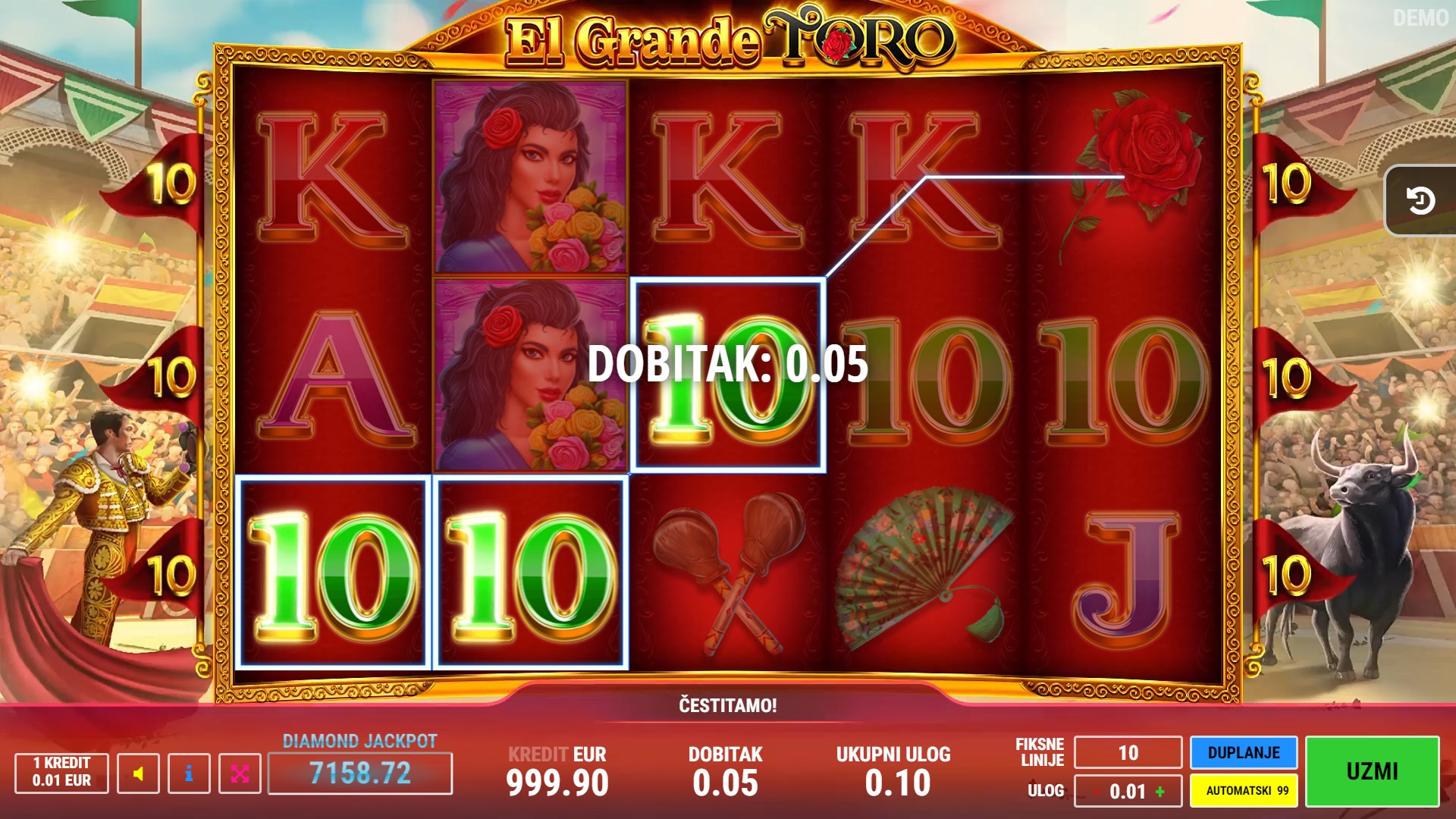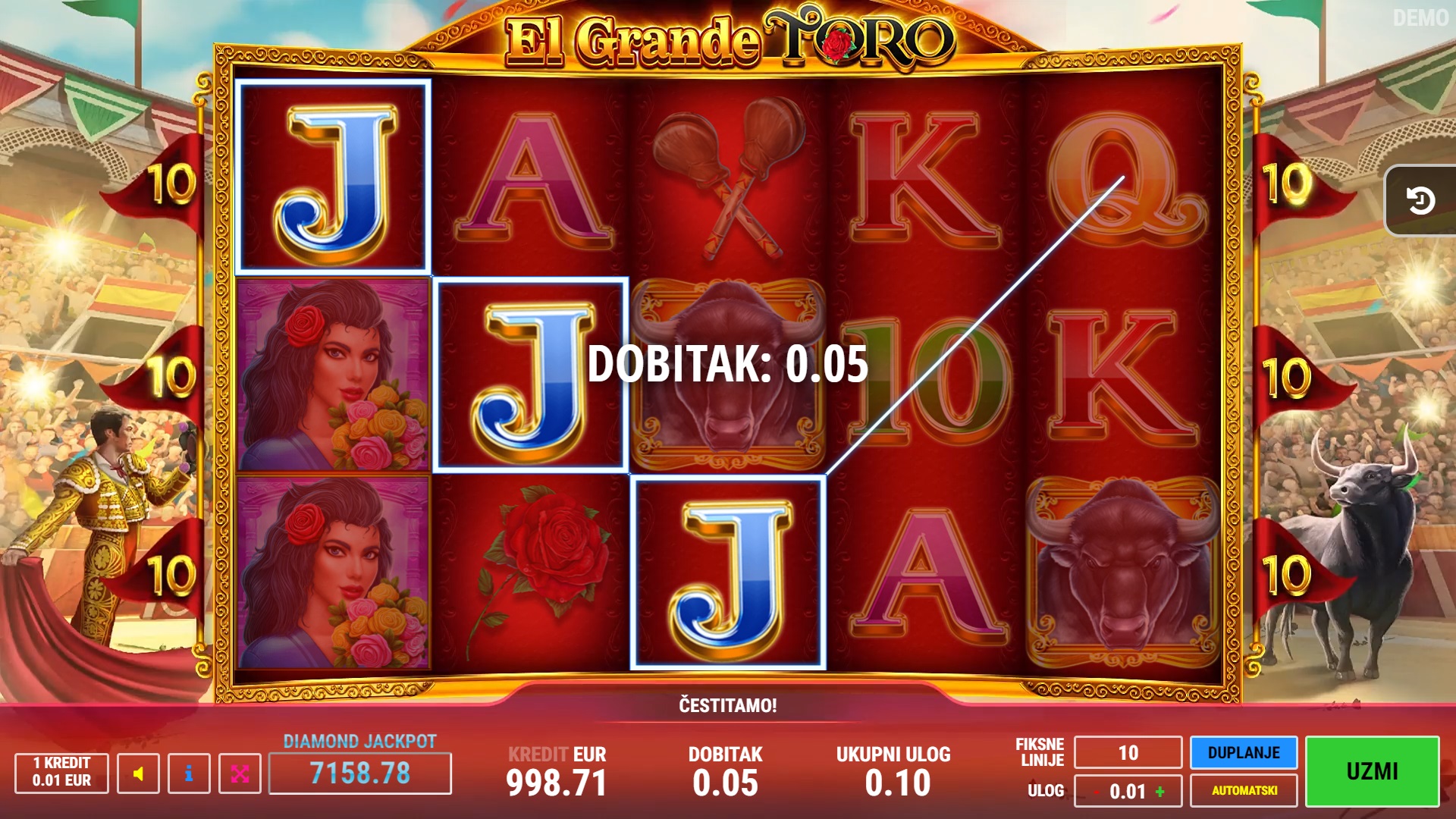 El Grande Toro te vodi u strastveni svijet španjolske koride, gdje te očekuju bogate nagrade i uzbudljive avanture. Ova dinamična igra na automatima nudi raznolike bonuse, uključujući besplatne vrtnje sa Sticky Wild simbolima koji povećavaju tvoje šanse za dobitak. Uz klasične simbole, tu su i jedinstvene značajke poput misterioznih jackpota i opcije duplanja dobitka. Pridruži se uzbuđenju i istraži sve mogućnosti koje El Grande Toro nudi!