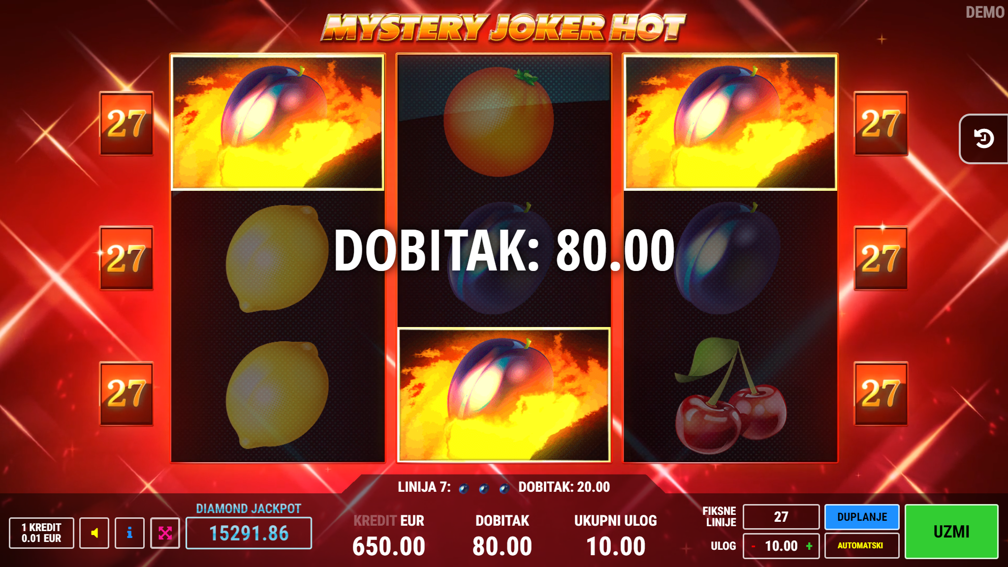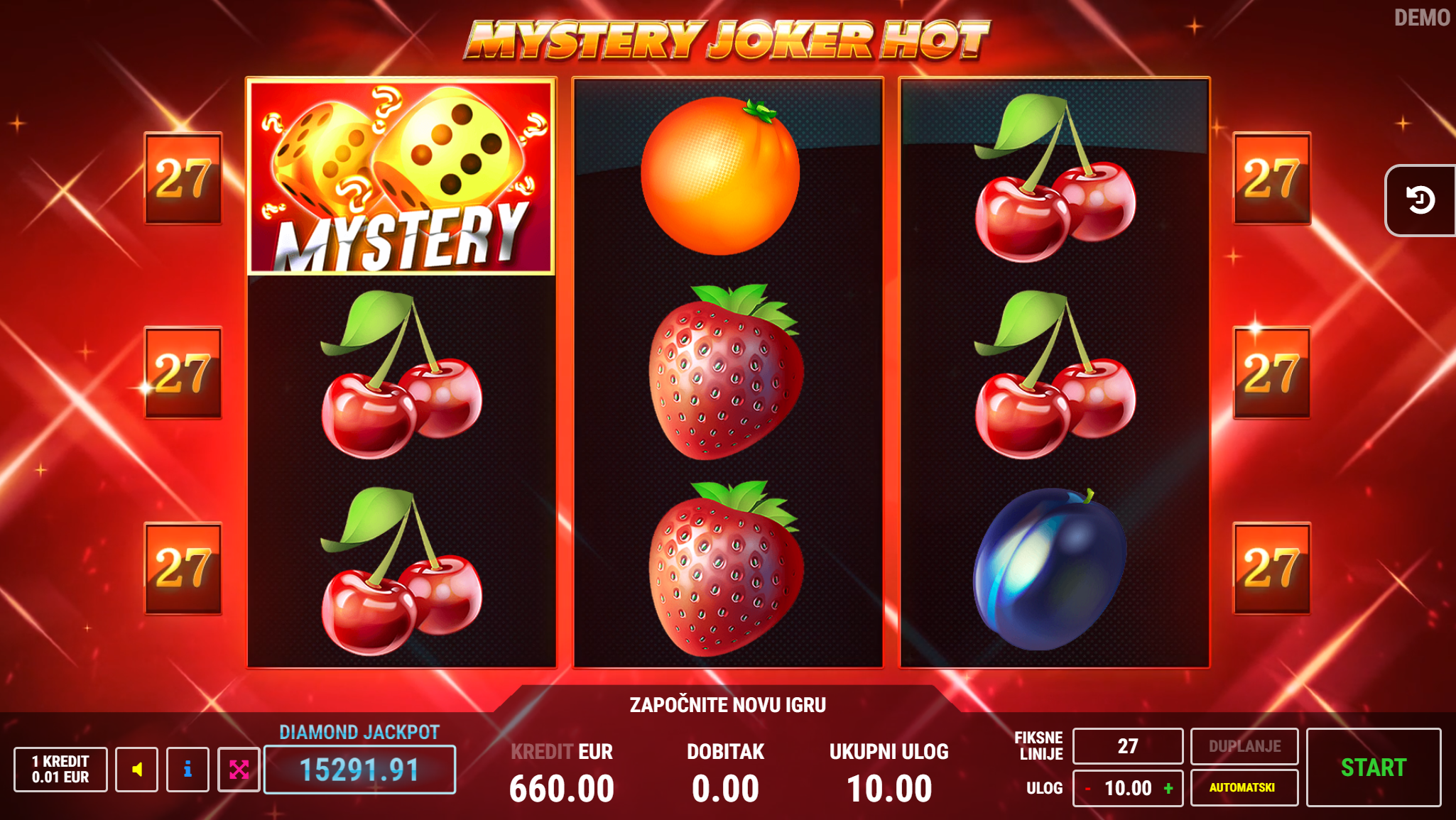 Ljubitelj si klasičnih i jednostavnih voćih slotova? Na pravom si mjestu jer Mystery Joker Hot pruža sve to, a i mnogo više. Primamljivo ilustrirano voće jednostavnog dizajna, kao i način igranja učiniti će dozu zabave i zanimacije nedostižnom! Kako uzbuđenju tu nebi bio kraj, pobrinuti će se joker simbol i igranje pretvoriti u super uzbudljivo te bogato po pitanju dobitaka! Kao jedan od najpopularnijih slotova, Mystery Joker Hot odličan je izbor za sve igrače koji vole izvrstan omjer rizika i dobitaka.