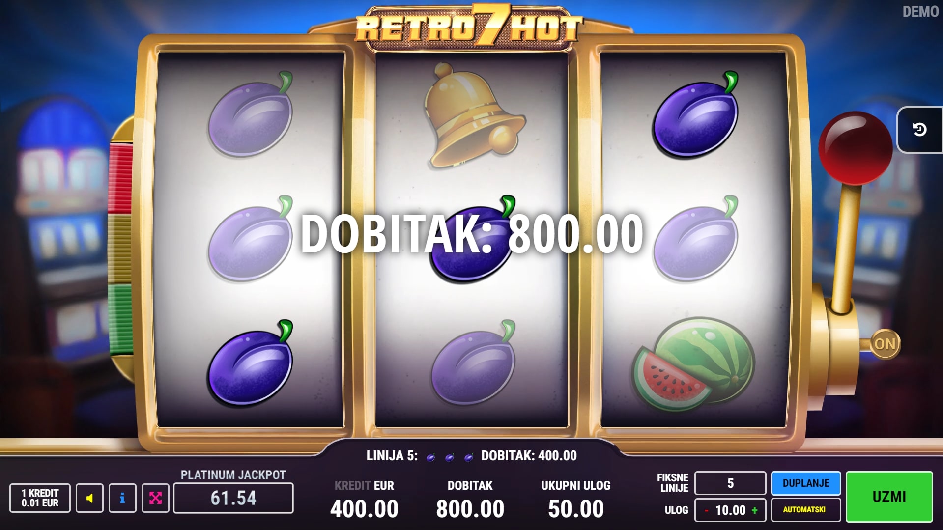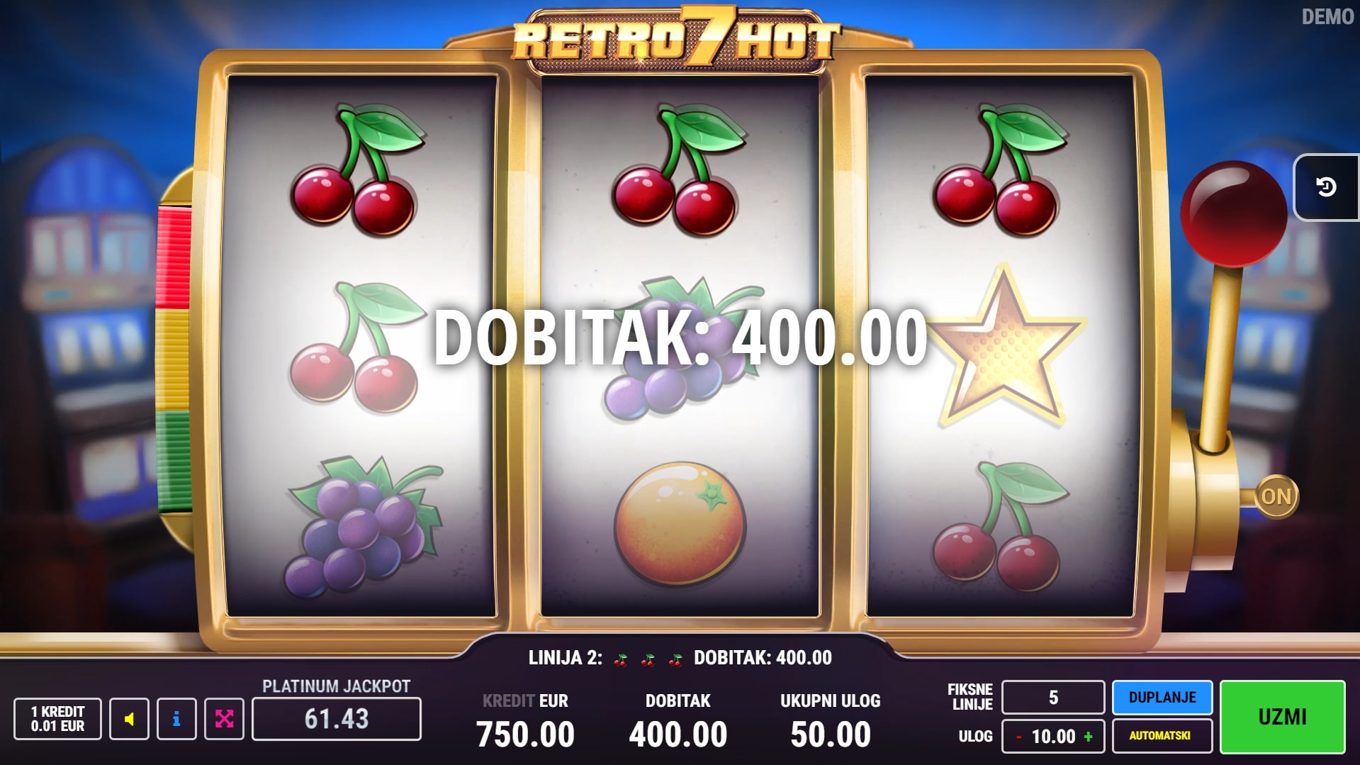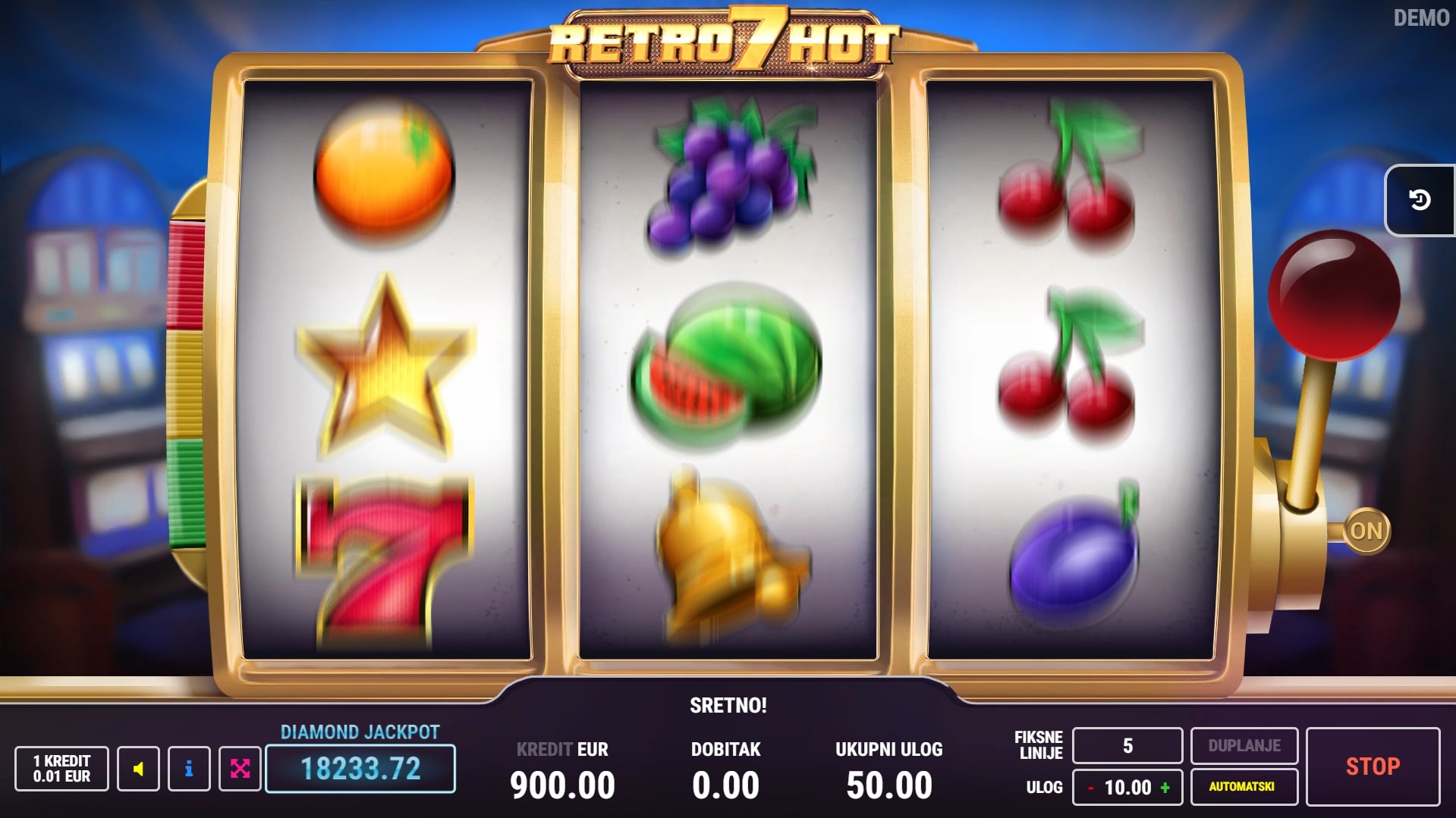Retro 7 Hot igra je izuzetno zabavnog i jednostavnog gameplaya savršenog za sve vrste igrača bez obzira na iskustvo. Igra sadrži uz to sadrži 5 isplatnih linija što se računaju s lijeva na desno, a igrač također može osvojiti nagrade misterioznog Jackpota čija šansa aktiviranja raste s količinom uloga za taj krug.