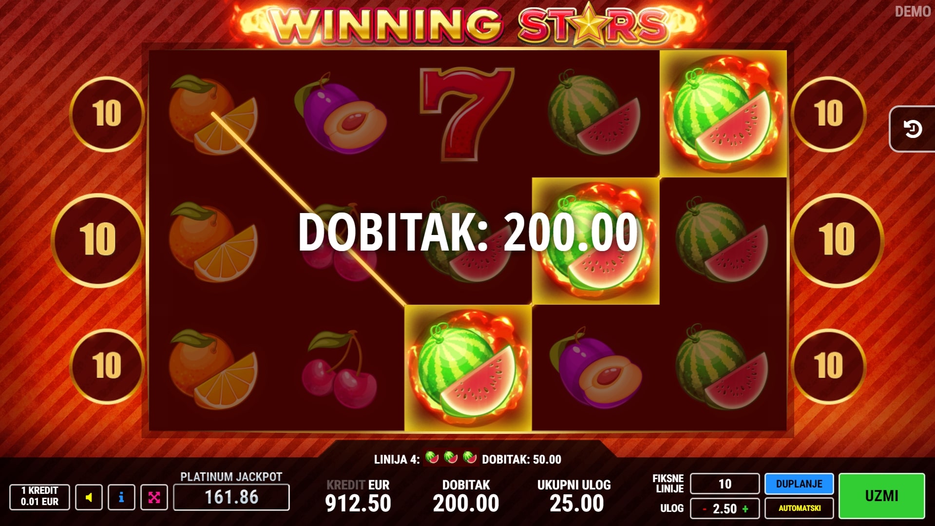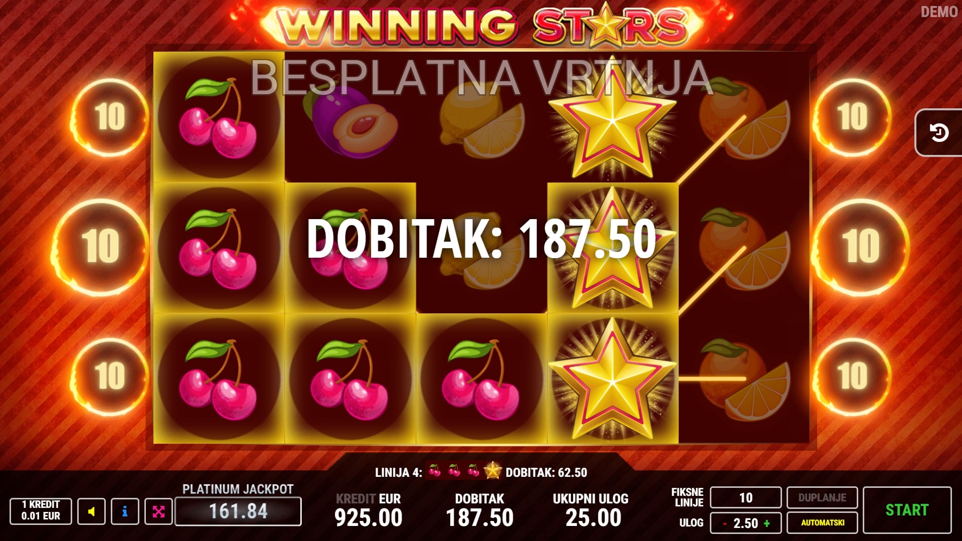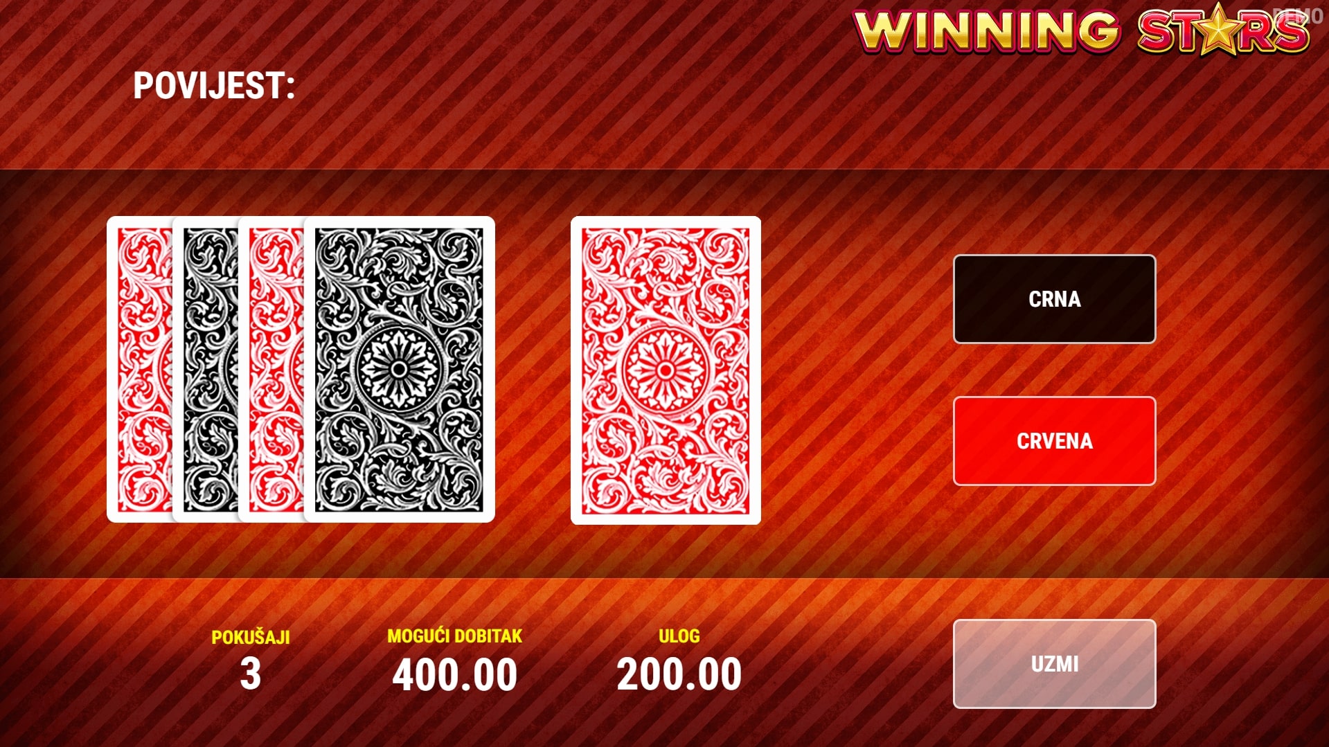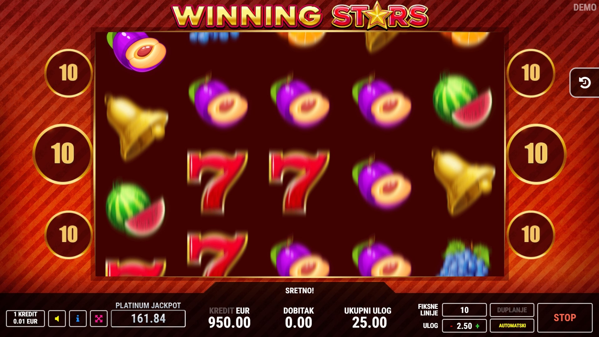 Winning Stars klasična je slot igra koja starijim igrama na sreću daje novi sjaj, miješajući svijet voća s vatrenim dobicima. Najviše vrijede simboli sedmica i zvona te oni osvježavajućeg voća u obliku grožđa i lubenica. Poseban značaj također ima simbol zvijezde koji može djelovati kao zamjena za druge simbole. U slučaju dobitka, igrač ga može pokušati 'poduplati' pogađanjem boje karte okrenute licem prema dolje. Zaigraj Winning Stars te osvoji sočne nagrade!
