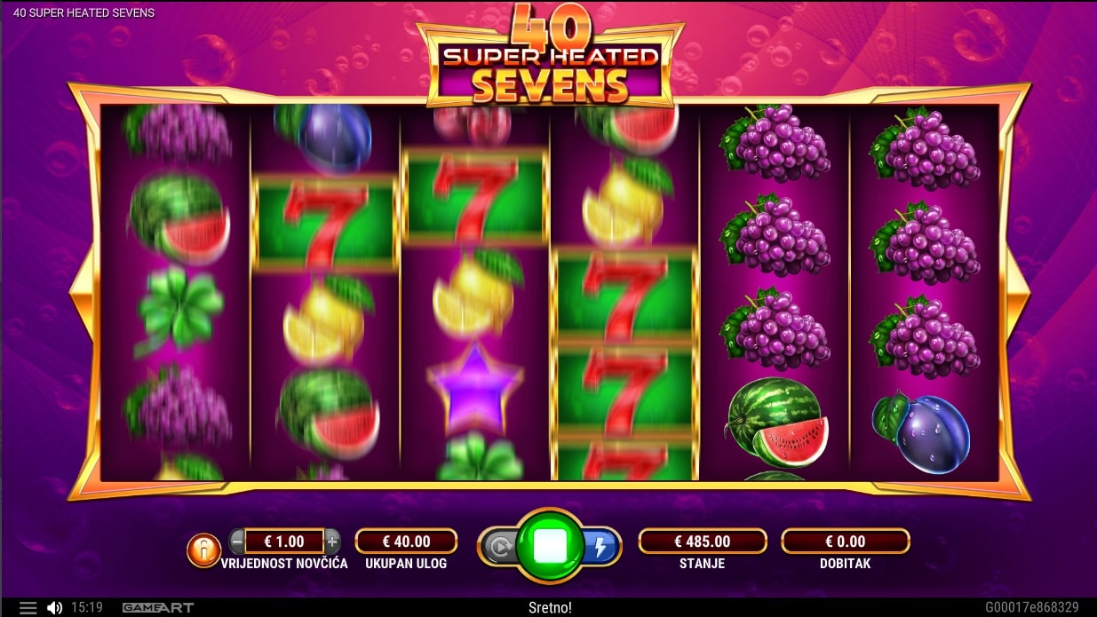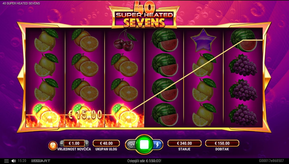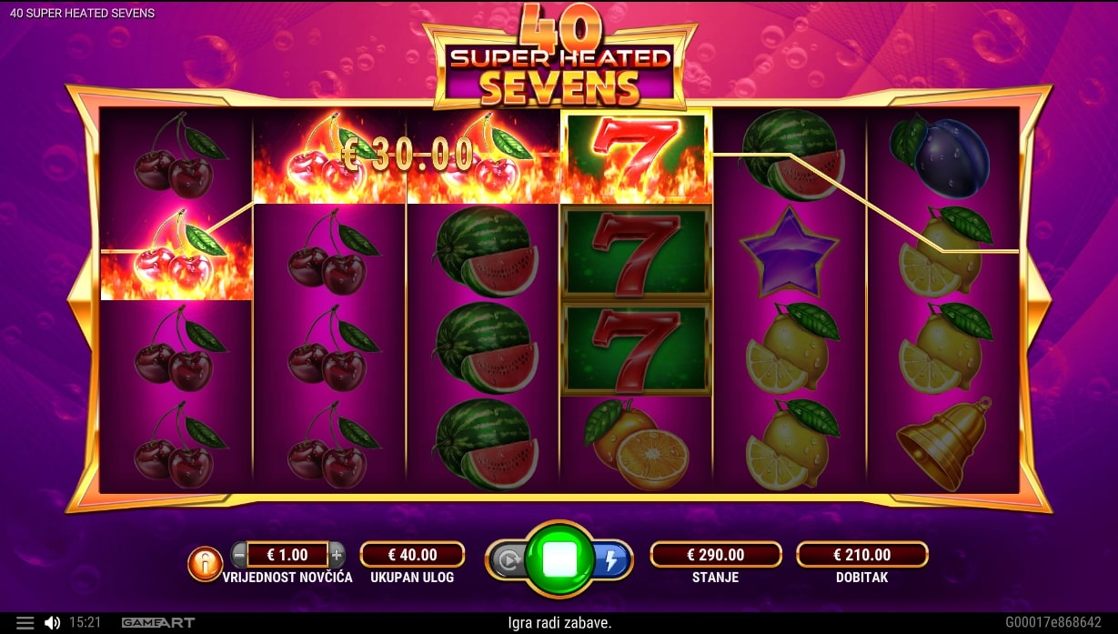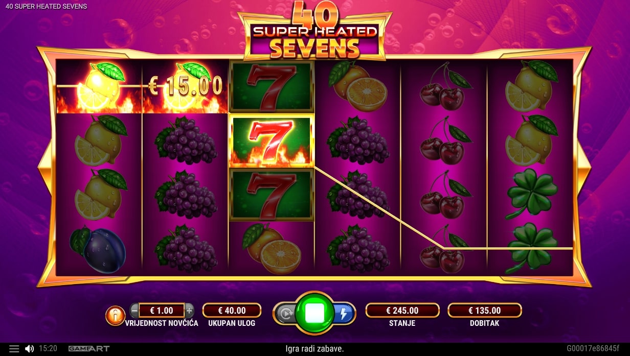 40 Super Heated Sevens slot je igra retro karaktera koja vodi igrača u svijet voća i vatrenih dobitaka. Najviše isplaćuju simboli sinonimni sa srećom kao što su zvona i djeteline s četiri lista, dok dobre dobitke isplaćuju grožđe i lubenice. Igra uz to sadrži simbol sedmice koja može zamijeniti sve simbole osim zvijezde koja isplaćuje dobitke gdje god se nalazila. U slučaju dobitka, igrač ga može pokušati udvostručiti pogađanjem boje karte okrenute licem prema dolje. Zaigraj 40 Super Heated Sevens te osvoji odlične nagrade!