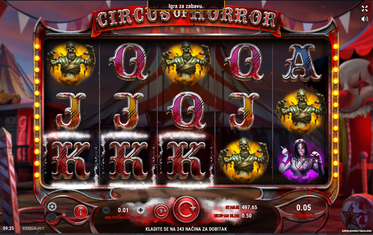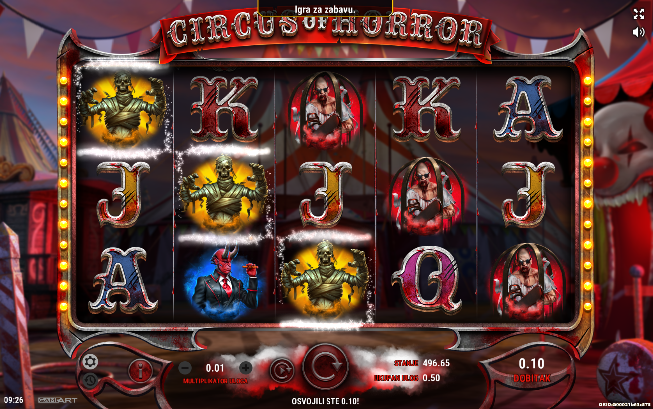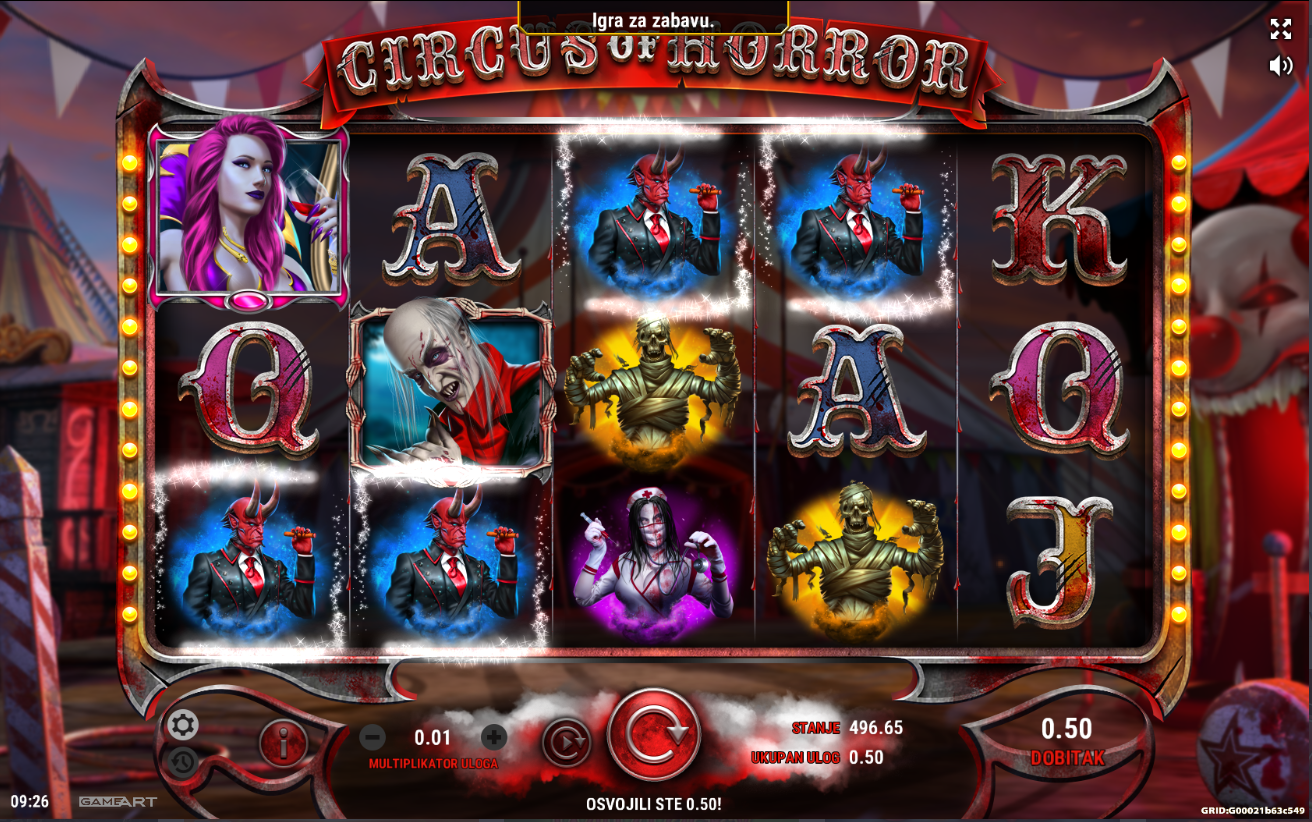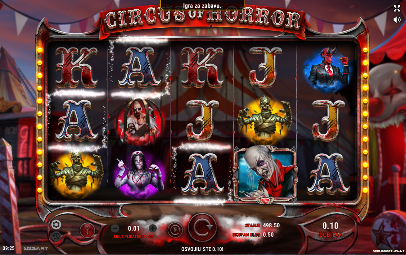 Circus of Horror je slot od GameArt s jezivom temom horora smještenom u mračni cirkus. Igra se na 5 kolona, 3 reda i 243 načina za dobitak. Simboli uključuju klaunove, vampire, zombije i druge sablasne likove. Mračna grafika i zastrašujući efekti stvaraju pravi horor ugođaj.