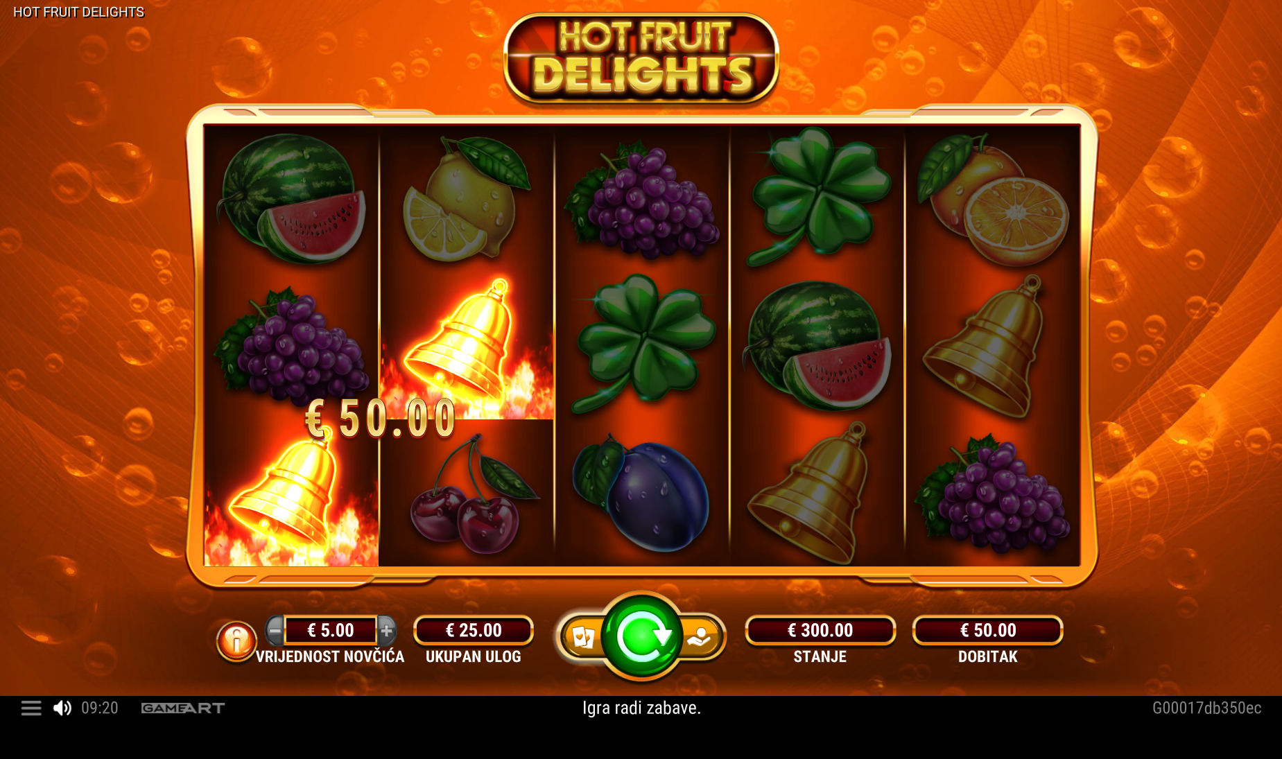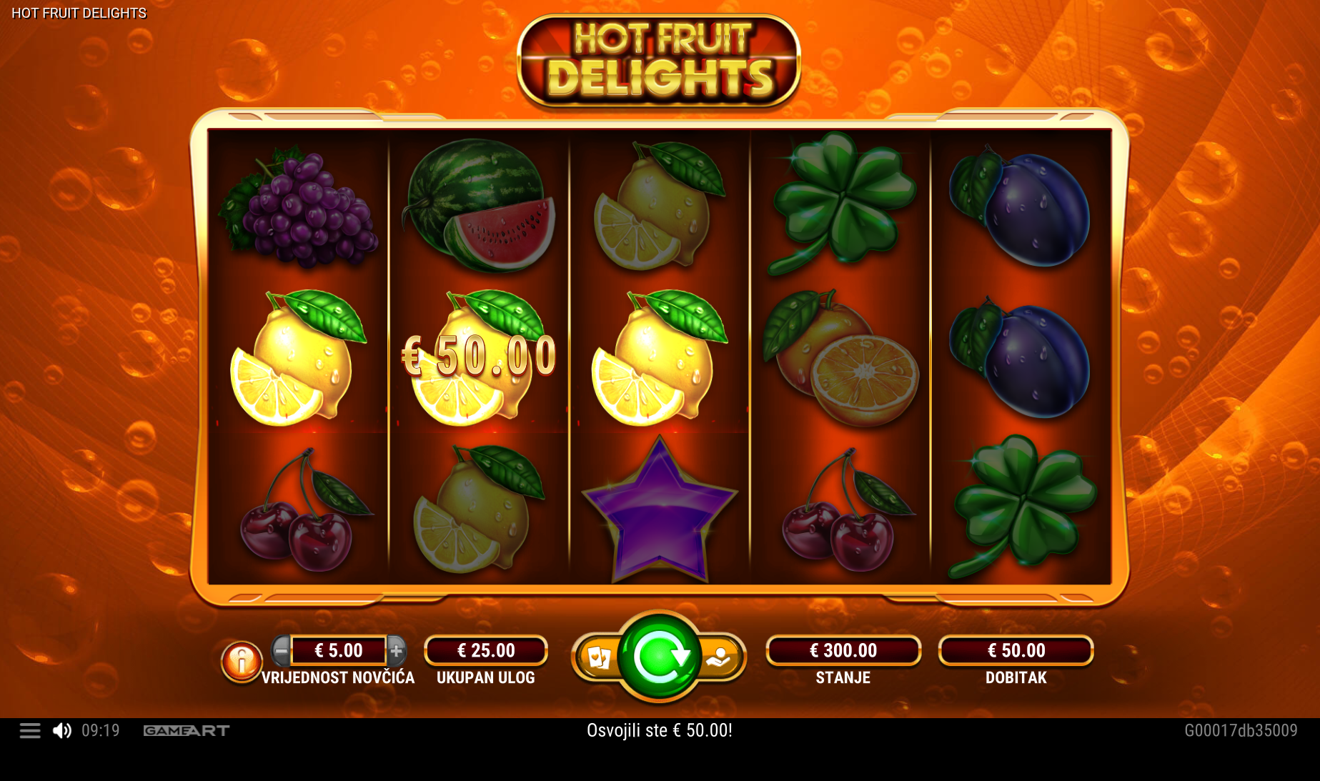 Hot Fruit Delights vodi svoje igrače kroz zabavnu avanturu obogaćenu pažljivo ilustriranim voćnim simbolima uz dodatak zlatnih efekata. Super jednostavan način igranja omogučiti će igračima dugotrajnu zabavu, a kako bi ona također bila i uzbudljiva pobrinuti će se Hot Fruit Delights wild simboli koji će tvoje dobitke pretvoriti u veće i učestalije. Ako voliš igre koje ti pružaju izvrstan omjer rizika i dobitaka došao si na pravo mjesto! Prepusti se zabavi i užitku te sa sobom odnesi velike dobitke!