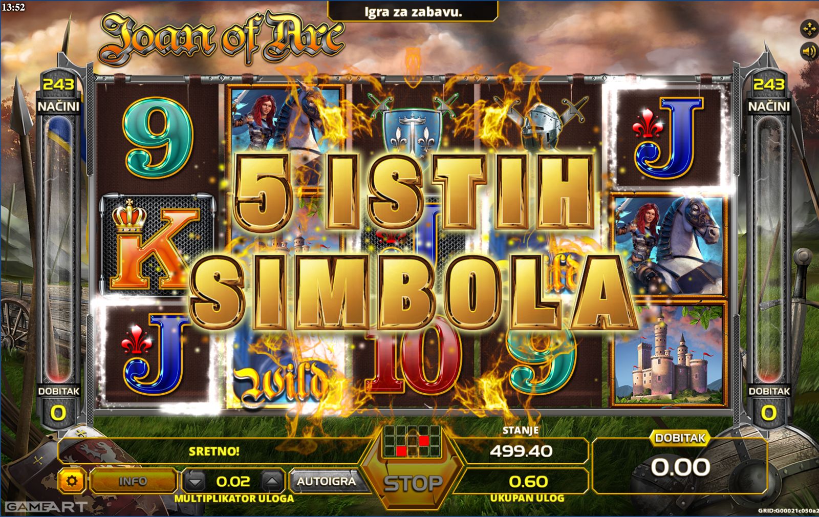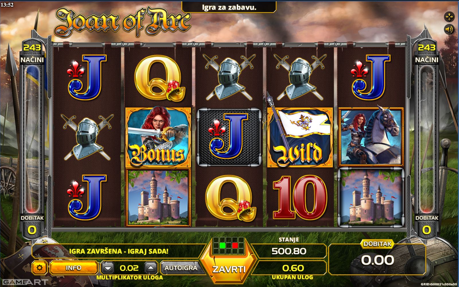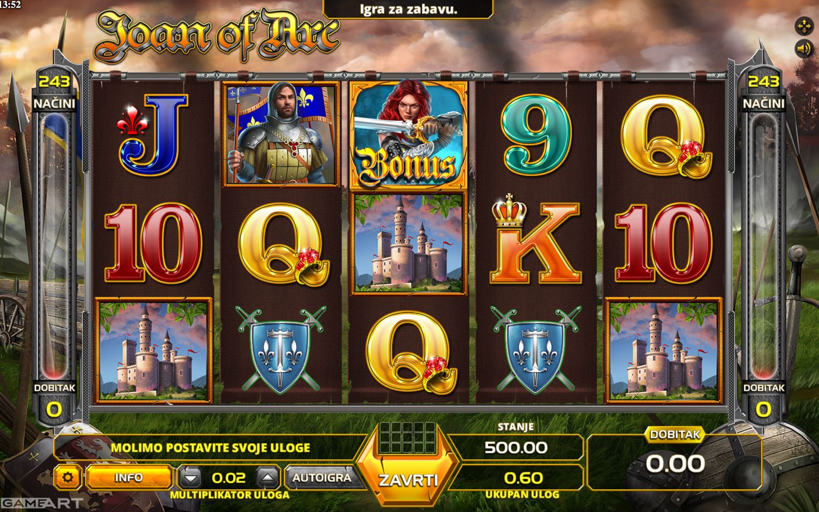Joan of Arc je video slot razvijen od strane GameArt, smješten u srednjovjekovni svijet Francuske. Igra se odvija na 5 kolona i 3 reda, s 243 načina za dobitak. Osnovni cilj je složiti dobitne kombinacije od lijeva prema desnu, koristeći simbole koji se pojavljuju na aktivnim linijama. Igra uključuje značajke poput besplatnih vrtnji, wild simbola, scatter simbola i jedinstvenog Expand & Split sustava.