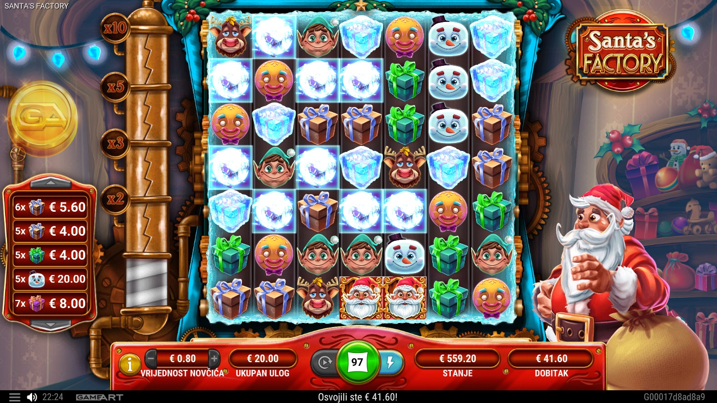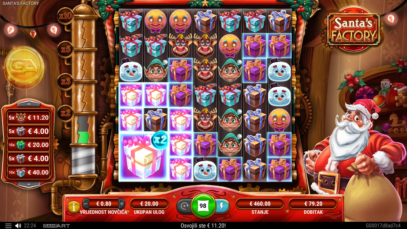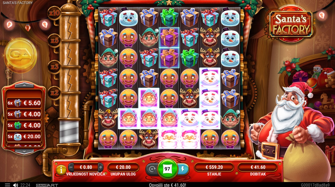 Santa's Factory je slot igra s 7x7 mrežom koja koristi kaskadni sustav isplate. Simboli padaju na valjke, a dobitci se postižu spajanjem 5 ili više simbola u nakupine koje se dodiruju okomito ili vodoravno. Svaka dobitna kombinacija uklanja simbole s valjaka, omogućujući novima da padnu i stvore dodatne šanse za dobitak. Igra je puna iznenađenja, uključujući Santa's Box značajke, supervelike simbole i nasumične darove koji mogu pretvoriti bilo koji trenutak u potencijalni dobitak.