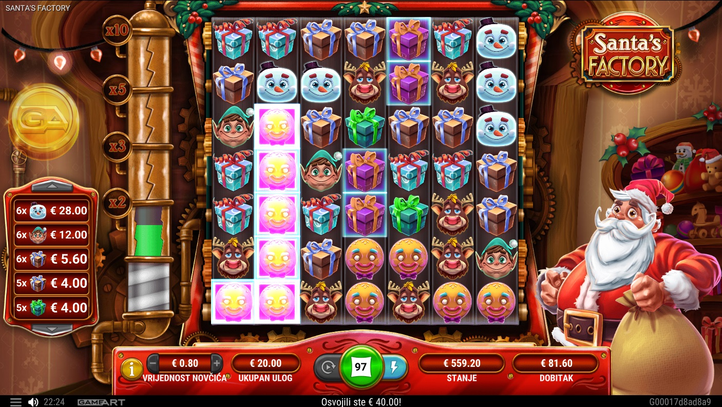 Gameplay u Santa's Factory je uzbudljiv i jednostavan. Tvoj zadatak je spojiti 5 ili više simbola u nakupine kako bi ostvario dobitak. Svaki dobitak puni mjerač Santa's Box, što ti može donijeti dodatne značajke poput eksplozije Wild simbola, uništavanja niskoplaćenih simbola i pretvaranja simbola u Wildove. Ako uspiješ napuniti mjerač do kraja, aktiviraš Santa Bonus koji donosi veliki Wild Santa simbol i dodatne mogućnosti za dobitak. Osim toga, superveliki simboli od 2x2 dimenzije udvostručuju tvoje dobitke kada su dio dobitne kombinacije.