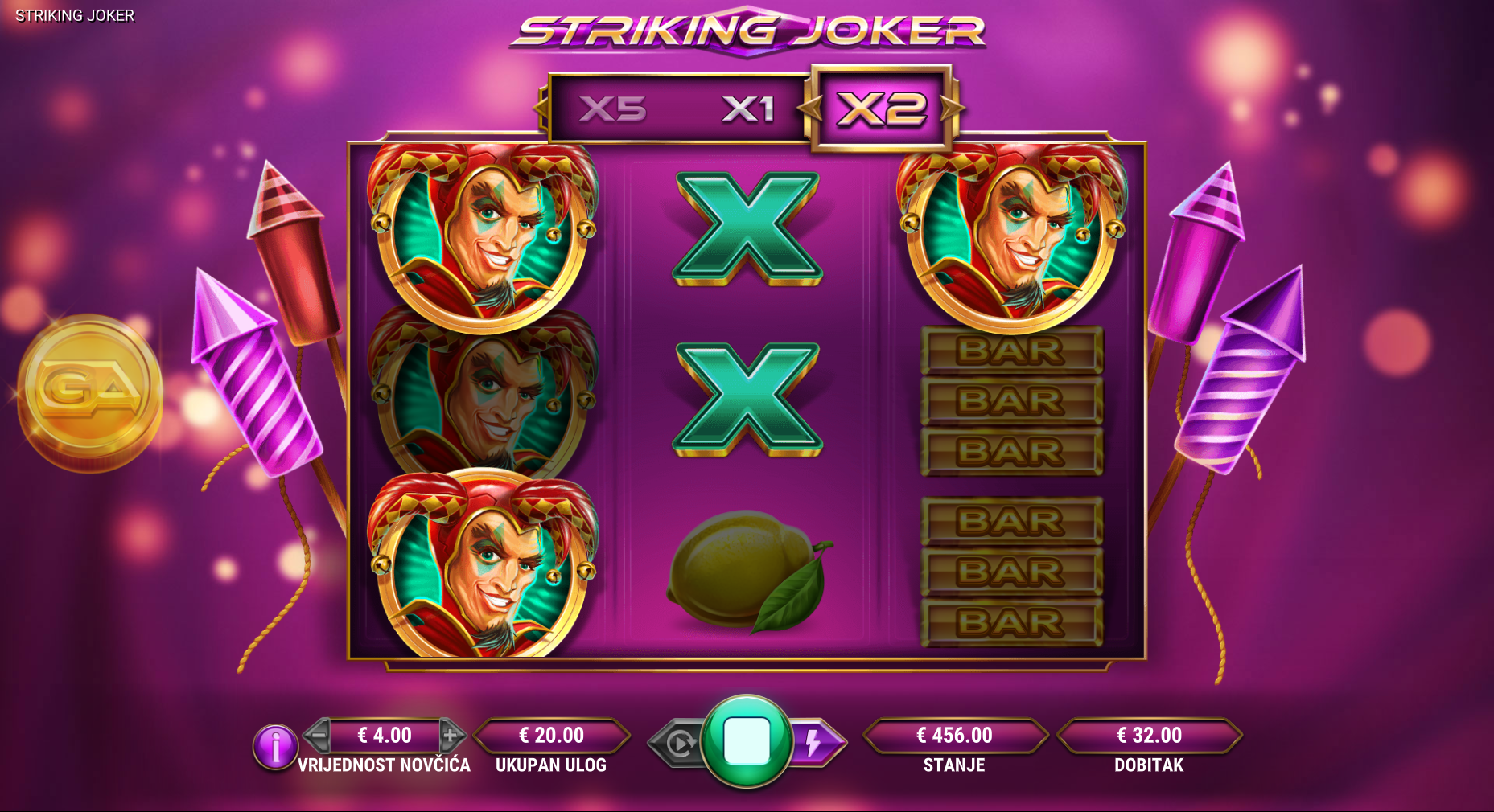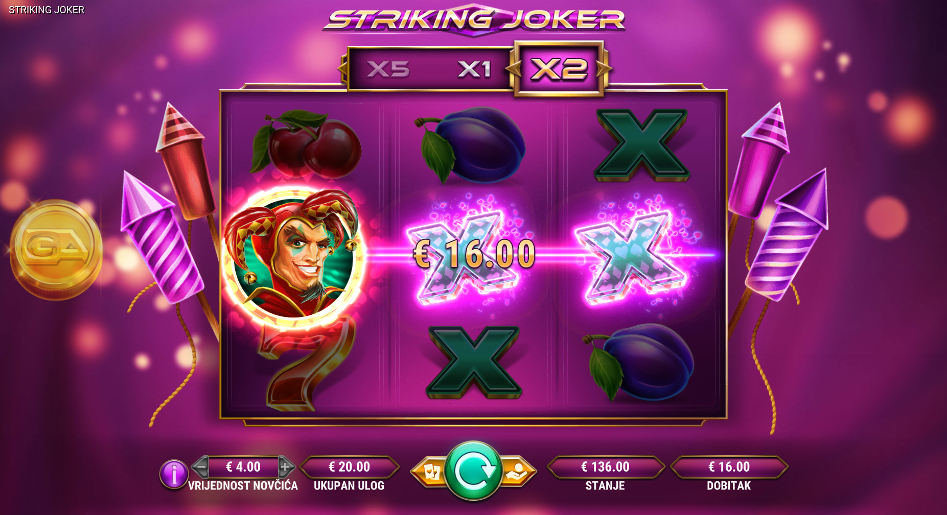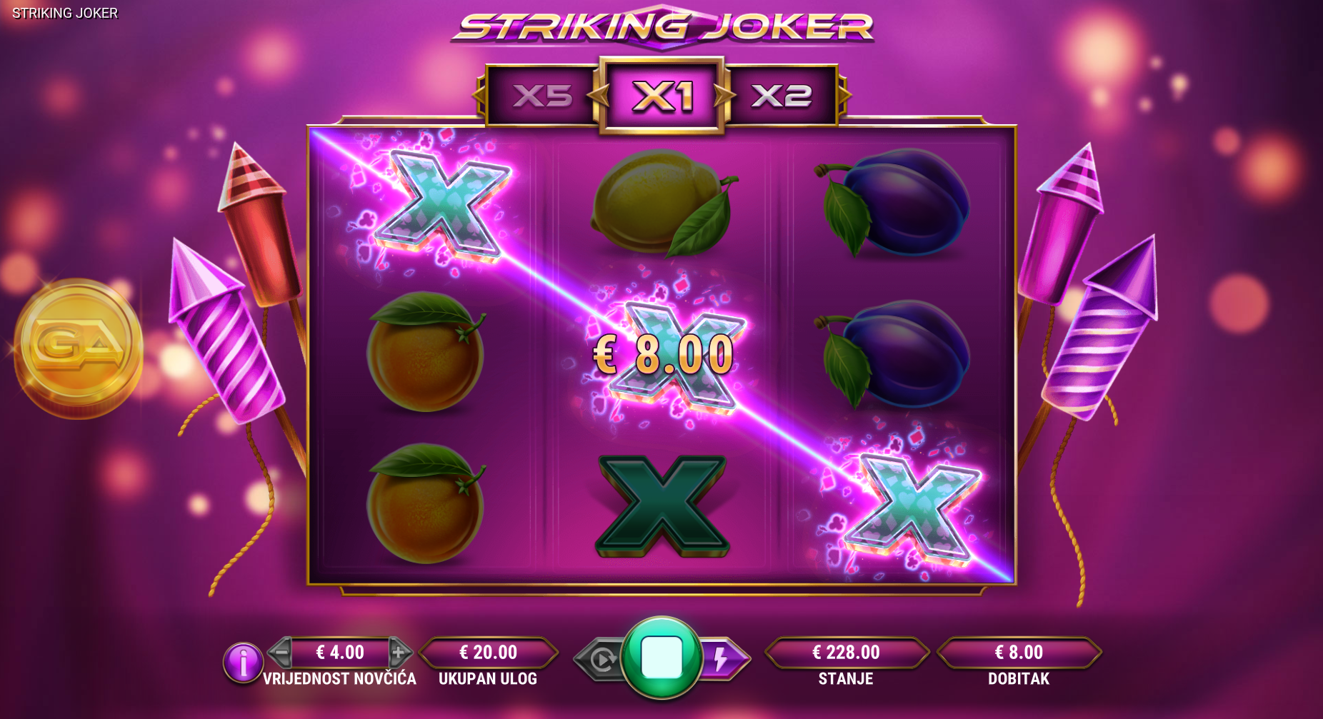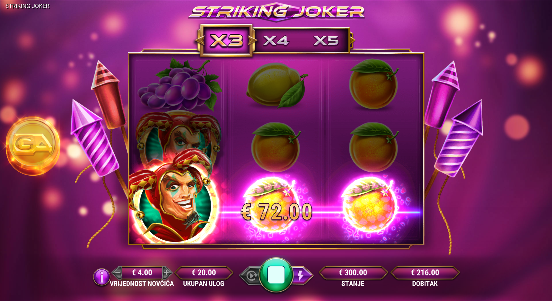 Dobrodošao u Striking Joker, zabavnu avanturu inspiriranu gomilom sočnog voća i tajanstvenih jokera koji će ti uz nezaboravno igranje donjeti i velike dobitke! Primamljivo ilustrirano voće jednostavnog dizajna, kao i način igranja učiniti će dozu zabave i zanimacije nedostižnom! Kako uzbuđenju tu nebi bio kraj, pobrinuti će se joker simbol i igranje pretvoriti u super uzbudljivo te bogato po pitanju dobitaka! Kao jedan od najpopularnijih slotova, Striking Joker odličan je izbor za sve igrače koji vole izvrstan omjer rizika i dobitaka.