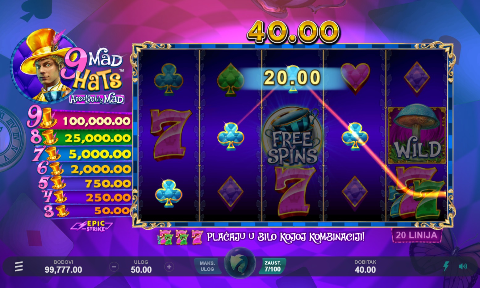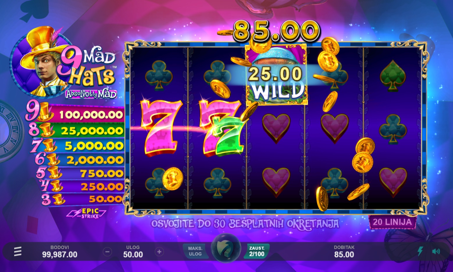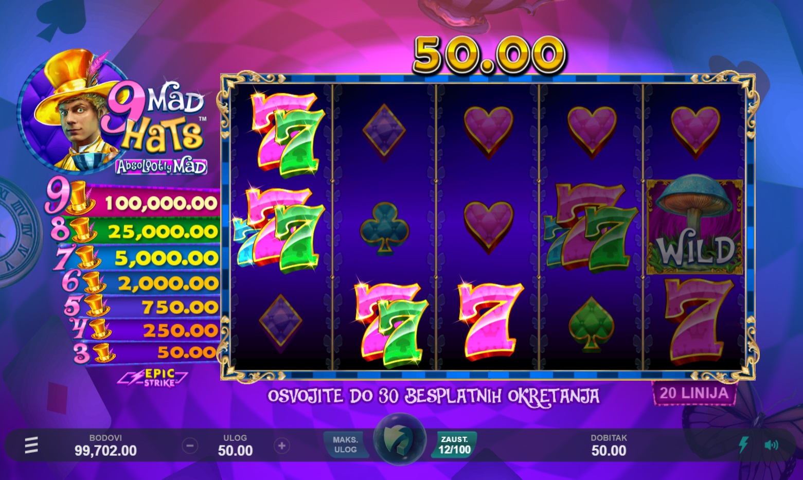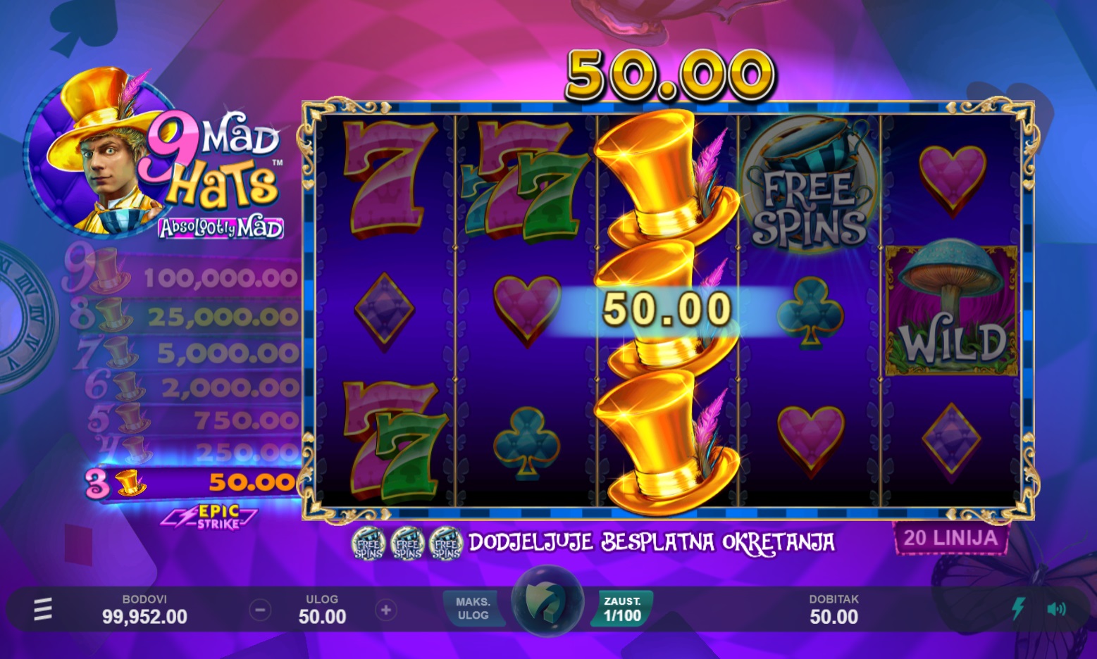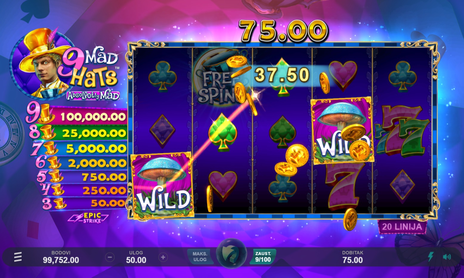 Igra 9 Mad Hats™ pruža dinamičan i zabavan gameplay. S 5 bubnjeva i 20 fiksnih isplatnih linija, lako je pratiti akciju na ekranu. Okretanjem bubnjeva možeš se nadati raznim dobitnim kombinacijama, dok su scatter simboli ključ za pokretanje besplatnih okretaja i Epic Strike™ bonusa. Također, Zamjenski simboli pomažu u stvaranju više dobitnih kombinacija, čineći igru još uzbudljivijom. Kolo Besplatnih okretanja nudi mogućnost osvajanja dodatnih besplatnih okretaja i multiplikatora, što povećava šanse za veće dobitke.