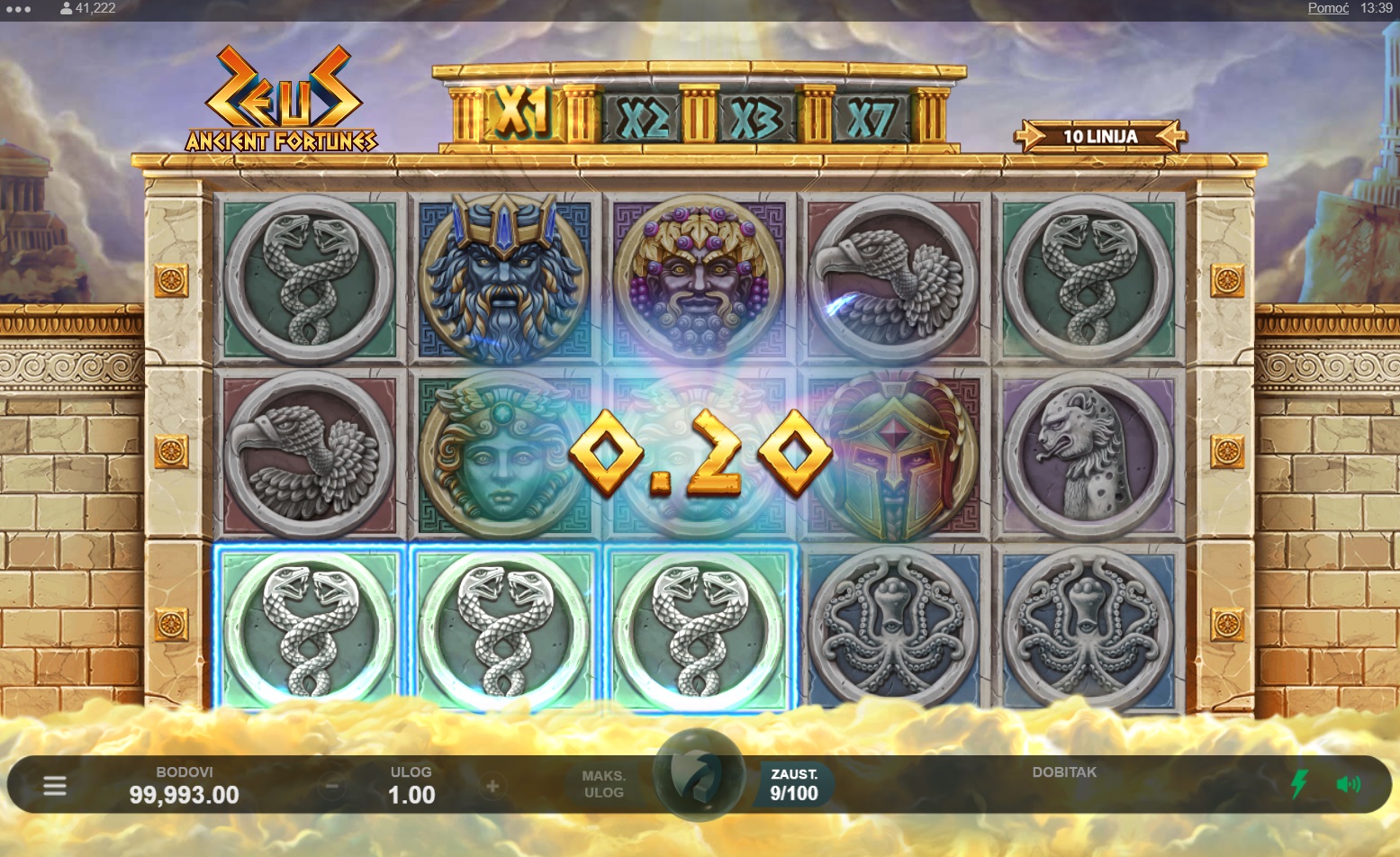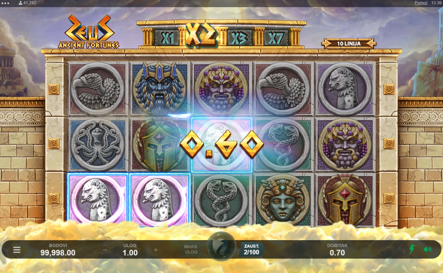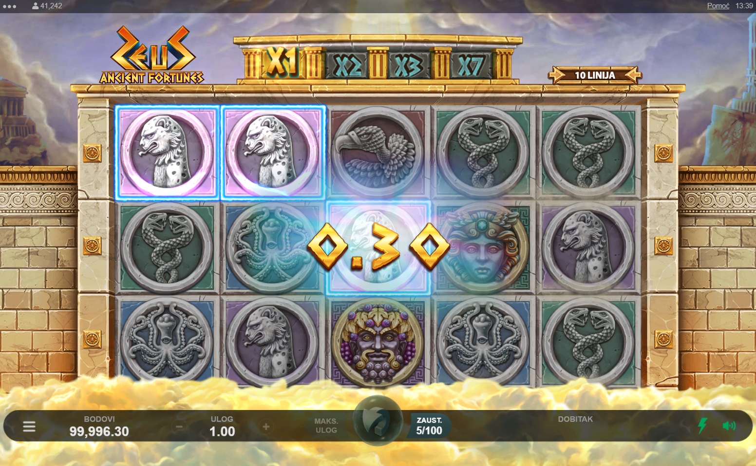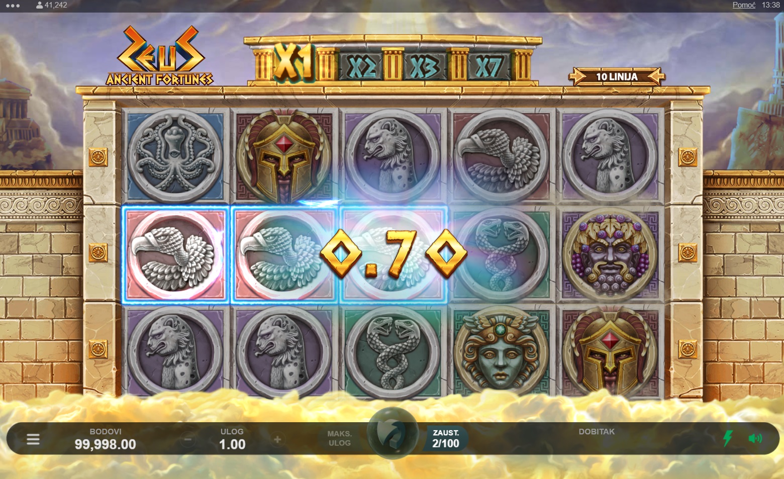 Ancient Fortunes: Zeus vodi te u svijet drevne grčke mitologije, gdje ćeš se susresti s bogovima i epskim simbolima na pet bubnjeva i deset isplatnih linija. U ovoj slot igri uživat ćeš u jedinstvenim značajkama poput Rolling Reels™ i besplatnih okretanja, koje ti pružaju dodatne šanse za dobitak. Zahvaljujući bogatom vizualnom doživljaju i uzbudljivoj glazbi, Ancient Fortunes: Zeus stvara atmosferu koja te potpuno uvlači u igru. Istraži moćne značajke i osvoji nevjerojatne nagrade uz svaki spin!