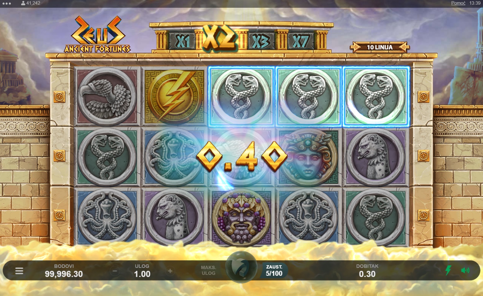 Ancient Fortunes: Zeus ima RTP od 96,02%, što je standardno za ovakvu vrstu slot igara i nudi dobre šanse za dobitak. Volatilnost je srednja, što znači da možeš očekivati česte, ali manje dobitke. Ova igra je savršena za igrače koji vole balans između rizika i nagrada.