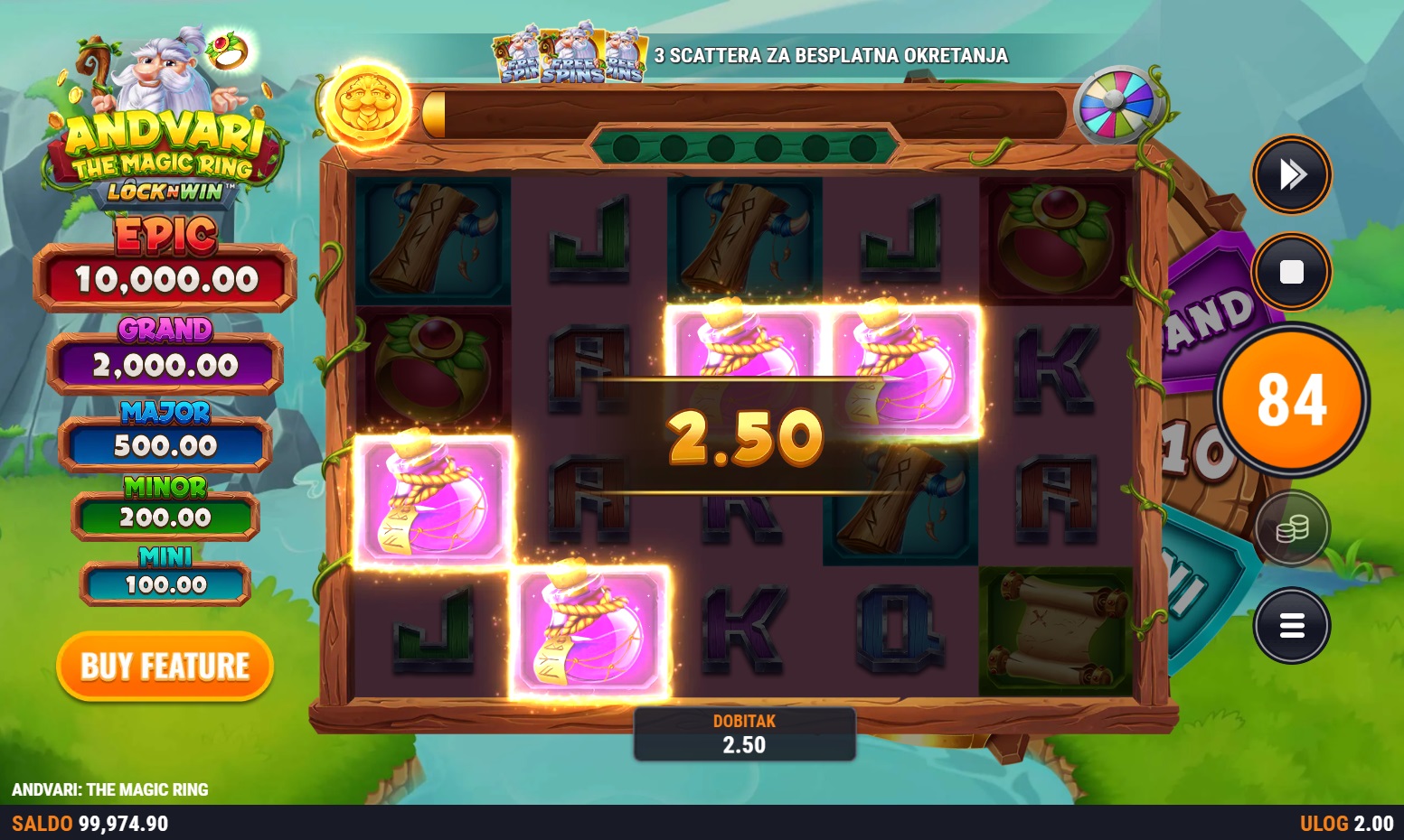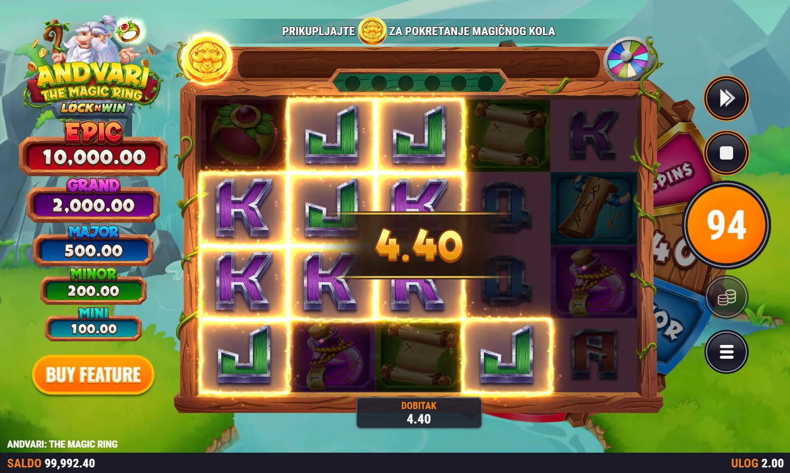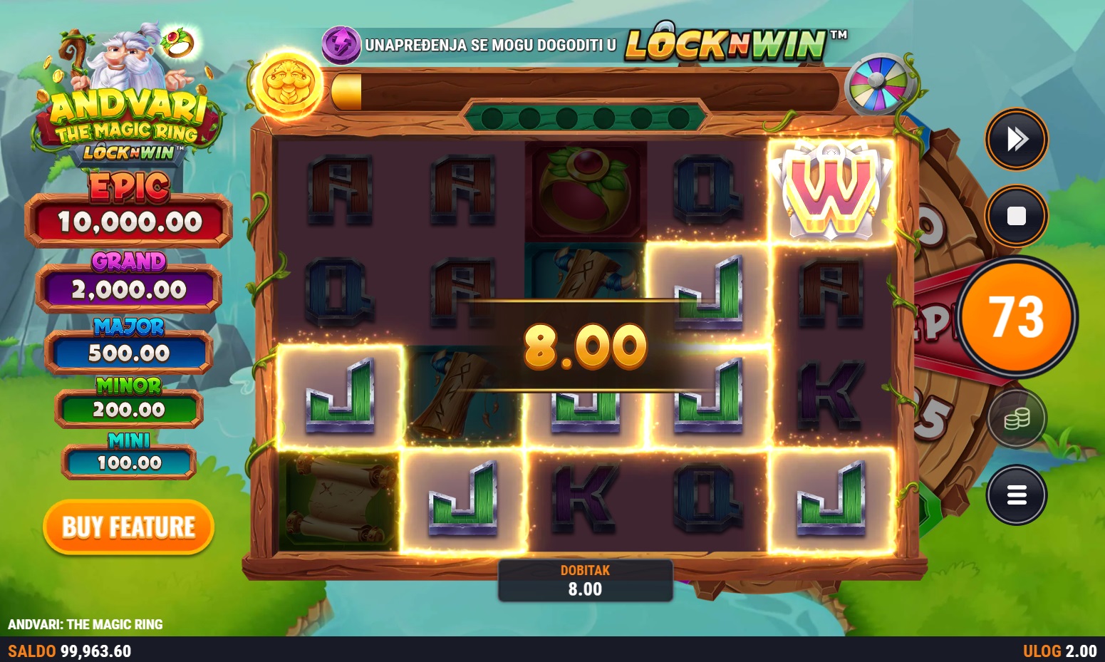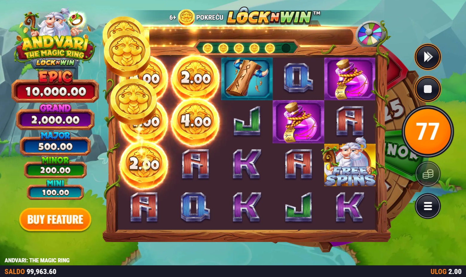 Andvari The Magic Ring je uzbudljiva video slot igra s 5 bubnjeva i 4 reda, koja ti omogućava da istražuješ magični svijet ispunjen brojnim nagradama i bonusima. Igra nudi 1024 načina za dobitak, što znači da svako okretanje pruža različite mogućnosti za osvajanje. U ovoj igri, tvoje je da okreneš bubnjeve i pronađeš dobitne kombinacije simbola koji ti mogu donijeti vrijedne isplate. Igra uključuje Magične nagrade poput Epic, Grand, Major, Minor i Mini nagrada koje ti mogu povećati ulog čak do 5000 puta.