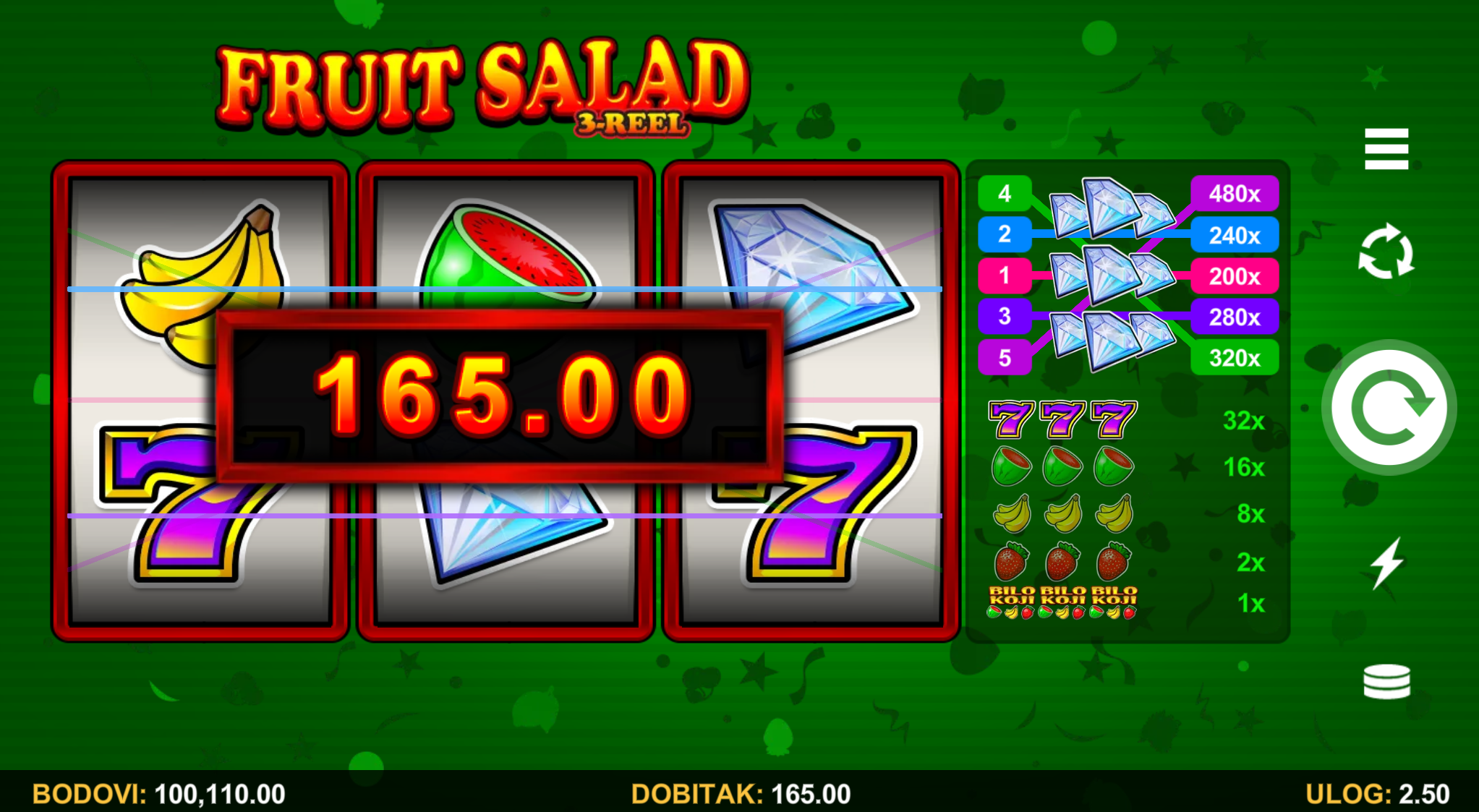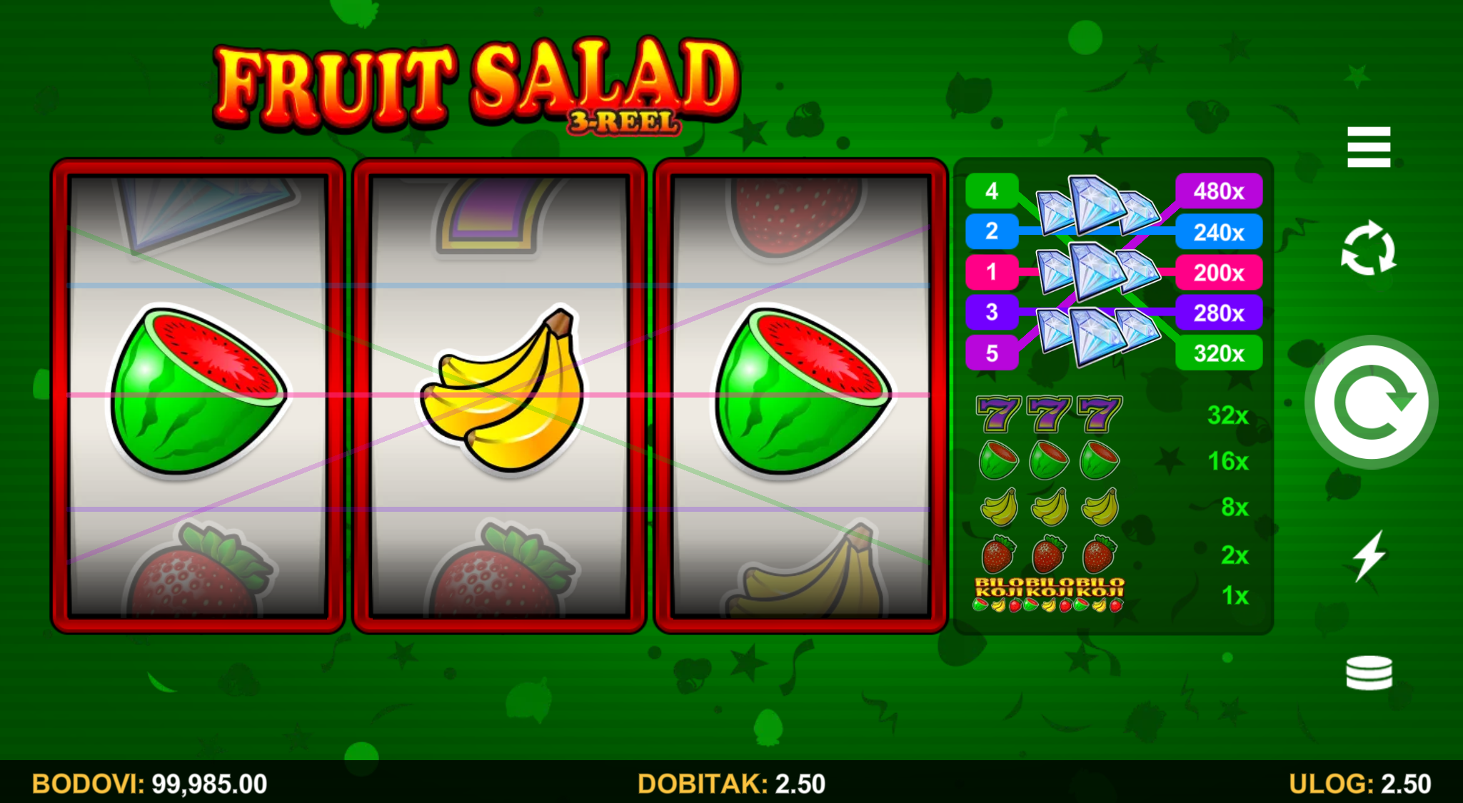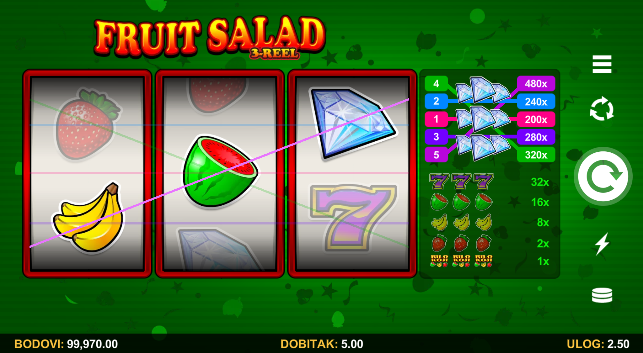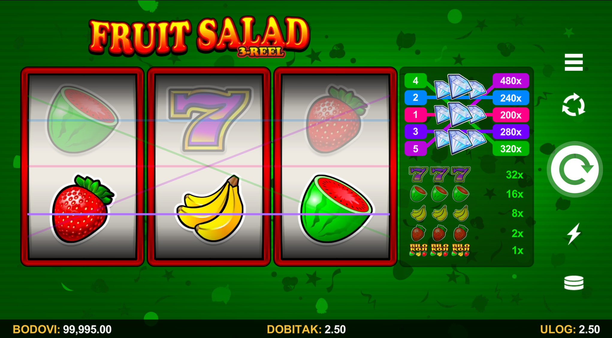 Fruit Salad 3-Reel vodi svoje igrače kroz zabavnu avanturu obogaćenu pažljivo ilustriranim voćnim simbolima uz dodatak zlatnih efekata. Super jednostavan način igranja omogučiti će igračima dugotrajnu zabavu, a kako bi ona također bila i uzbudljiva pobrinuti će se Fruit Salad 3-Reel wild simboli koji će tvoje dobitke pretvoriti u veće i učestalije. Ako voliš igre koje ti pružaju izvrstan omjer rizika i dobitaka došao si na pravo mjesto! Prepusti se zabavi i užitku te sa sobom odnesi velike dobitke!