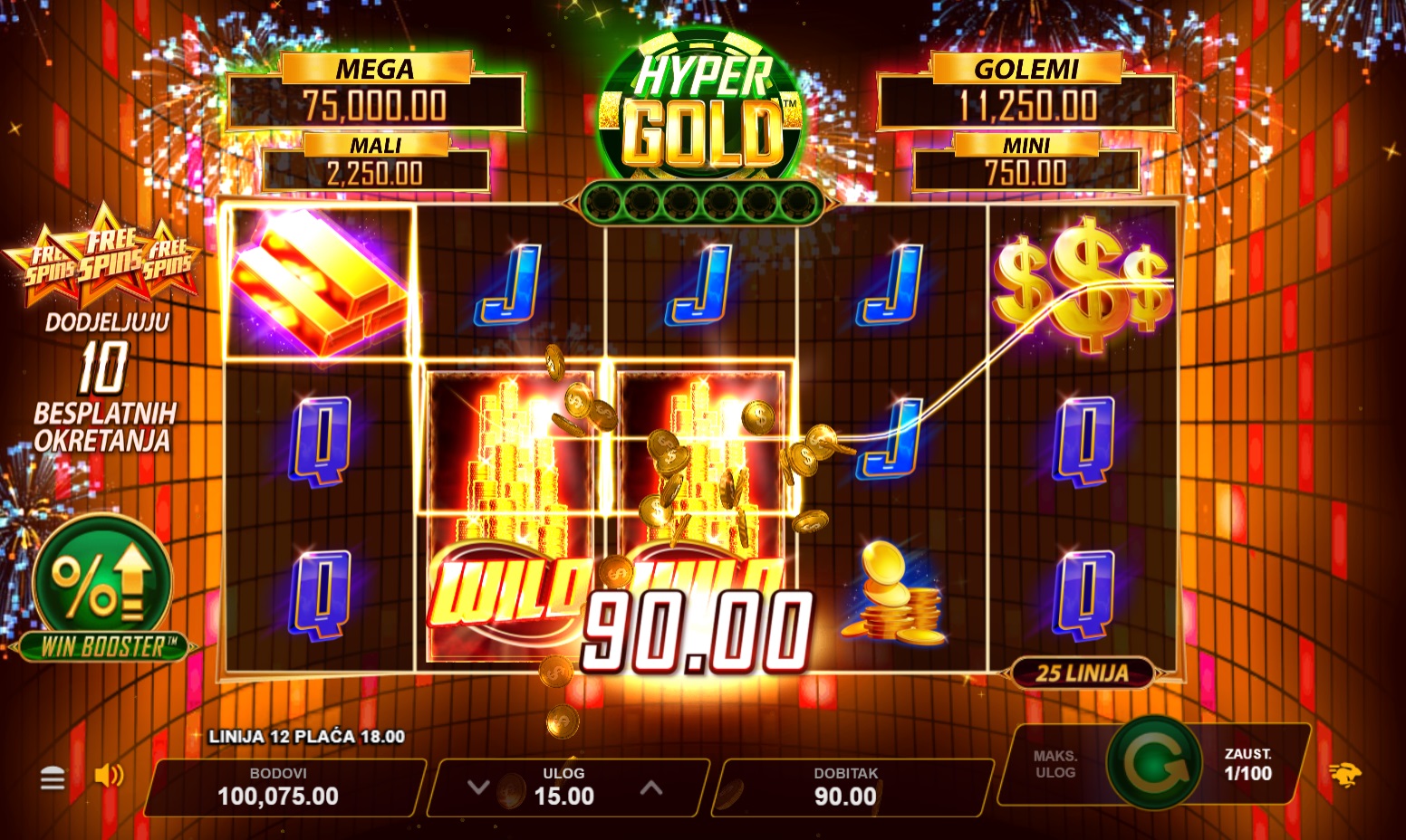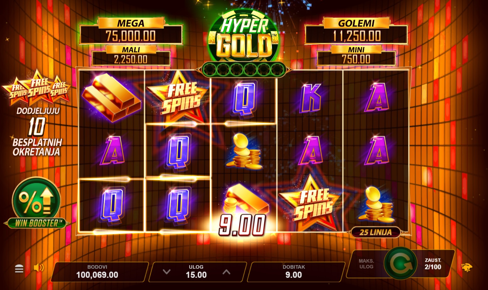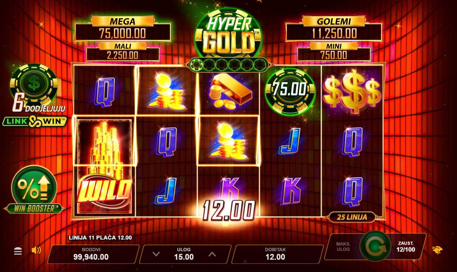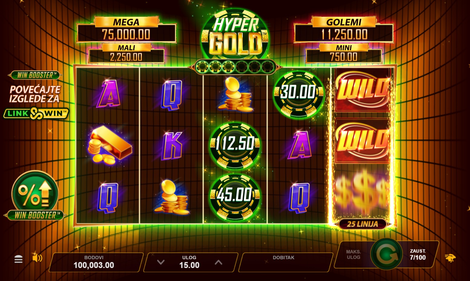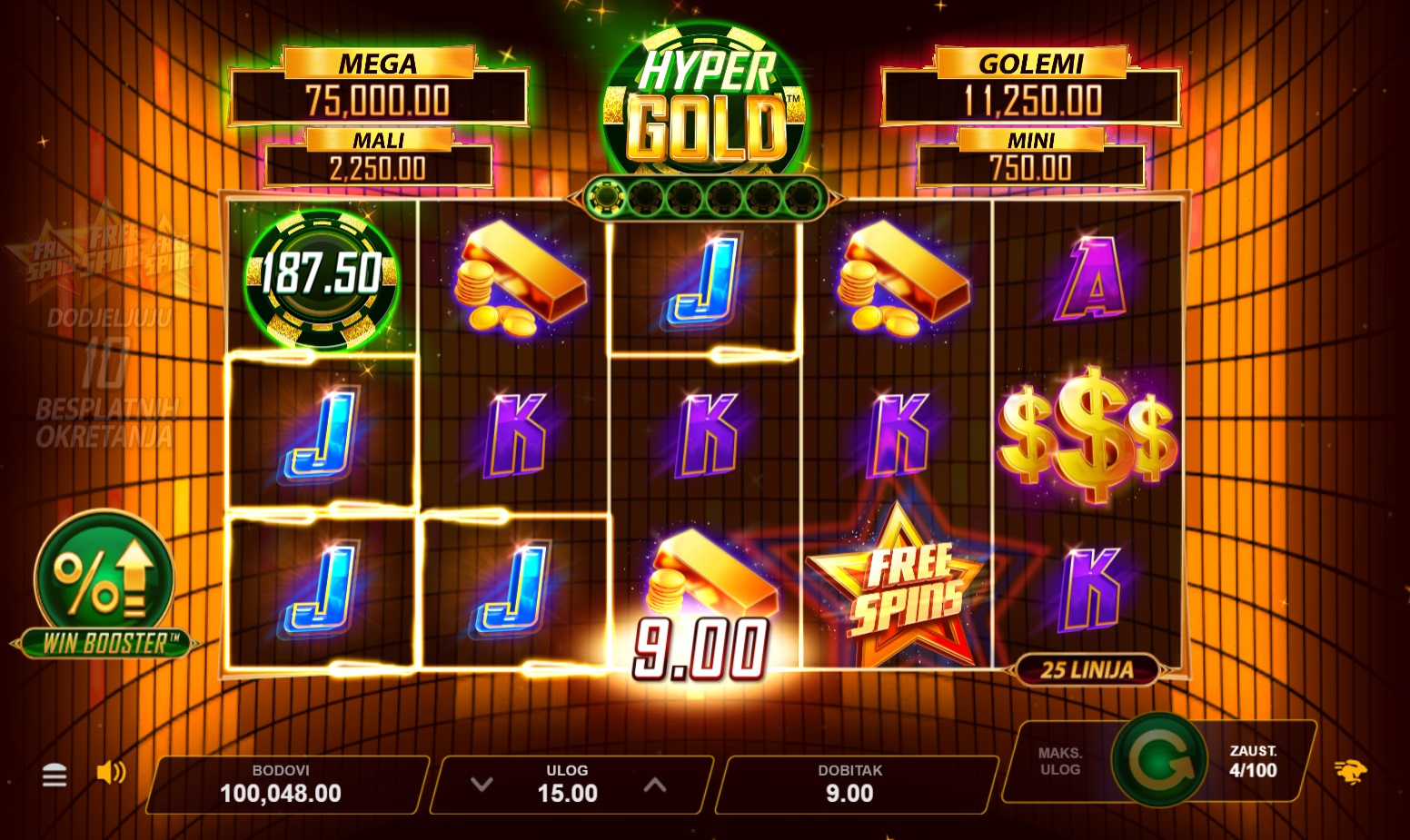 Igra Hyper Gold nudi jednostavan, ali uzbudljiv gameplay. S 25 fiksnih isplatnih linija, dobici se ostvaruju slijeva nadesno, počevši od prvog bubnja. Scatter simboli aktiviraju 10 besplatnih okretanja, a središnji bubnjevi se spajaju u 3 x 3 Jumbo blok koji može donijeti dodatne nagrade. Posebna značajka Link&Win™ se pokreće kada se prikaže 6 ili više odgovarajućih simbola, zaključavajući ih na mjestu i pružajući ti priliku za osvajanje Jackpota. Win Booster™ može dodatno pojačati tvoje šanse za aktivaciju ove značajke.