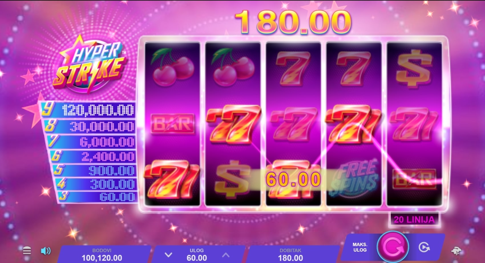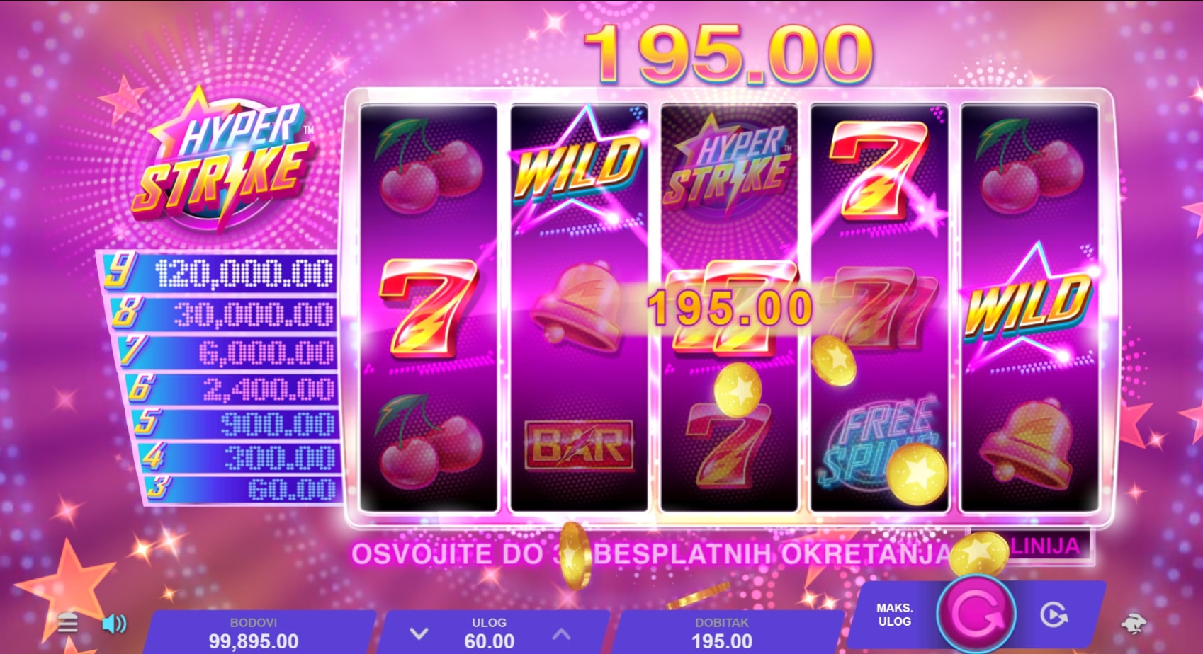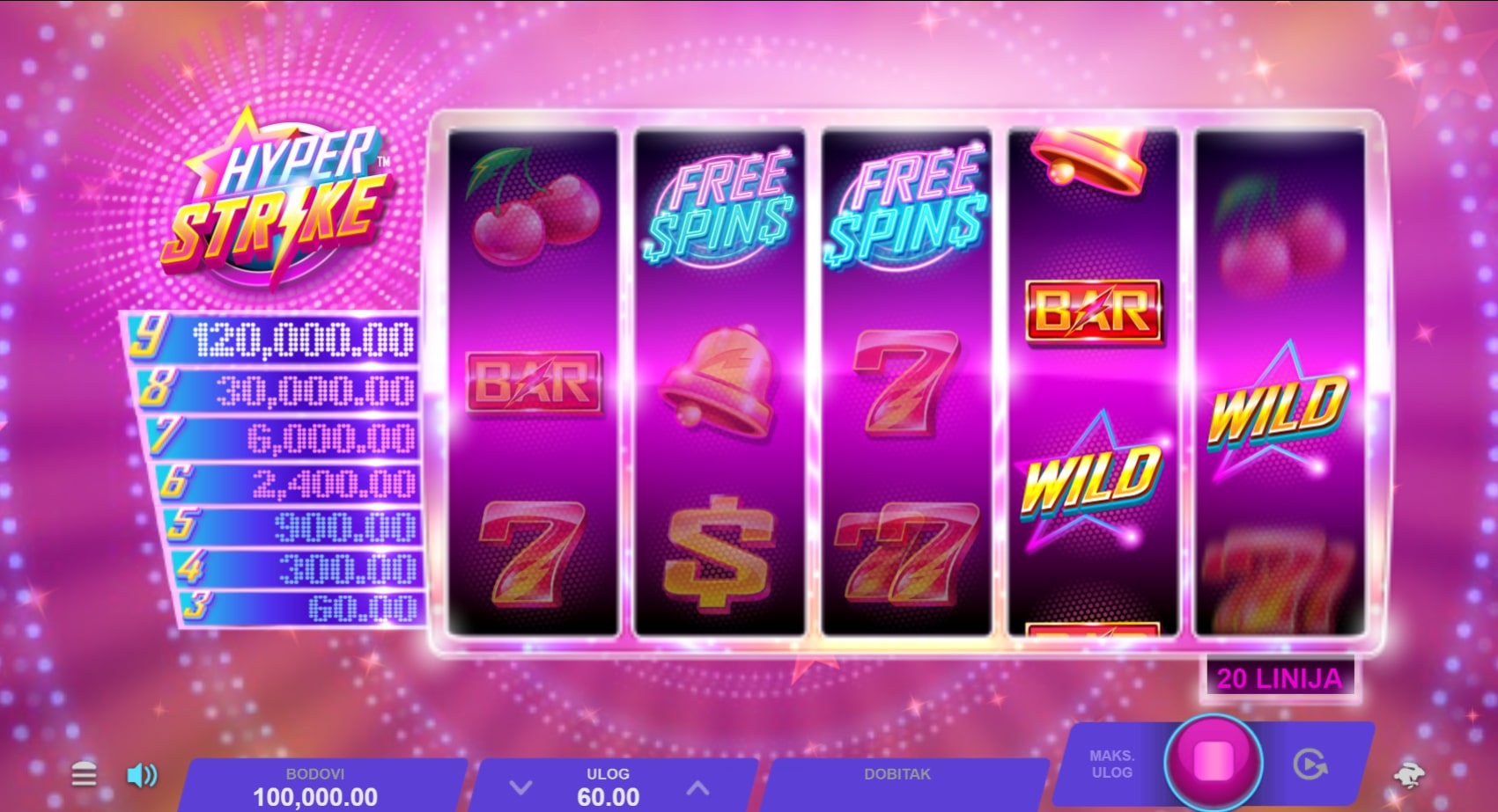 Hyper Strike slot je igra klasičnog karaktera koja vodi igrača u svijet voća i vrhunskih nagrada. Najviše isplaćuju kombinacije različitog broja sedmica, dok Wild zvijezda pomaže u stvaranju dobitaka zamjenom drugih simbola. Igra uz to sadrži dva Scattera koja isplaćuju dobitke bez obzira gdje se nalaze, ali i mogu odvesti igrača do besplatnih vrtnji. Zaigraj Hyper Strike te osvoji osvježavajuće nagrade!