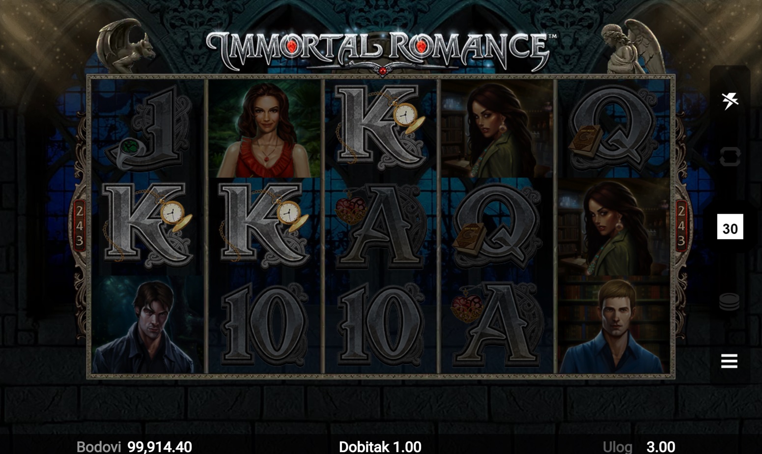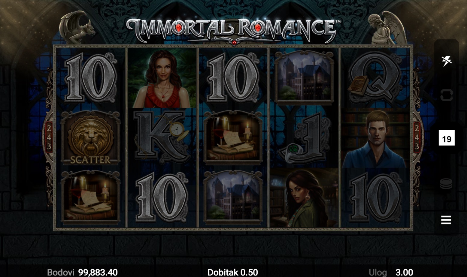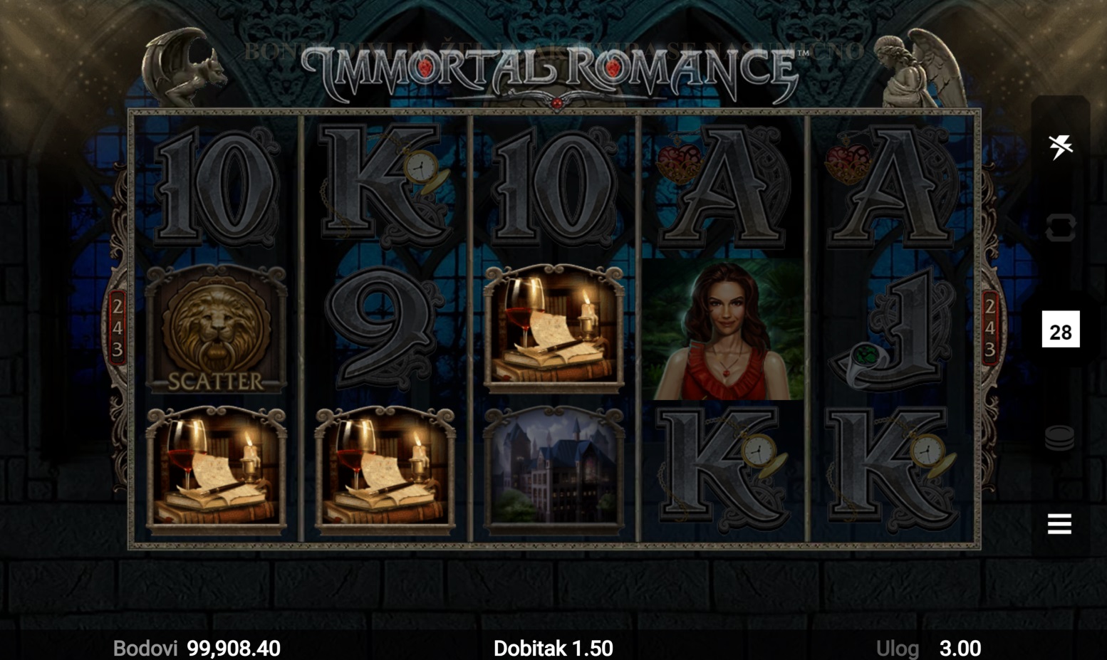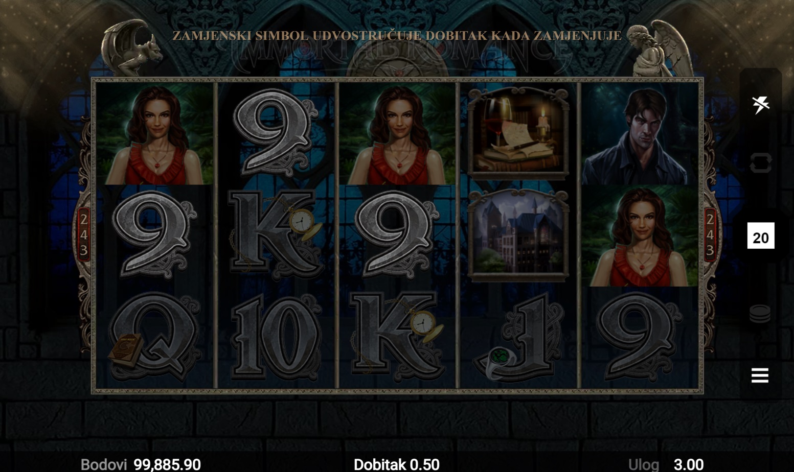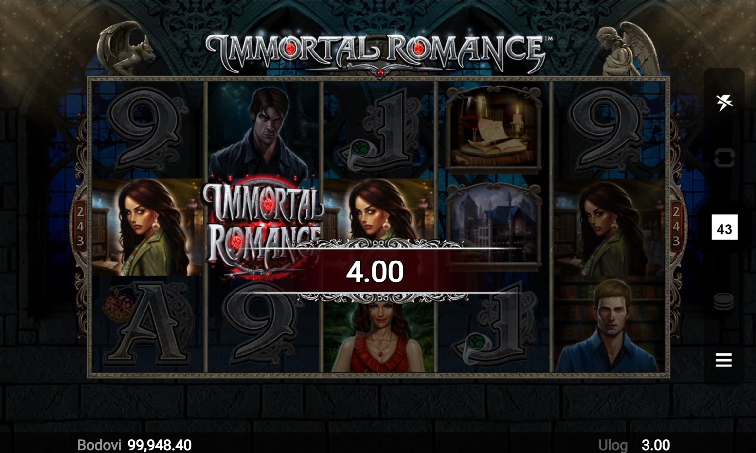 U igri Immortal Romance Remastered, uživat ćeš u raznolikim bonusima i šarenim simbolima. Ova igra na video automatu s 5 bubnjeva i 3 reda nudi čak 243 načina za dobitak. Cilj je okretanjem bubnjeva formirati dobitne kombinacije simbola. Svi redovni simboli, zamjenski množitelji i scatter simboli dodaju uzbuđenje i povećavaju tvoje šanse za dobitak. Igra također sadrži bonus igre poput Wild Desire i Dvorane okretanja, koje donose dodatne besplatne okretaje i specijalne značajke. Iskoristi priliku za osvajanje velikih nagrada i uživaj u bogatoj grafici i zvuku koji te uvlače u svijet besmrtne romanse!