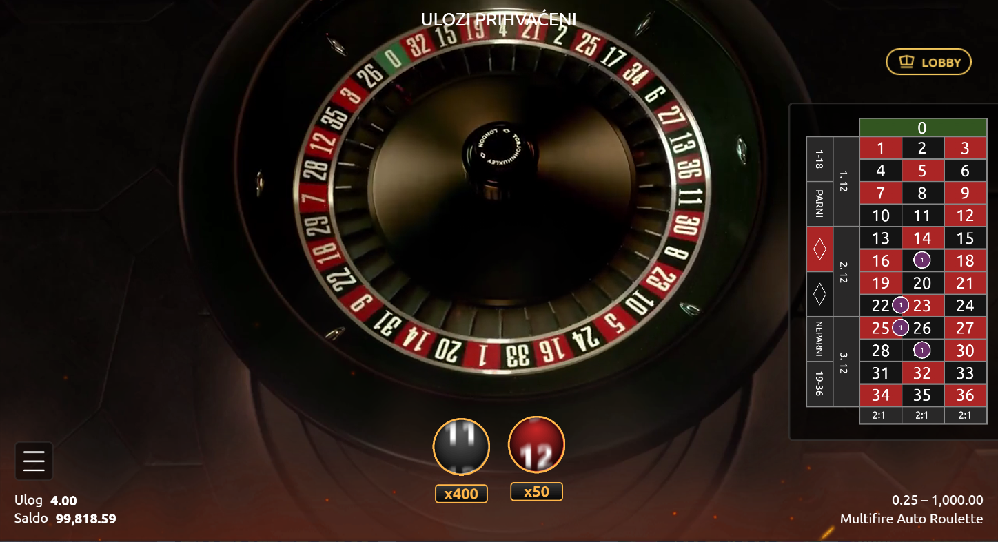 4. Koji su minimalni i maksimalni ulozi u igri Multifire Auto Roulette?