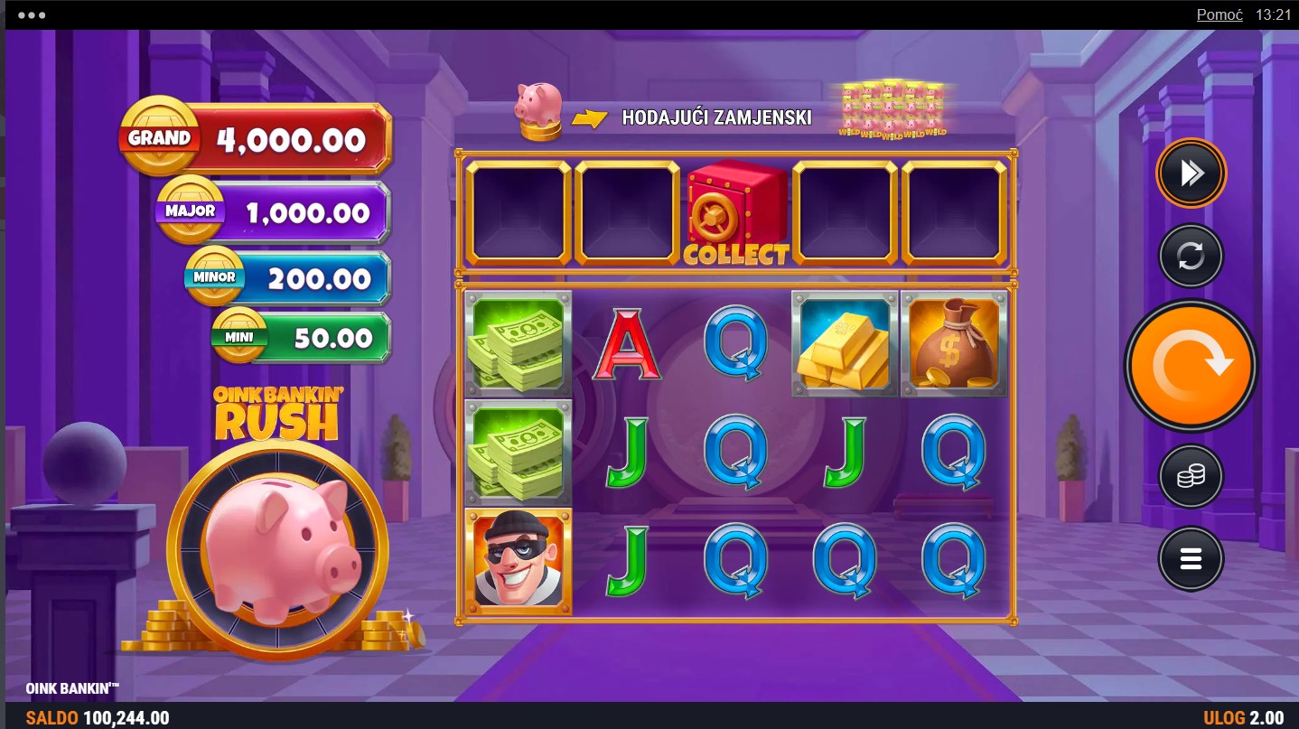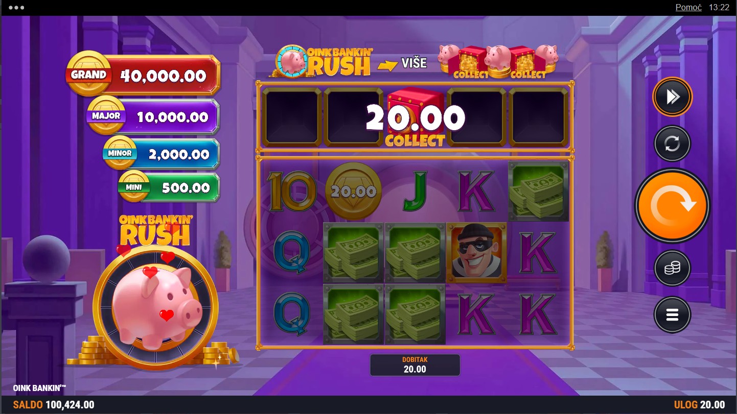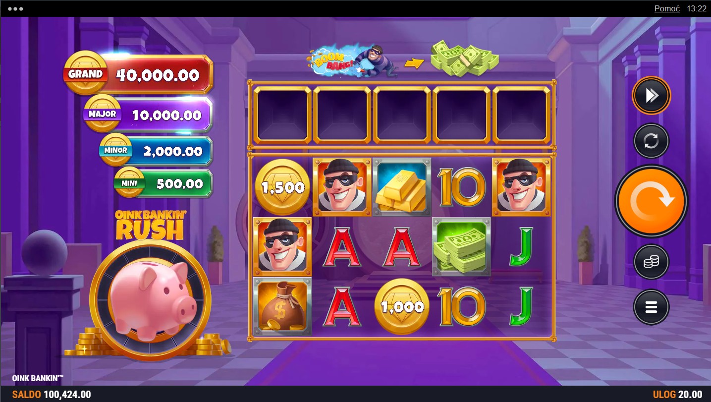 Zakorači u kaotični, ali šarmantni svijet Oink Bankin, slot igre s 5 bubnjeva i 3 reda, gdje se svaki spin može pretvoriti u pravu novčanu eksploziju. S 20 fiksnih isplatnih linija i dodatnim bubnjem iznad glavnih koluta, ova igra providera Games Globalkombinira klasični slot doživljaj s modernim značajkama koje donose velike nagrade i neočekivane preokrete. U igri će te oduševiti Prikupljanje kovanica, gdje simboli na dodatnom bubnju dodjeljuju novčane nagrade i Jackpotove do 2000x uloga. Tu su i uzbudljive značajke poput Boom Bang!, u kojoj pljačkaš detonira dinamite i nasumično miješa bubnjeve za stvaranje dobitnih kombinacija, te Hodajući zamjenski, gdje Oink simboli pretvaraju cijeli bubanj u zamjenske simbole koji se pomiču ulijevo i množe dobitke do 5x. Najveća zabava dolazi s Oink Bankin’ Rush, gdje prikupljanjem 12 Oink simbola na dodatnom bubnju pokrećeš posebno razdoblje povećanih mogućnosti za prikupljanje kovanica i više Hodajućih zamjenskih simbola, dok ukupni dobitci rastu uz svaki spin. Oink Bankin nudi brzu, kaotičnu i uzbudljivu igru koja spaja humor, akciju i velike nagrade u svinjski zabavnoj slot avanturi!