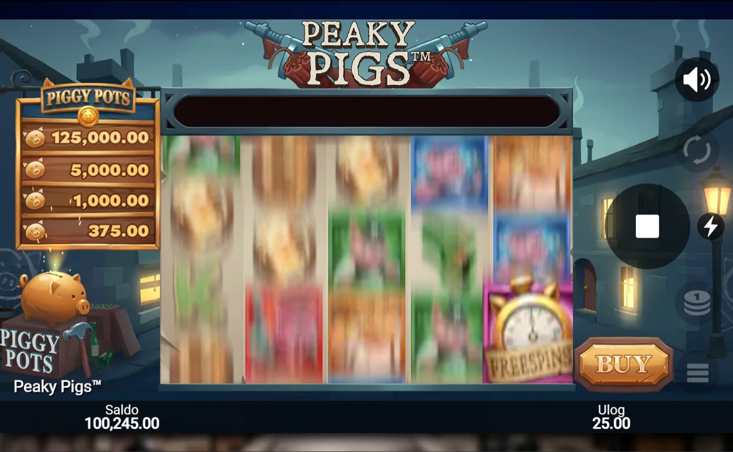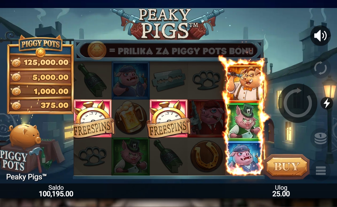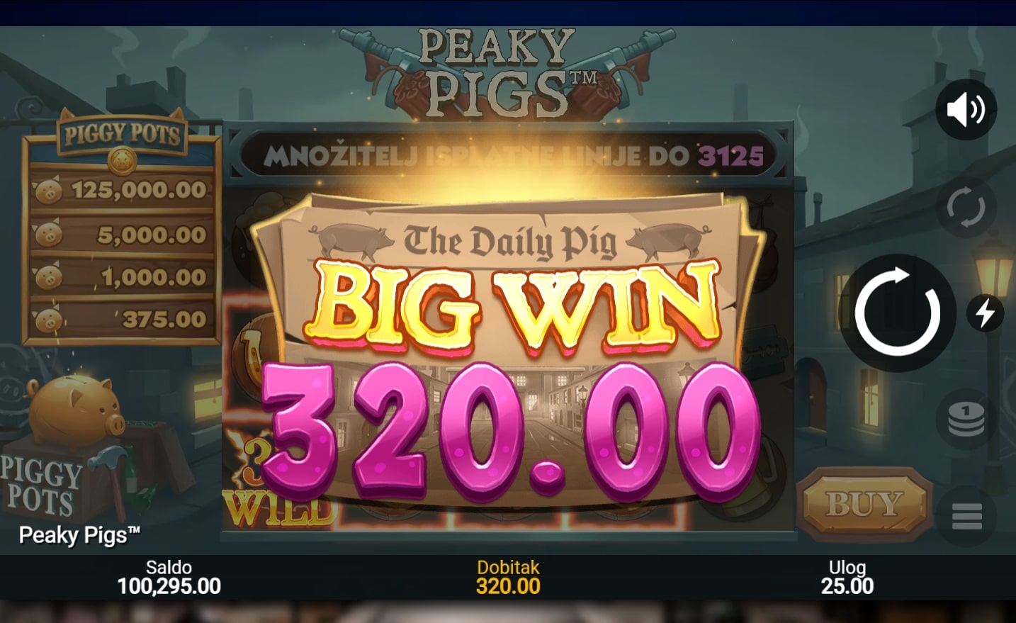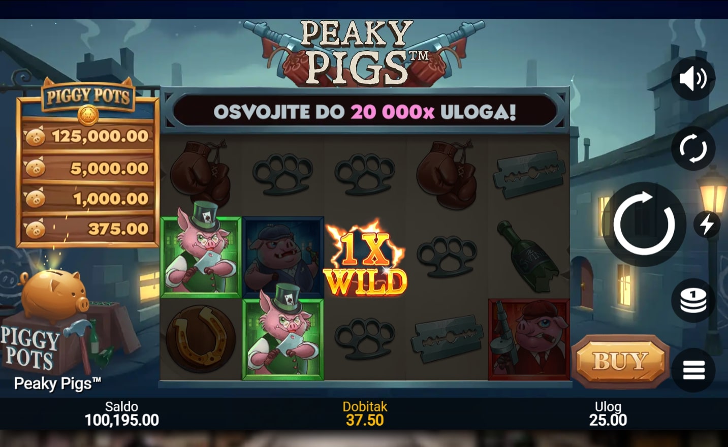 Peaky Pigs tematska je slot igra napravljena po uzoru na poznati serijal Peaky Blinders. Igra daje svinjama uloge famoznih mafijaša te su stoga najvredniji simboli likovi kao Tommy Hilpigger i Billy Bacon. Igraču najzanimljiviji vjerojatno će biti Wild i Free Spins simboli koji mogu zamijeniti druge simbole, odnosno igrača odvesti u svijet besplatnih vrtnji. Peaky Pigs sadrži simbol kovanice koji se pojavljuje nasumično uz simbole svinja, a mogu aktivirati značajku Piggy Pots Bonus koja može umnožiti ulog do 5000 puta. Zaigraj za odlične nagrade!