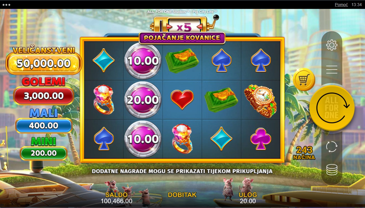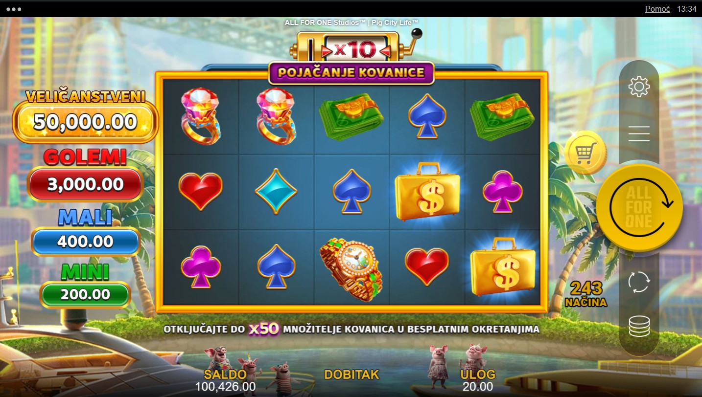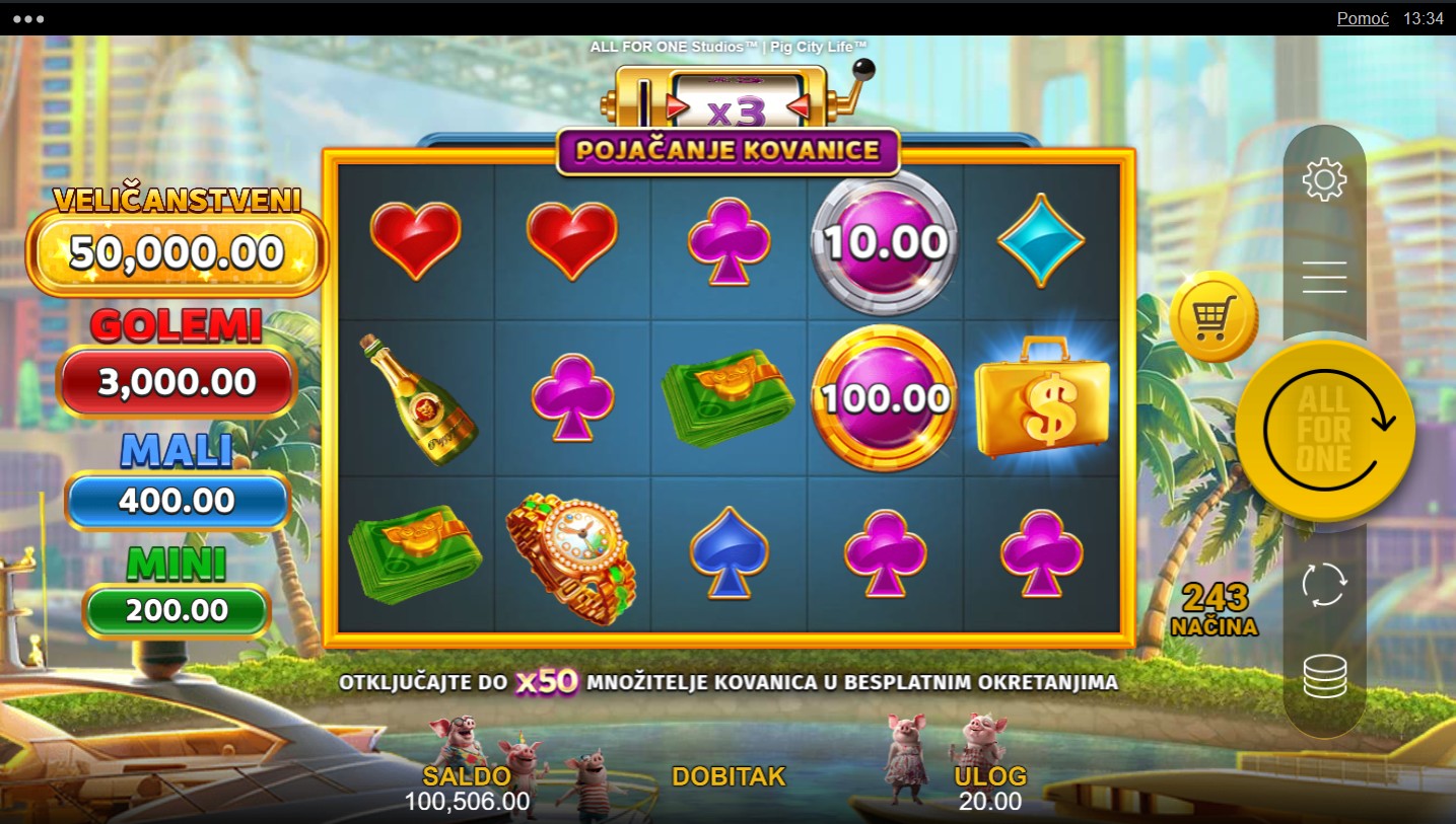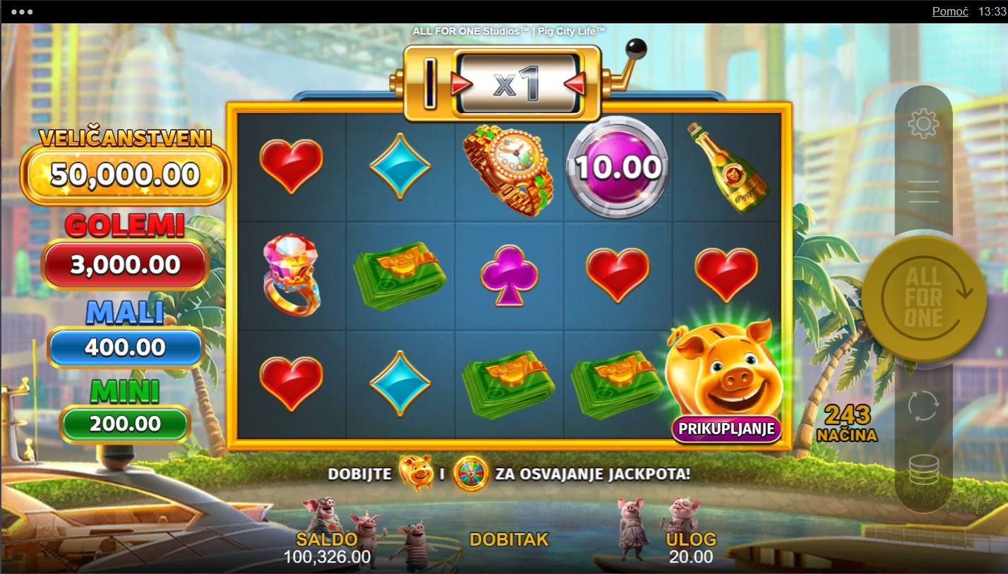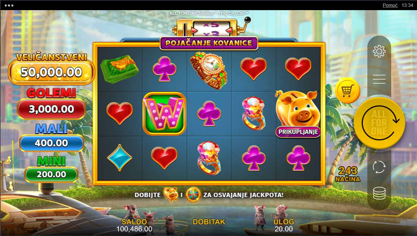 Pig City Life se igra na 5 bubnjeva i 3 reda s 243 načina dobitka. Dobitne kombinacije formiraju se s lijeva na desno, počevši od prvog bubnja. Zamjenski simboli zamjenjuju sve simbole osim Scatter simbola, simbola Kovanice, simbola Kola sreće i simbola Prikupljanja. Simboli Prikupljanja i Kovanice pojavljuju se na bubnjevima i mogu dodijeliti novčane nagrade, množitelje i jackpotove, uključujući Mini, Mali, Golemi i Veličanstveni jackpot. Kada se simboli Prikupljanja pojave zajedno s Kovanicama ili Kola sreće, dodjeljuju se pripadajuće nagrade i aktivira se Rolling Reels, gdje prikupljeni simboli nestaju s bubnjeva, a novi simboli padaju na njihova mjesta. Tri ili više Scatter simbola pokreću Besplatna okretanja: 8 Brončanih, 8 Srebrnih ili 8 Zlatnih okretanja, svaki s rastućim množiteljem kovanica do x50 i mogućnošću dodatnih okretanja. Tijekom besplatnih okretanja, simbol Prikupljanja pomiče ljestvicu množitelja, dok Upsizer omogućuje nadogradnju Besplatnih okretanja za još veće nagrade. Sve dobitne značajke dodaju se osnovnim dobitcima, a ulozi ostaju jednaki kao i na okretanju koje je pokrenulo bonus. Pig City Life spaja strategiju, jackpotove i besplatna okretanja u živopisnu i dinamičnu slot avanturu!