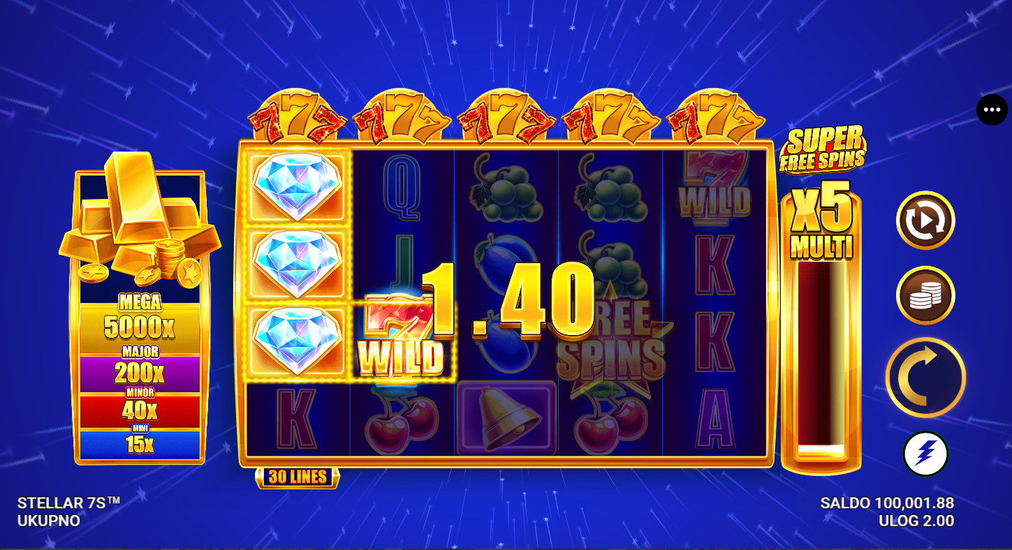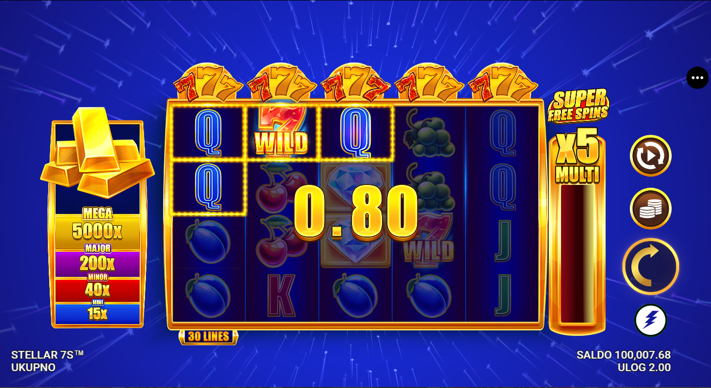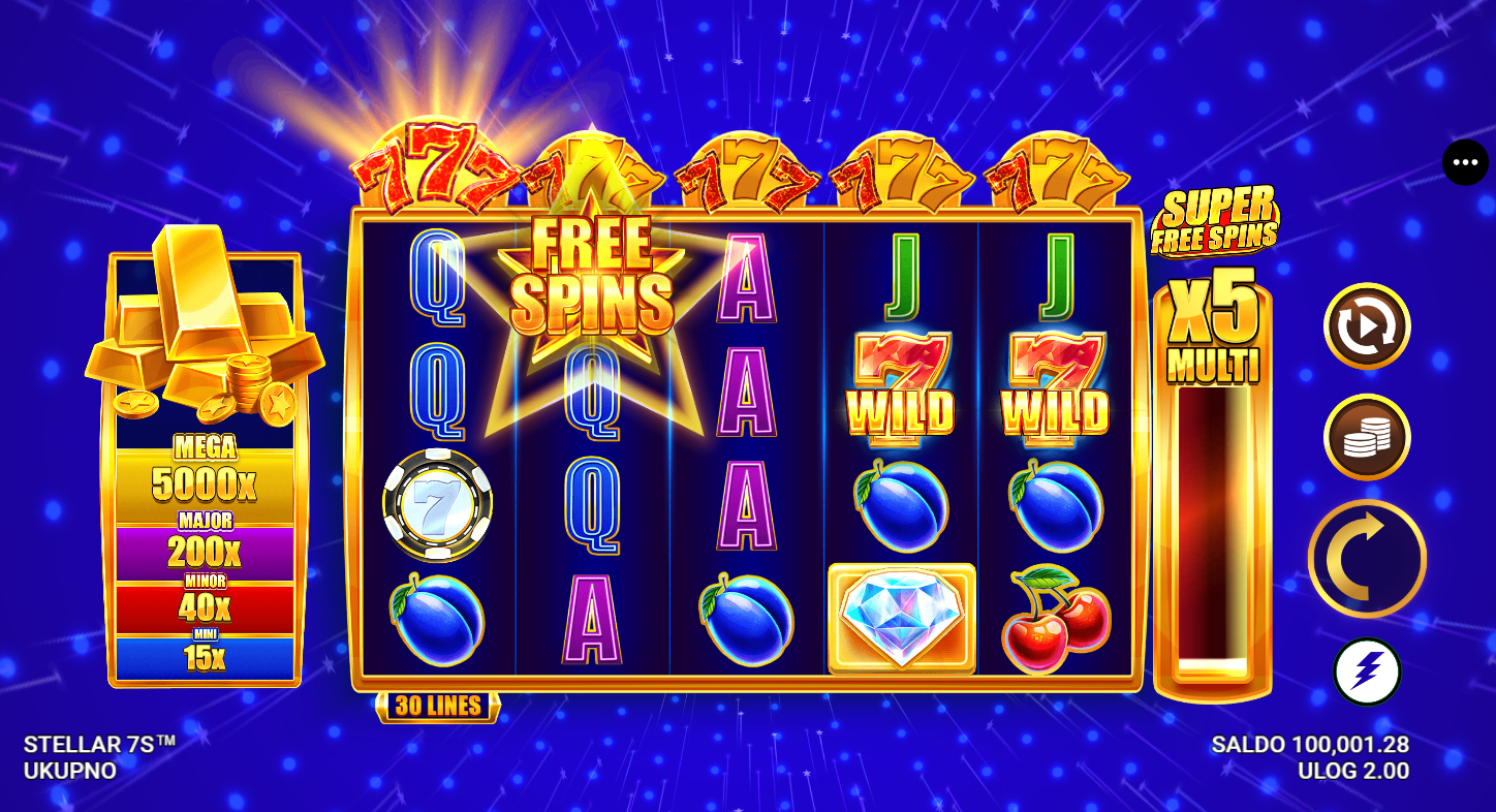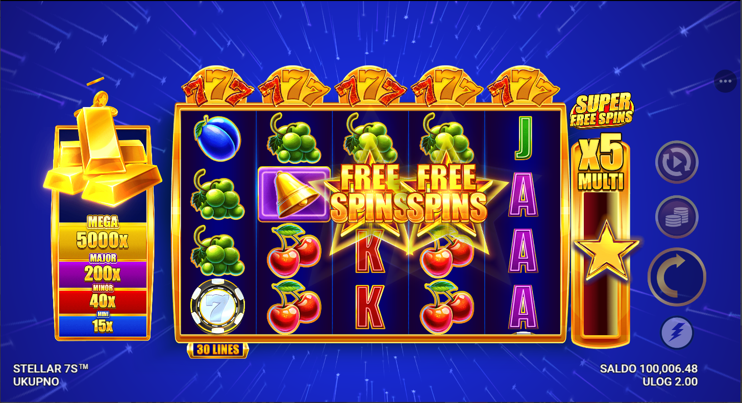 Stellar 7s nema klasične besplatne vrtnje, ali nudi bonus značajke i multiplikatore koji povećavaju dobitke.