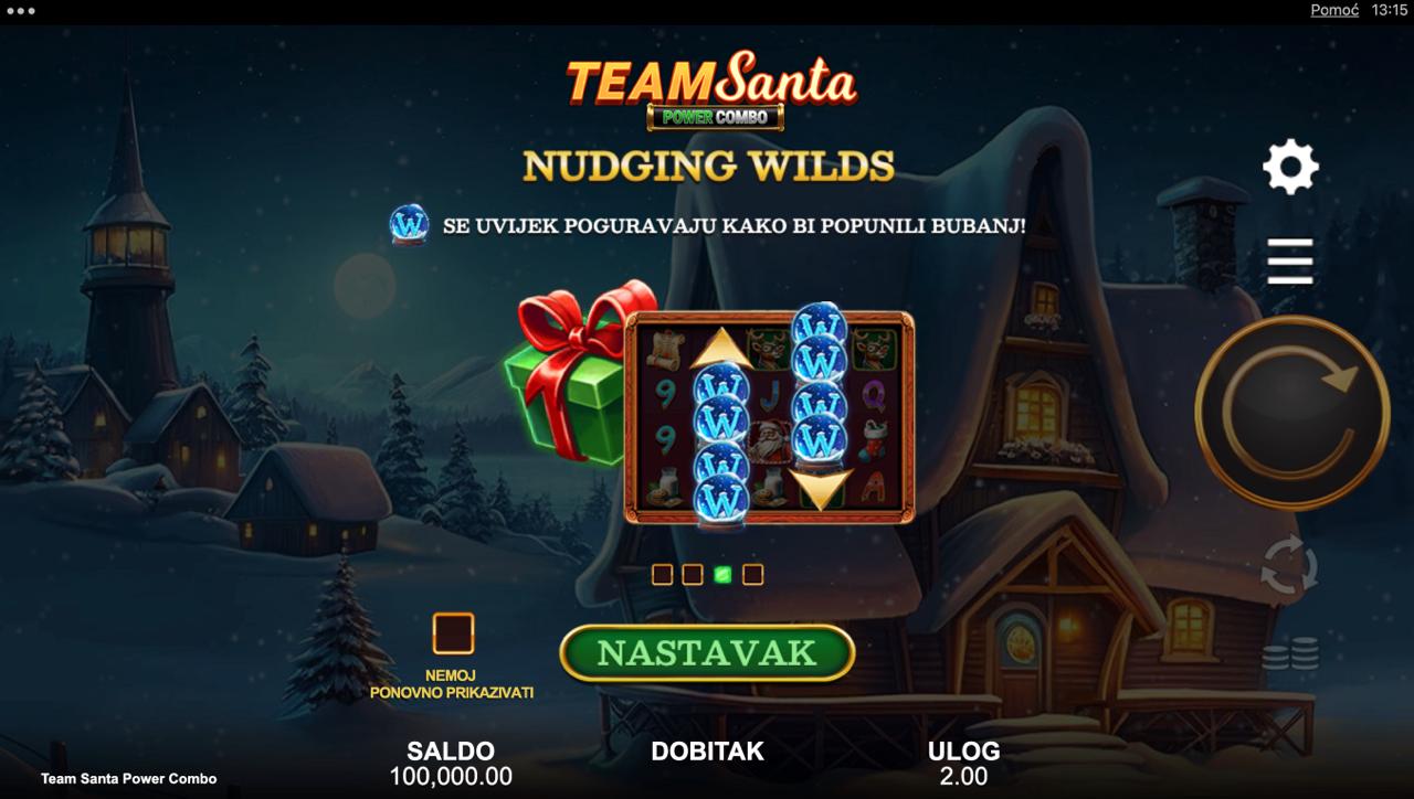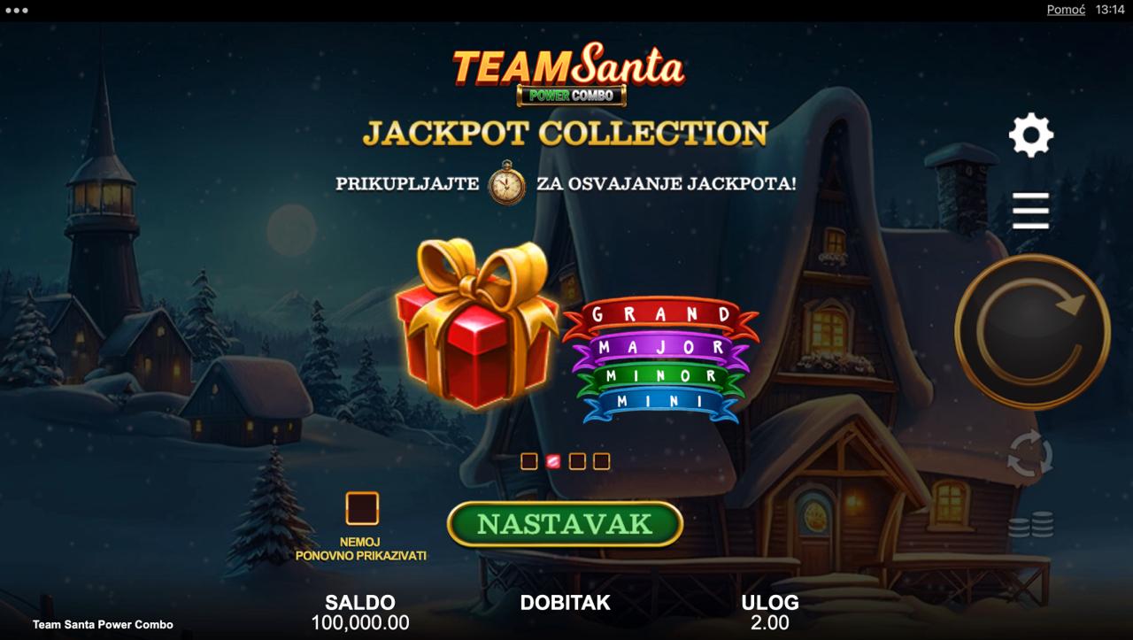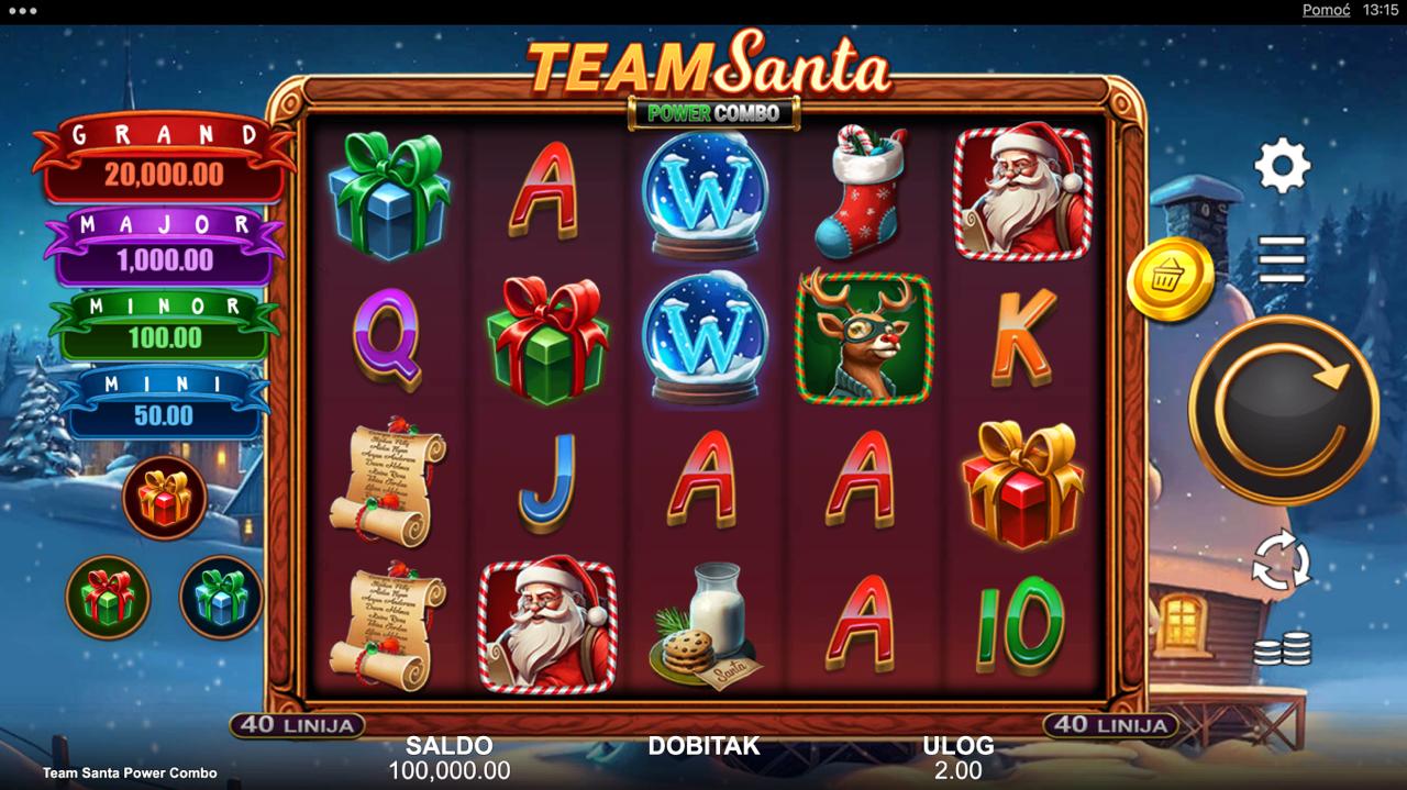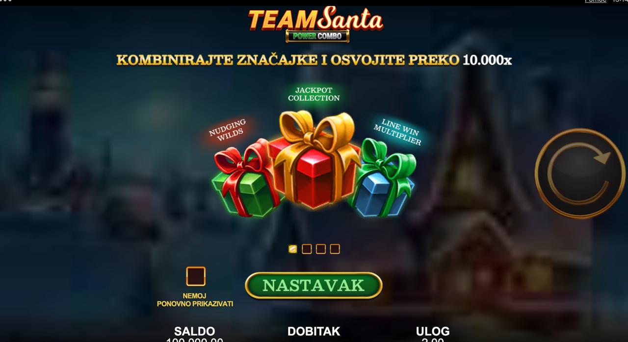 Zakorači u čarobni blagdanski svijet uz Team Santa Power Combo, slot igru providera Games Global koja donosi veselu božićnu atmosferu i dinamične bonus značajke. U ovoj igri pridružuješ se Djedu Božićnjaku i njegovom timu dok zajedno dostavljaju poklone i otključavaju bogate nagrade kroz razne mehanike igre. Vizualno, igra obiluje snježnim pejzažima, simpatičnim likovima poput Djeda Božićnjaka i sobova te prazničnim simbolima koji stvaraju toplu i zabavnu atmosferu. Iako nema klasični jackpot, igra nudi velik potencijal dobitaka zahvaljujući Power Combo sustavu, free spinovima i multiplikatorima.