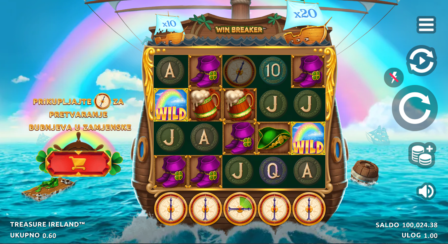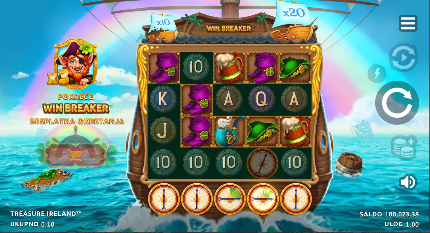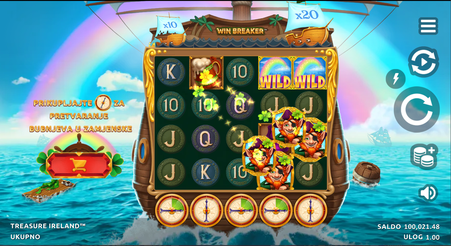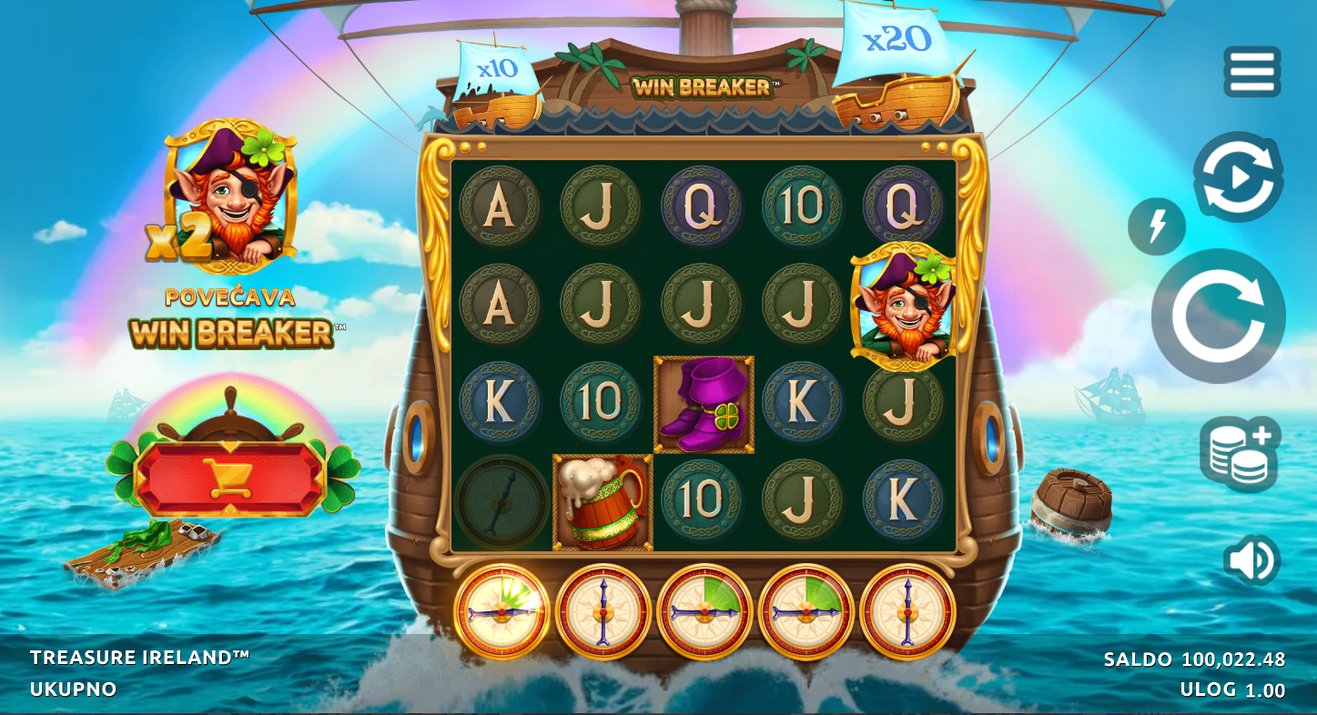 Spremi se za pustolovinu punu sreće i bogatstva s Games Global i igrom Treasure Ireland! Ovaj slot te vodi na irski otok prepun skrivenog blaga, zlatnih kovanica i magičnih simbola. Uz očaravajuću glazbu, šarenu grafiku i duhovitog vilenjaka, svaka vrtnja donosi novi val uzbuđenja. Lov na blago nikad nije bio zabavniji! Tvoje bogatstvo čeka negdje među djetelinama i zlatnim oblacima!