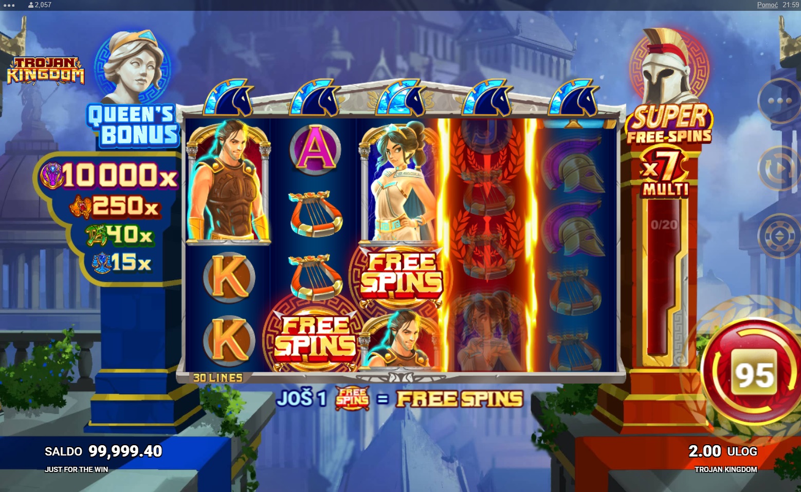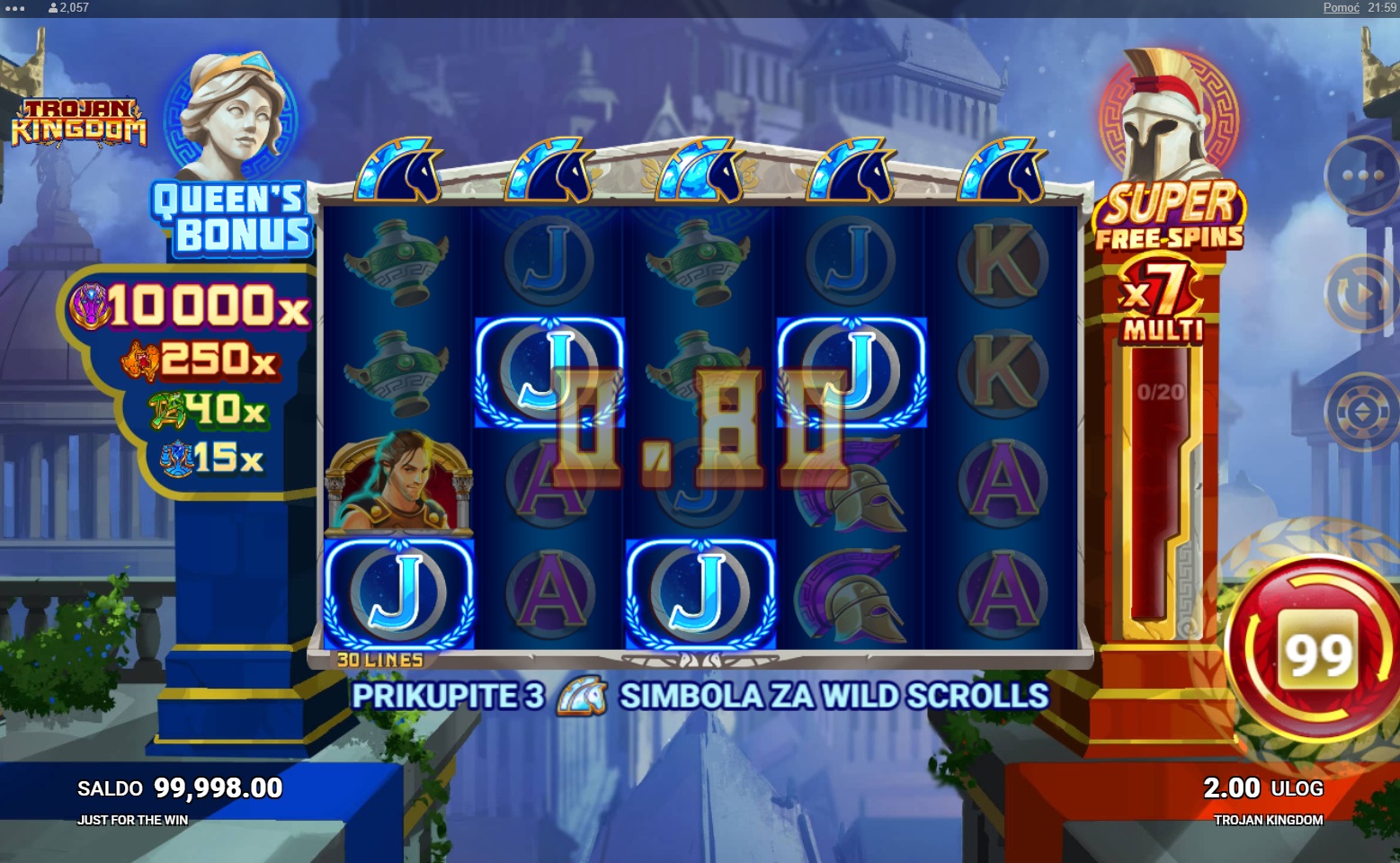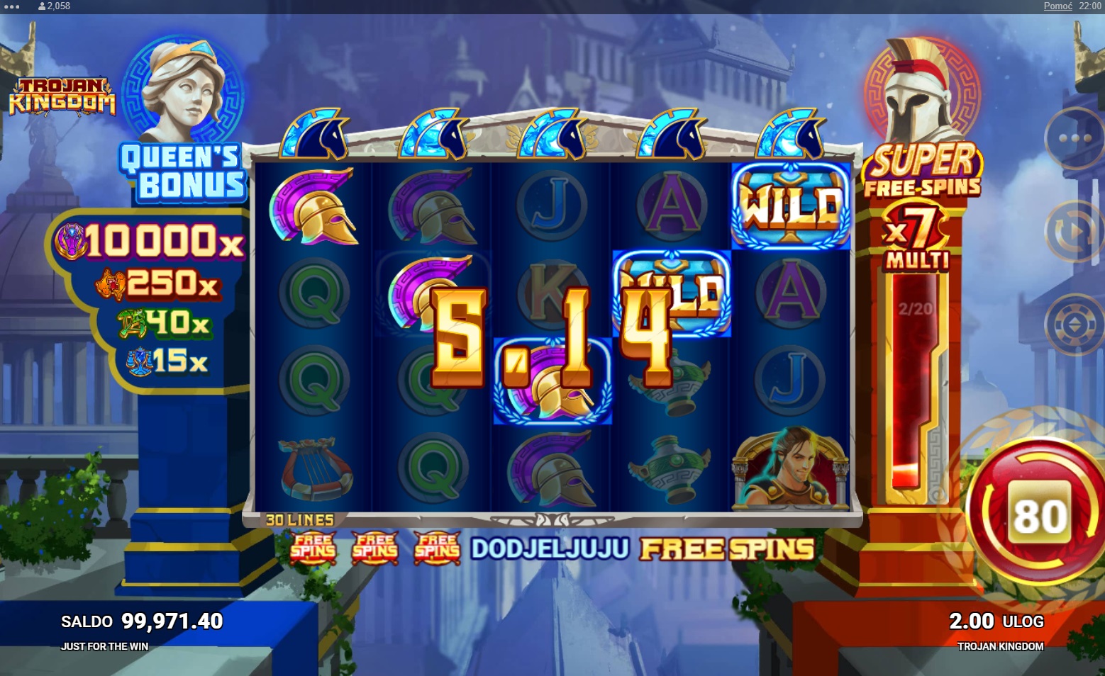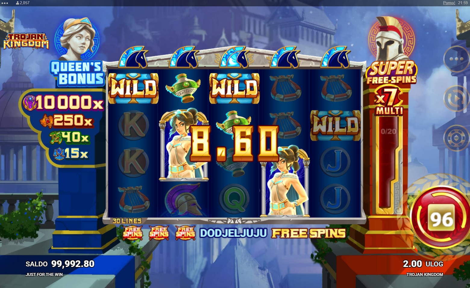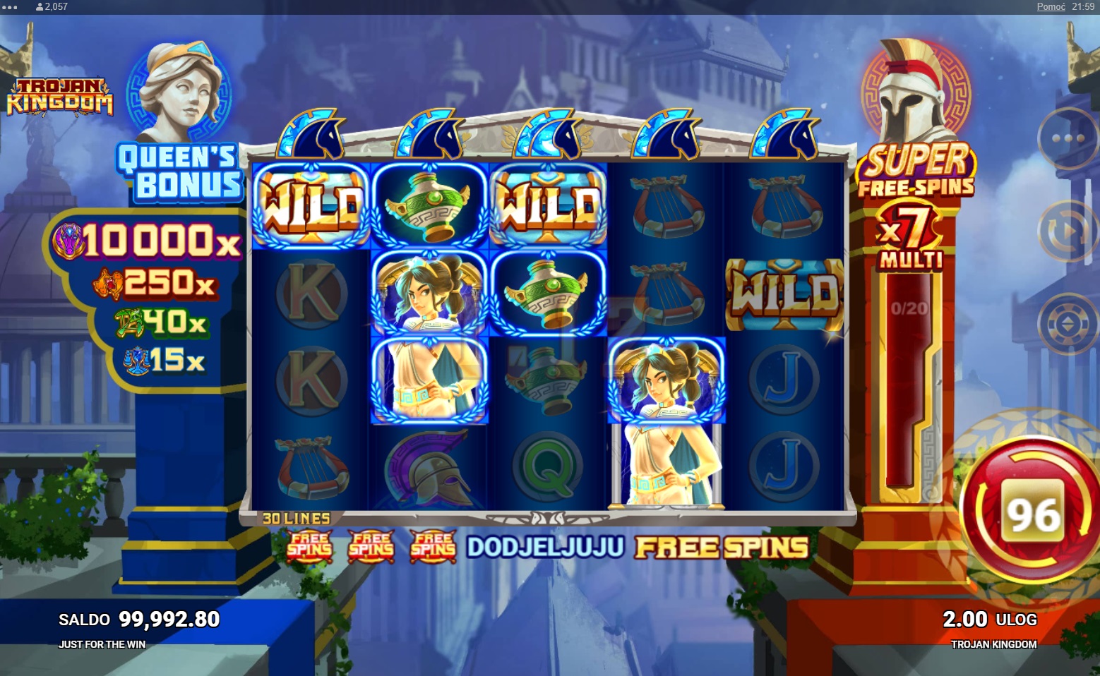 U Trojan Kingdom, tvoj cilj je spojiti simbole na jednoj od 30 isplatnih linija, a dobitke dobivaš s lijeva na desno. Dok igraš, možeš sakupljati Bonus simbole koji aktiviraju Wild Scrolls, dodajući ljepljive Wild simbole na bubnjeve. Ako sakupiš 3 simbola Free Spins, ulaziš u rundu besplatnih vrtnji s početnim multiplikatorom x2, a možeš napredovati do Super Free Spins gdje je multiplikator čak x7. Također, tu je i Queen's Bonus gdje možeš osvojiti velike novčane nagrade. Sva ova dodatna iznenađenja čine igru nevjerojatno zabavnom i dinamičnom.