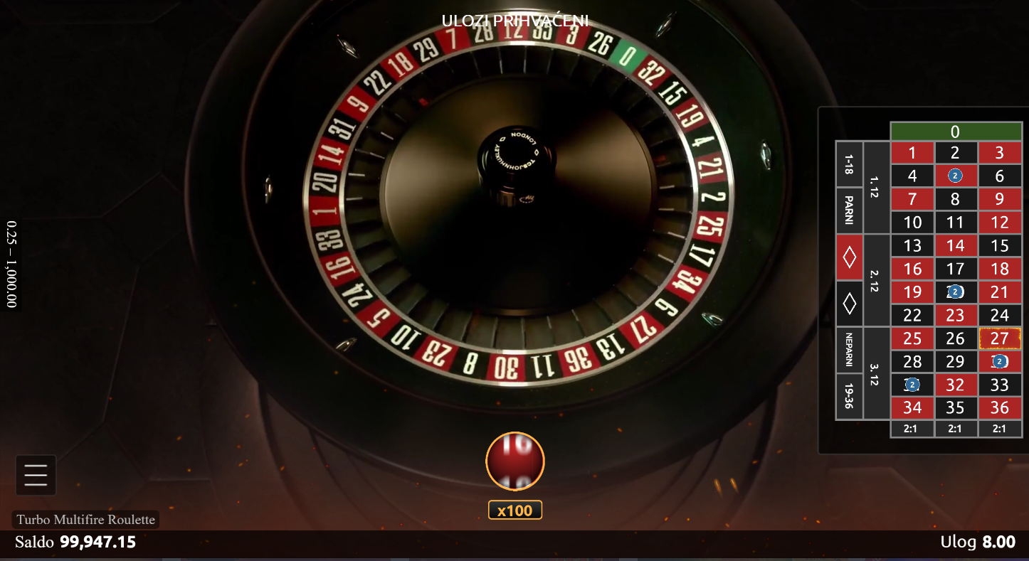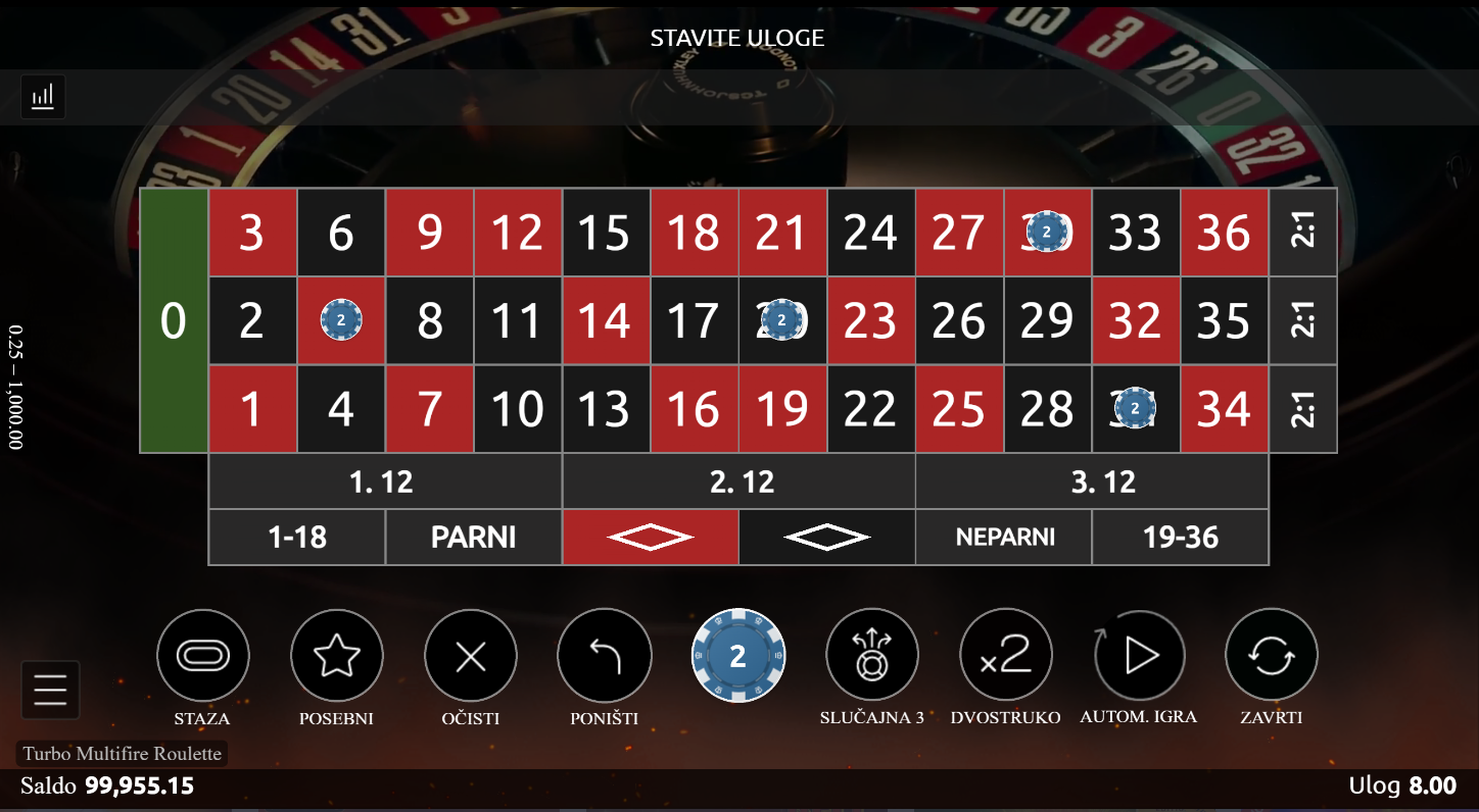 4. Koji su minimalni i maksimalni ulozi u igri Turbo Multifire Roulette?