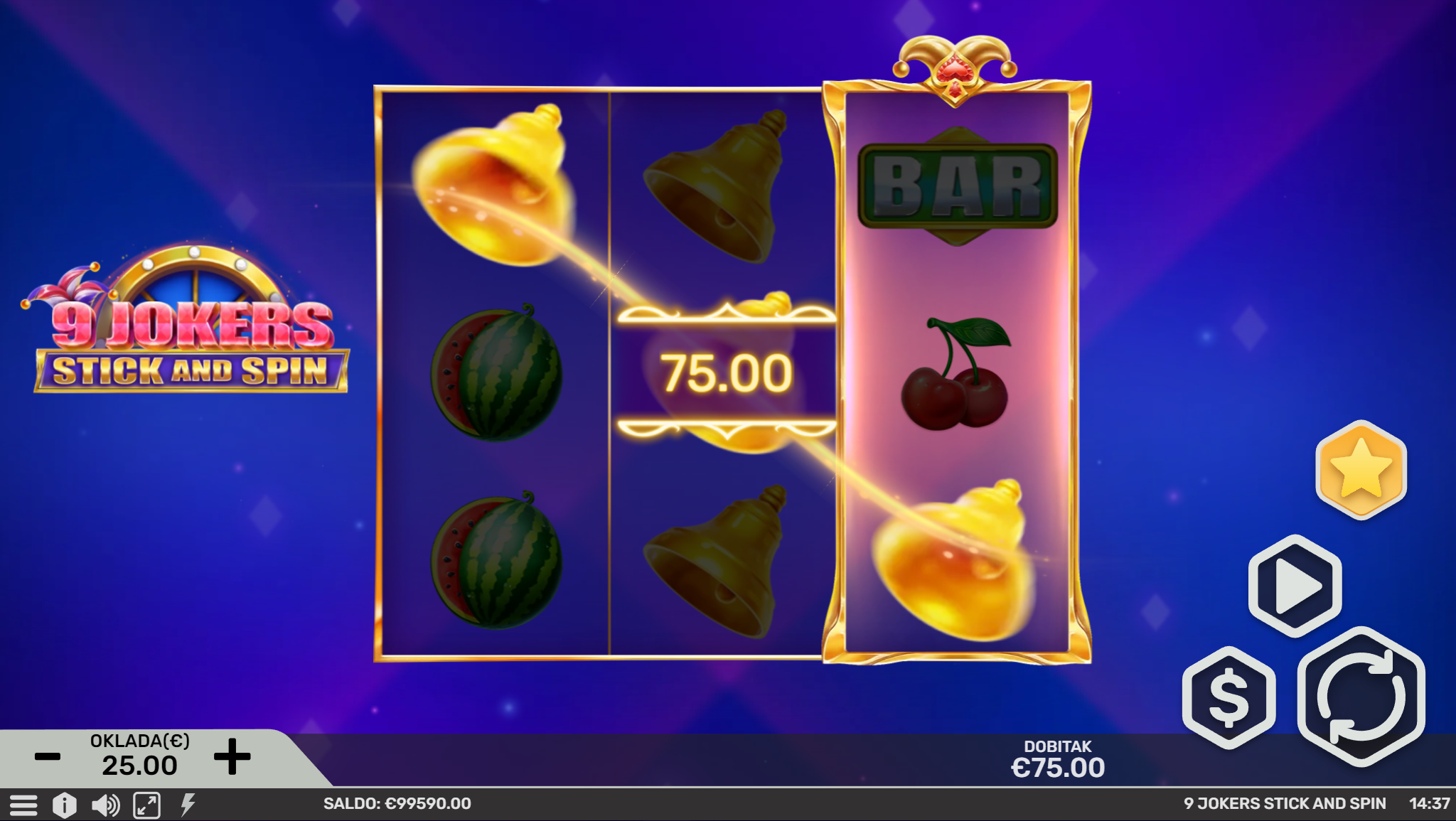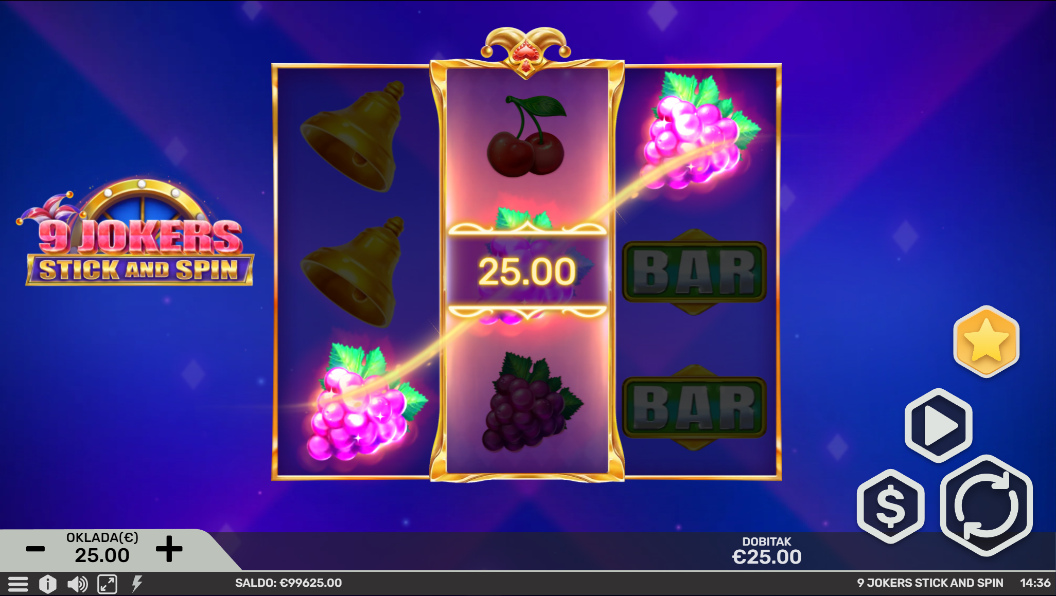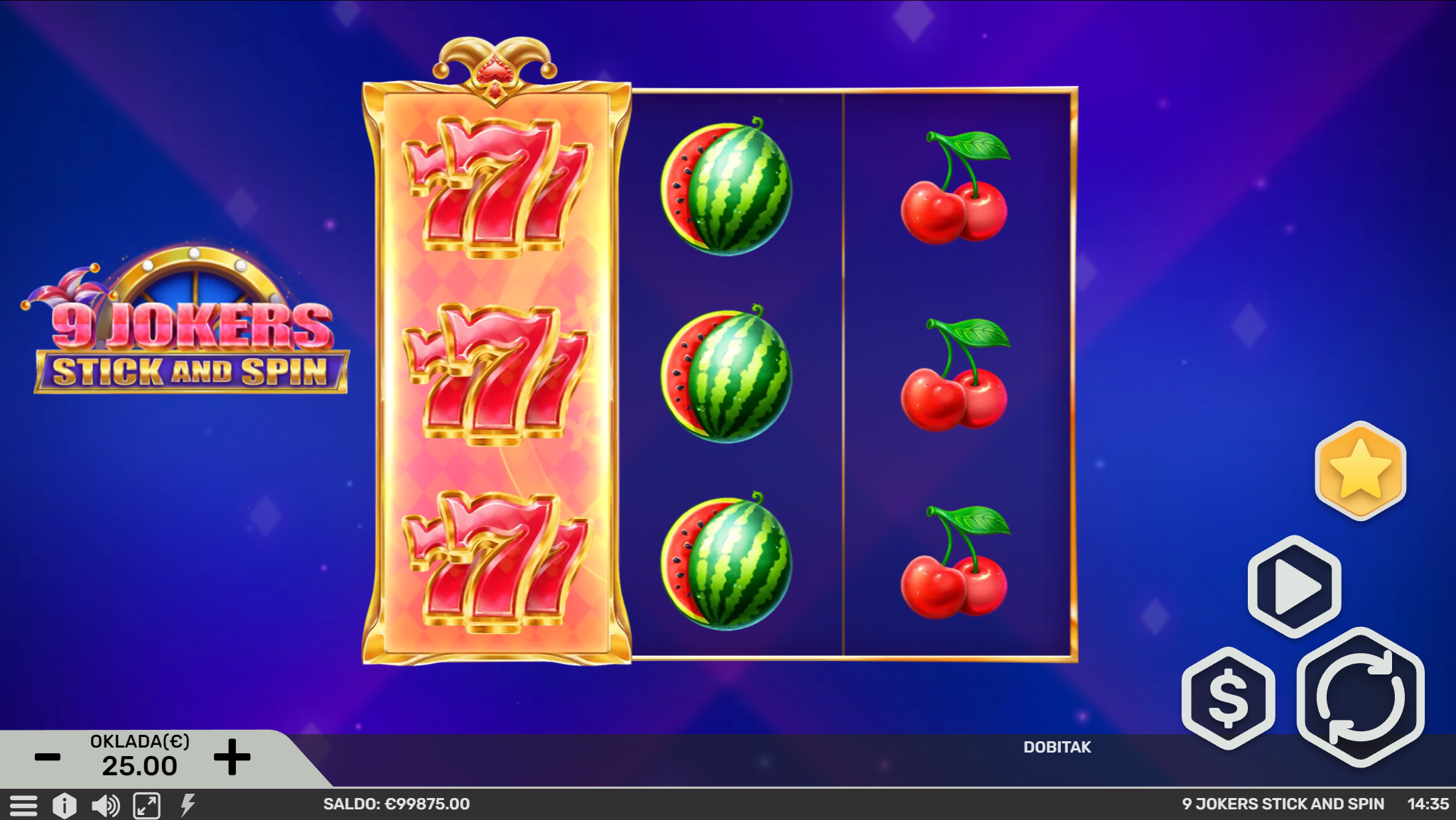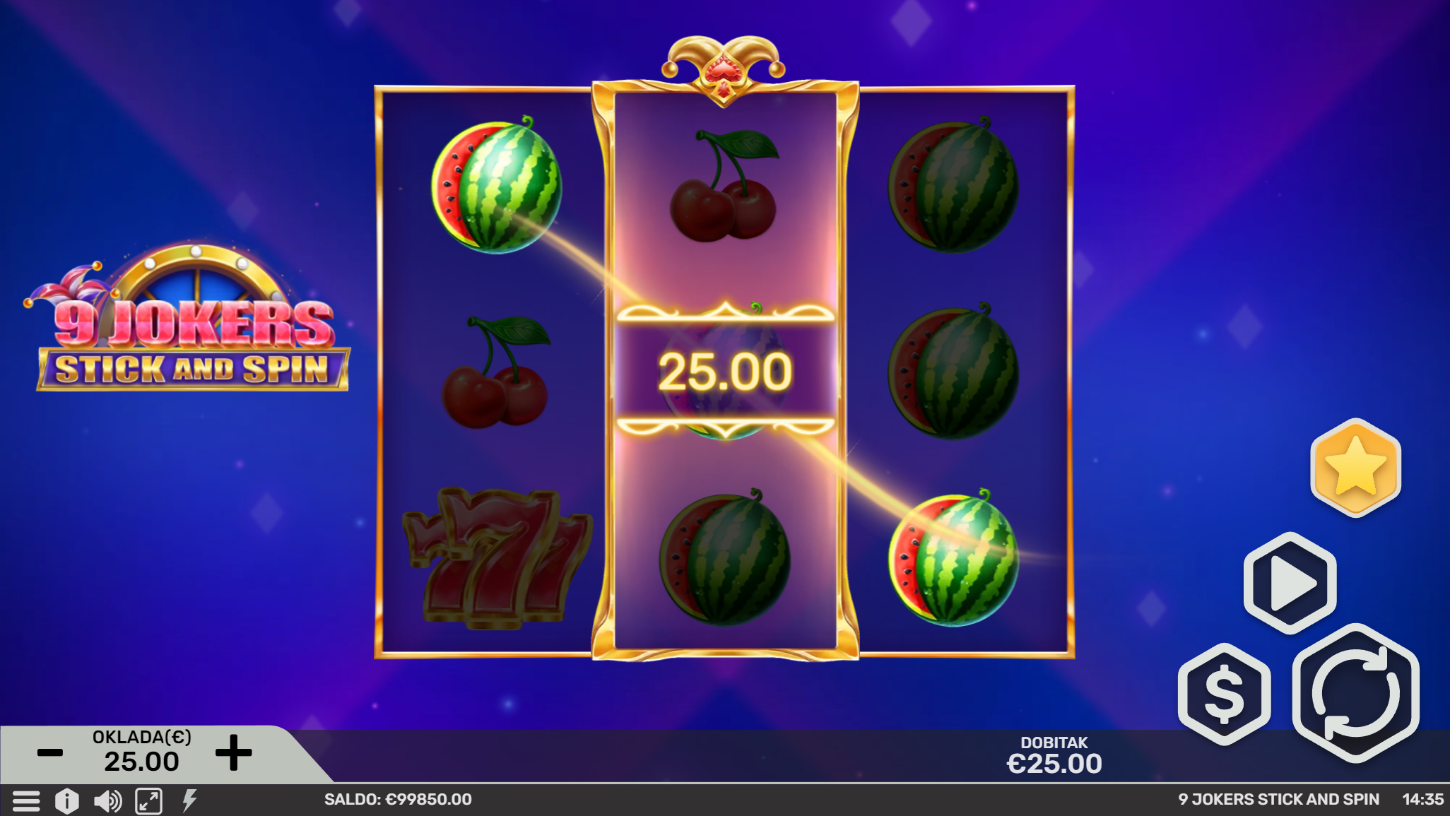 Dobrodošao u 9 Jokers Stick and Spin, zabavnu avanturu inspiriranu gomilom sočnog voća i tajanstvenih jokera koji će ti uz nezaboravno igranje donjeti i velike dobitke! Primamljivo ilustrirano voće jednostavnog dizajna, kao i način igranja učiniti će dozu zabave i zanimacije nedostižnom! Kako uzbuđenju tu nebi bio kraj, pobrinuti će se joker simbol i igranje pretvoriti u super uzbudljivo te bogato po pitanju dobitaka! Kao jedan od najpopularnijih slotova, 9 Jokers Stick and Spin odličan je izbor za sve igrače koji vole izvrstan omjer rizika i dobitaka.
