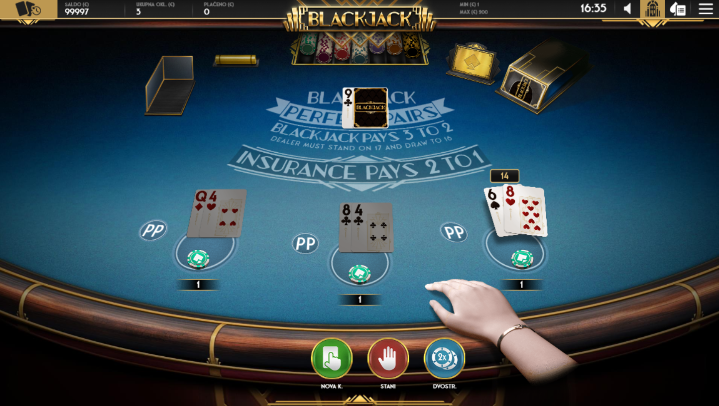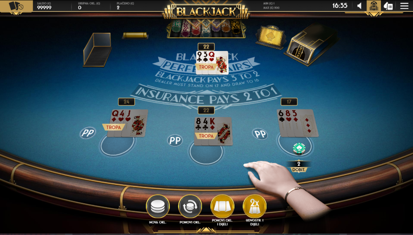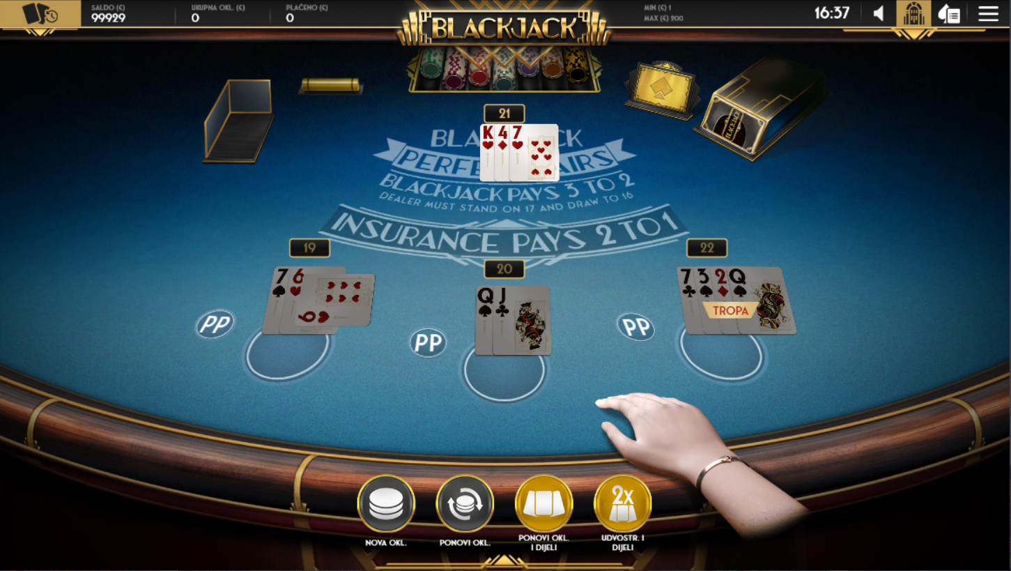 Odaberi broj ruku koje želiš igrati, postavi osnovni ulog i odluči hoćeš li okušati sreću s opcijom Perfect Pairs. Cilj je jasan, pobijedi dilera s 21 ili što bliže tome, ali sada uz šansu da prve dvije karte budu savršeni par. Možeš udvostručiti, podijeliti ili stati, a svaka odluka nosi težinu. Dodatni ulozi povećavaju uzbuđenje, posebno kada se na stolu pojave dvije iste karte. Ovo je blackjack s karakterom i prostorom za pametnu igru.