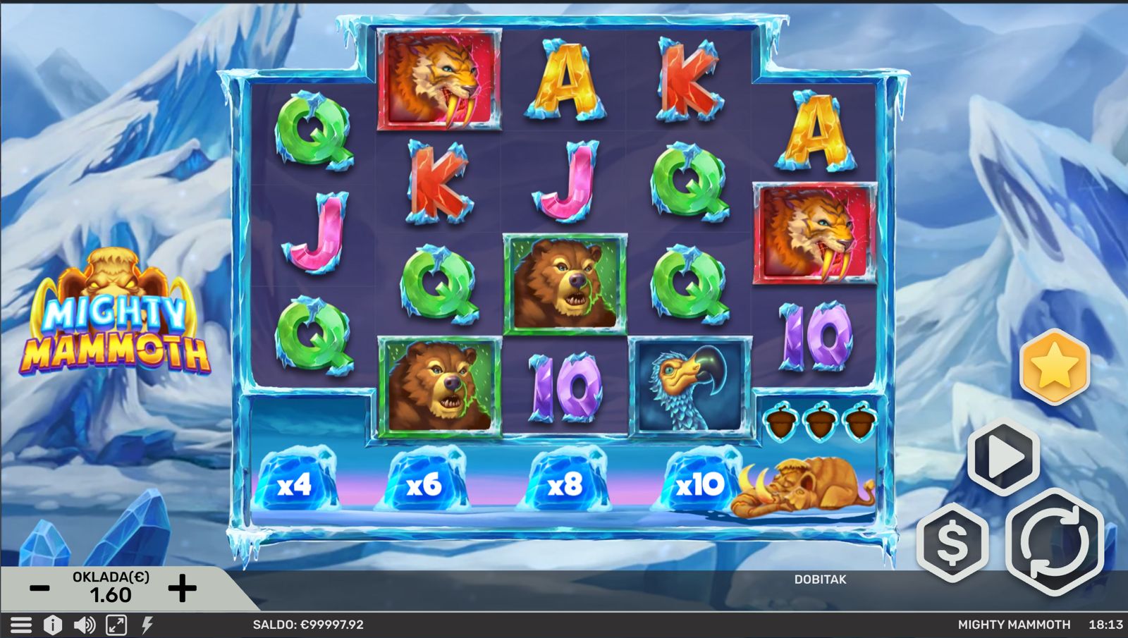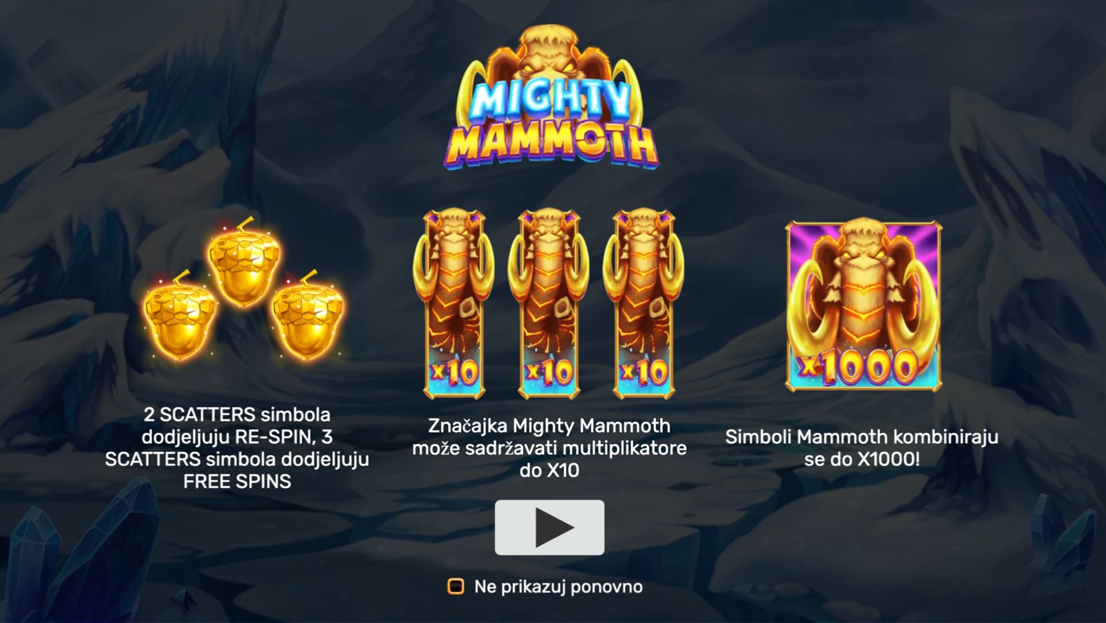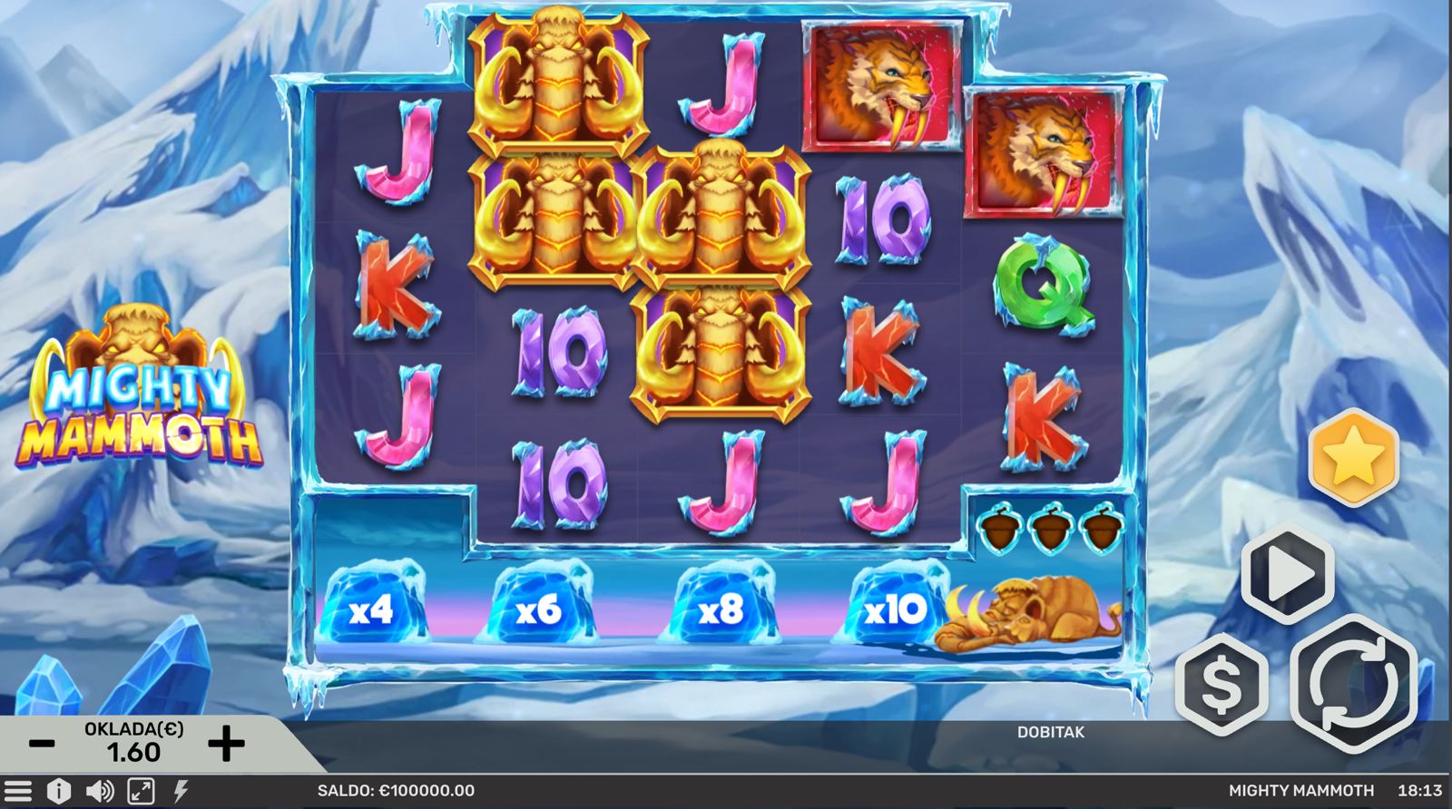 Mighty Mammoth je slot igra tvrtke GamingCorps smještena u ledeno doba, s motivom mamuta i ledenih krajolika. Igra koristi mrežu od 5 koluta s rasporedom 3–4–4–4–3, što osigurava 576 načina dobitka. Igra nema jackpot, ali možeš osvojiti do 10.000× ulog.