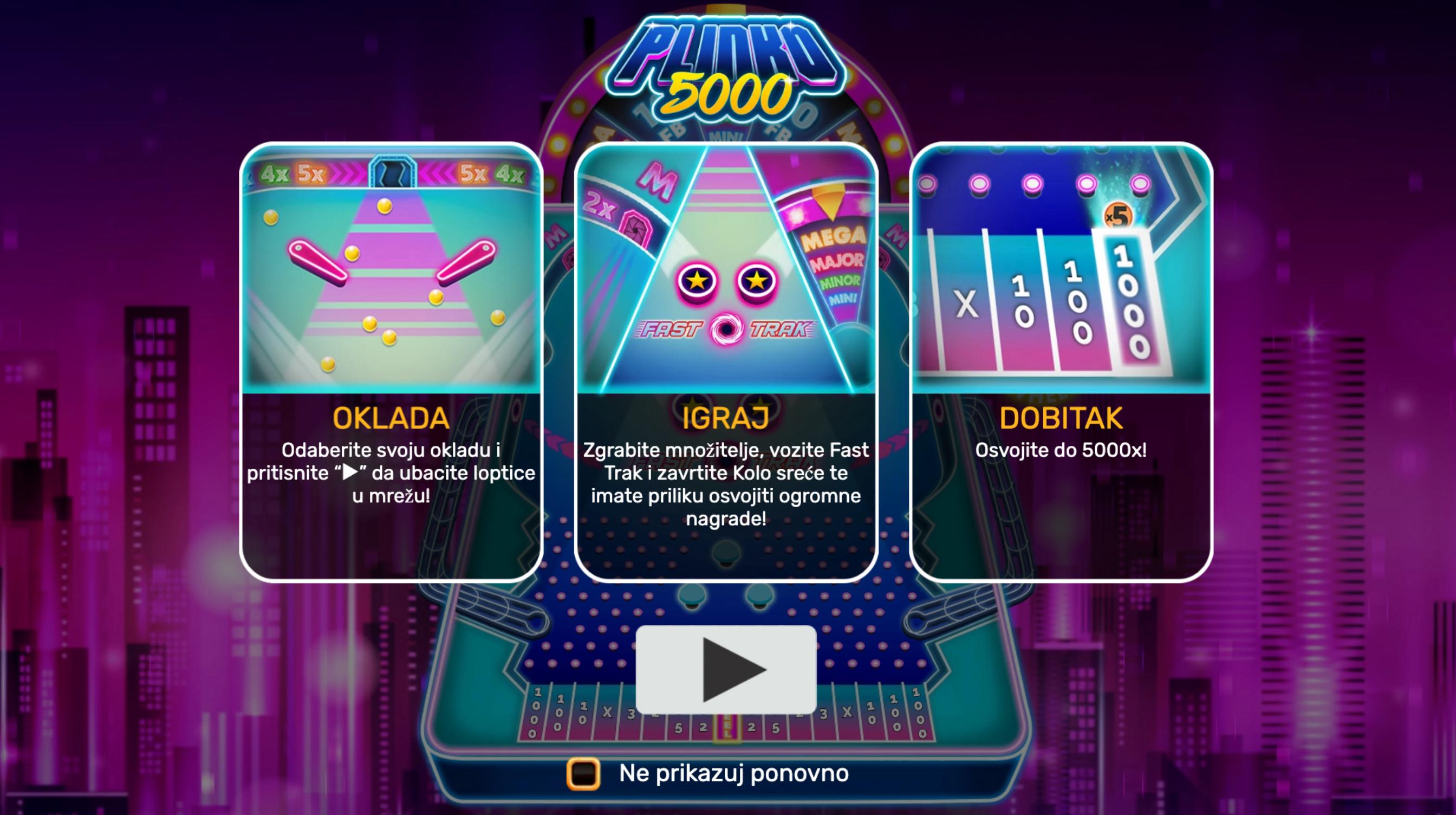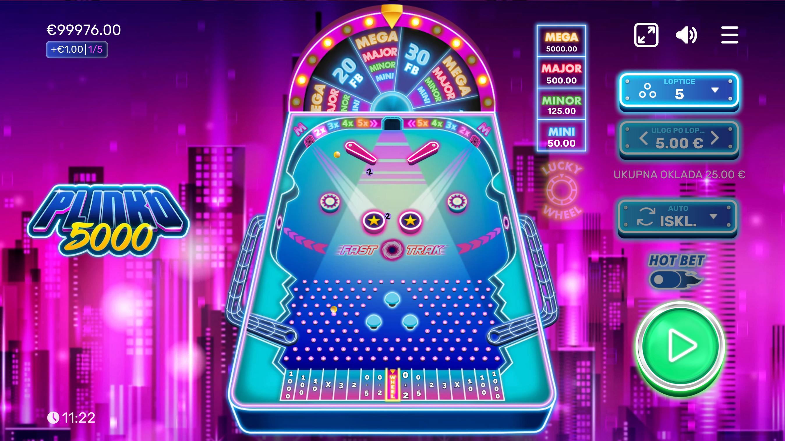 Plinkball 5000 donosi arkadnu Plinko-inspiriranu mehaniku u modernom casinovskom ruhu — igra je razvijena od Gaming Corps i nudi uzbudljivu kombinaciju loptica koje padaju kroz polje izbočina, rumpala i bubnjeva, sve do ladica isplata. Igra nema jackpot, ali nudi maksimalnu isplatu do 5 000× vašeg ulaganja.