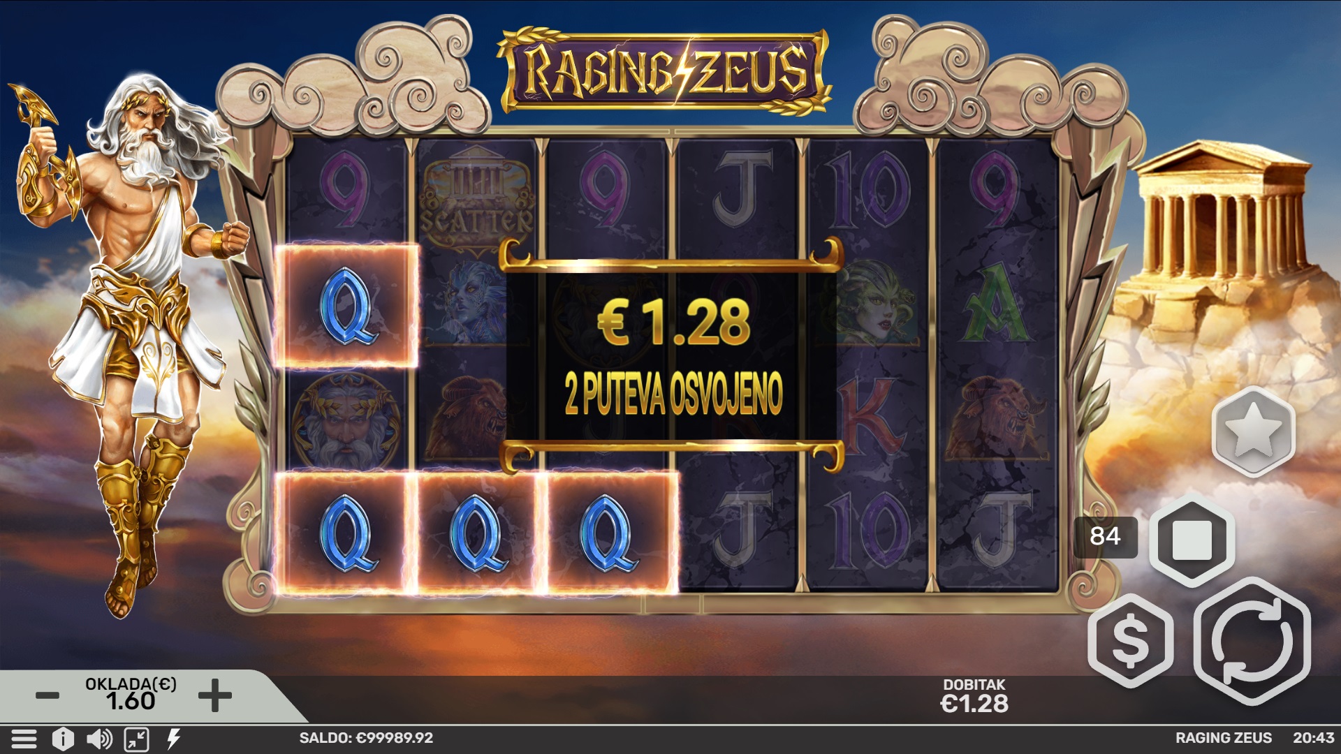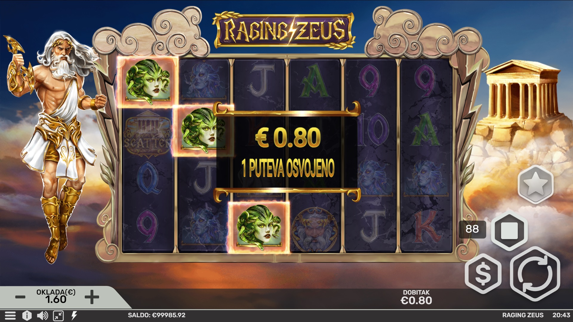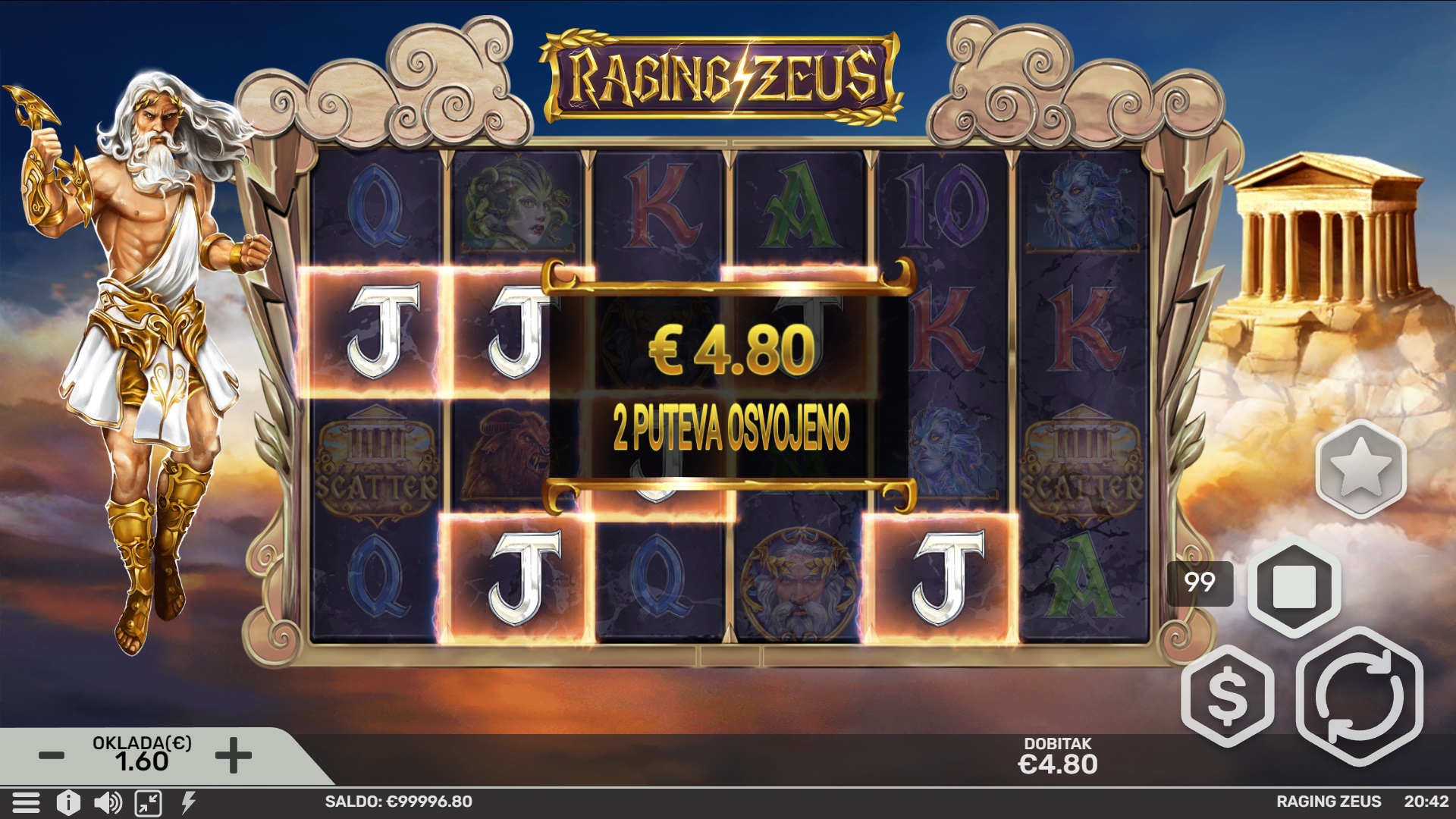 Raging Zeus je video slot automat s 6 valjaka i 4096 načina za dobitak, smješten u svijet grčkih bogova. Ova uzbudljiva igra donosi mnoštvo prilika za velike pobjede, uz Scatters i Wild simbole koji omogućuju dodatne dobitke. Posebna značajka Raging Zeus dodaje 2 do 4 Wild simbola, a tijekom Free Spins, simbole pretvara u Multiplier Wilds za još veće isplate. Uz mogućnost pokretanja do 100 besplatnih vrtnji, Raging Zeus nudi eksplozivnu zabavu s mnoštvom mogućnosti za dobitak.