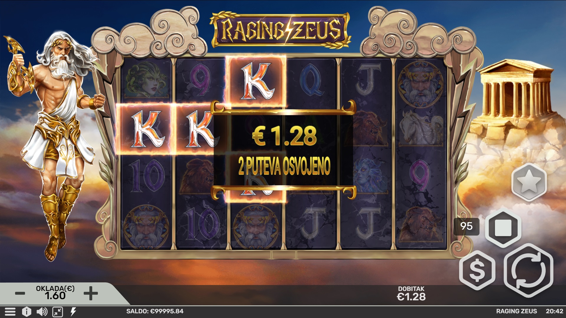 Raging Zeus nudi RTP od 95,72% tijekom regularne igre, dok kupnja bonusa podiže RTP na 96,35%. Volatilnost je srednja, što znači da možeš očekivati česte, ali manje dobitke. Ova igra je savršena za igrače koji vole balans između rizika i nagrada.