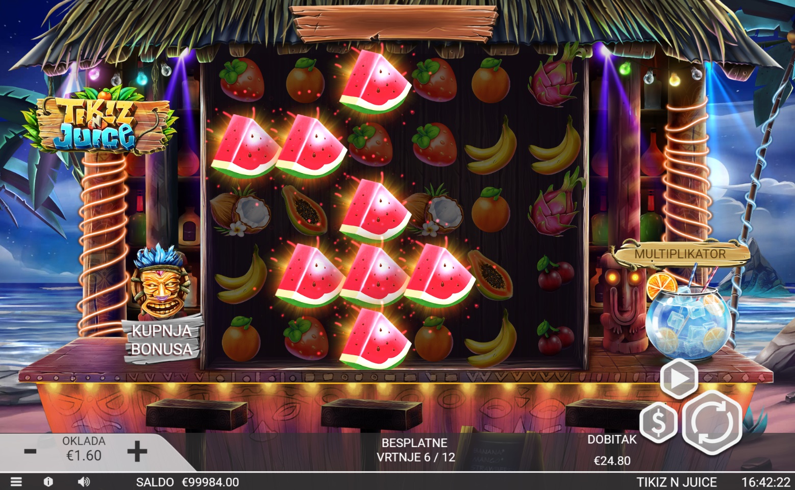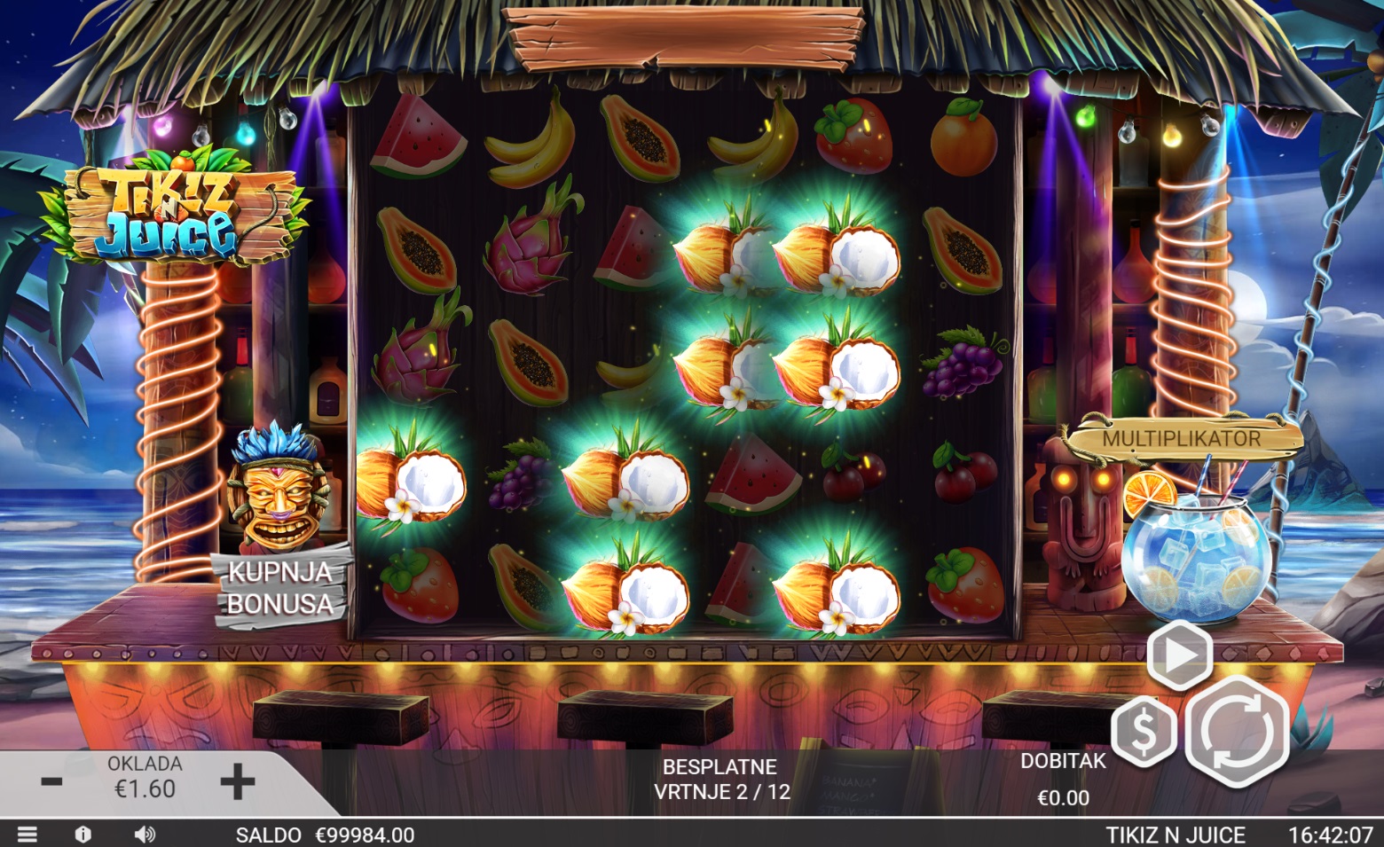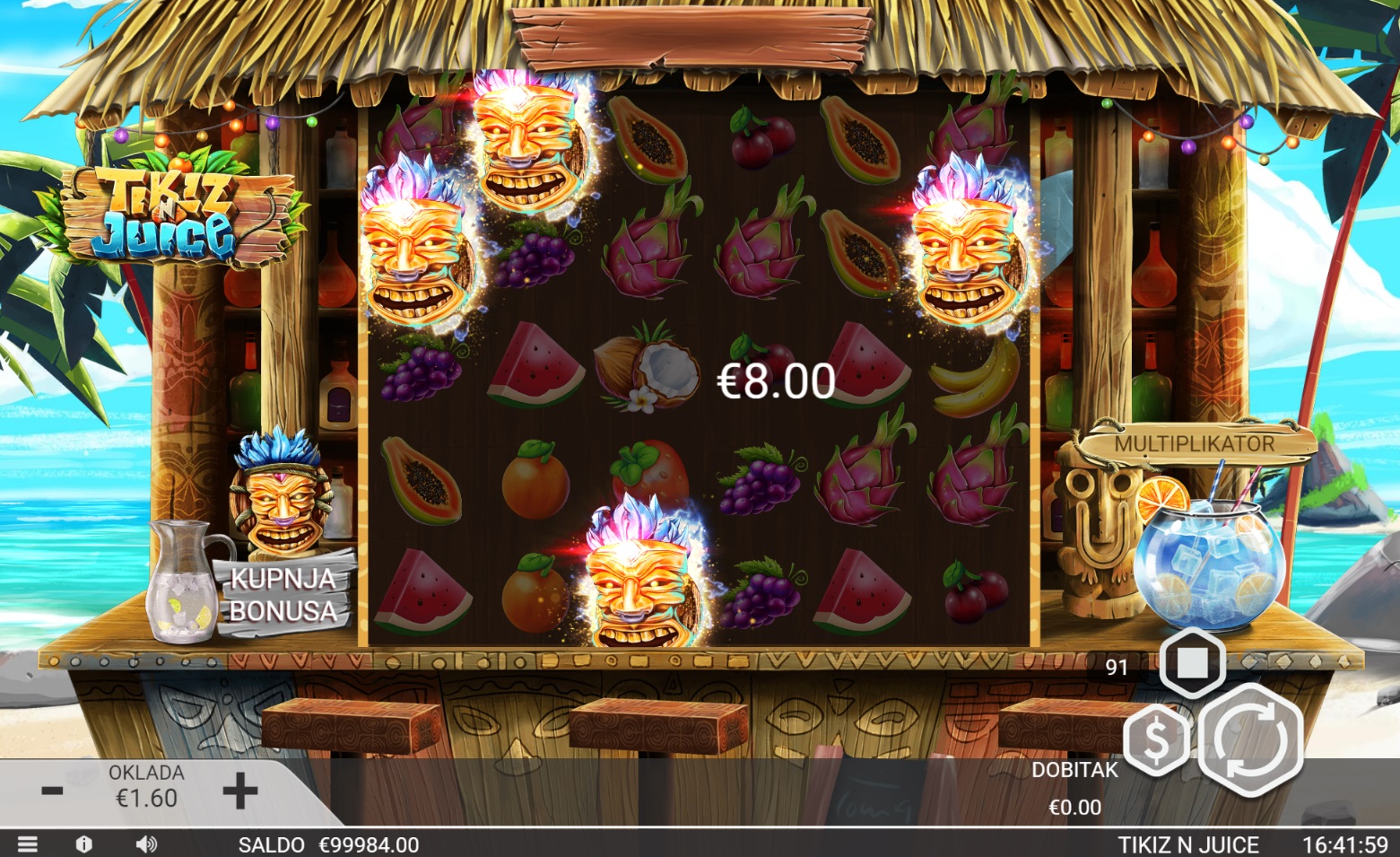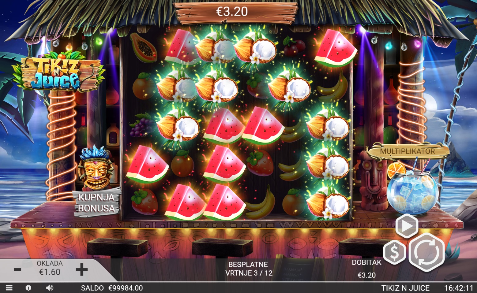 Tikiz N Juice je uzbudljiva slot igra koja donosi šarenilo i mnoštvo dobitnih prilika. Igra se odvija na rešetki sa 6 stupaca i 5 redova, gdje simboli padaju kako bi stvorili dobitke. Tikiz N Juice nudi mogućnost osvajanja velikih nagrada uz besplatne vrtnje i visoke multiplikatore. Zaigraj i uživaj u 12 besplatnih vrtnji koje se aktiviraju s tri ili više Tikiz simbola, te iskoristi moćne multiplikatore koji mogu doseći do X100. Uz Tikiz N Juice, svaka vrtnja donosi uzbuđenje i priliku za osvajanje do 5000 puta tvojeg uloga!