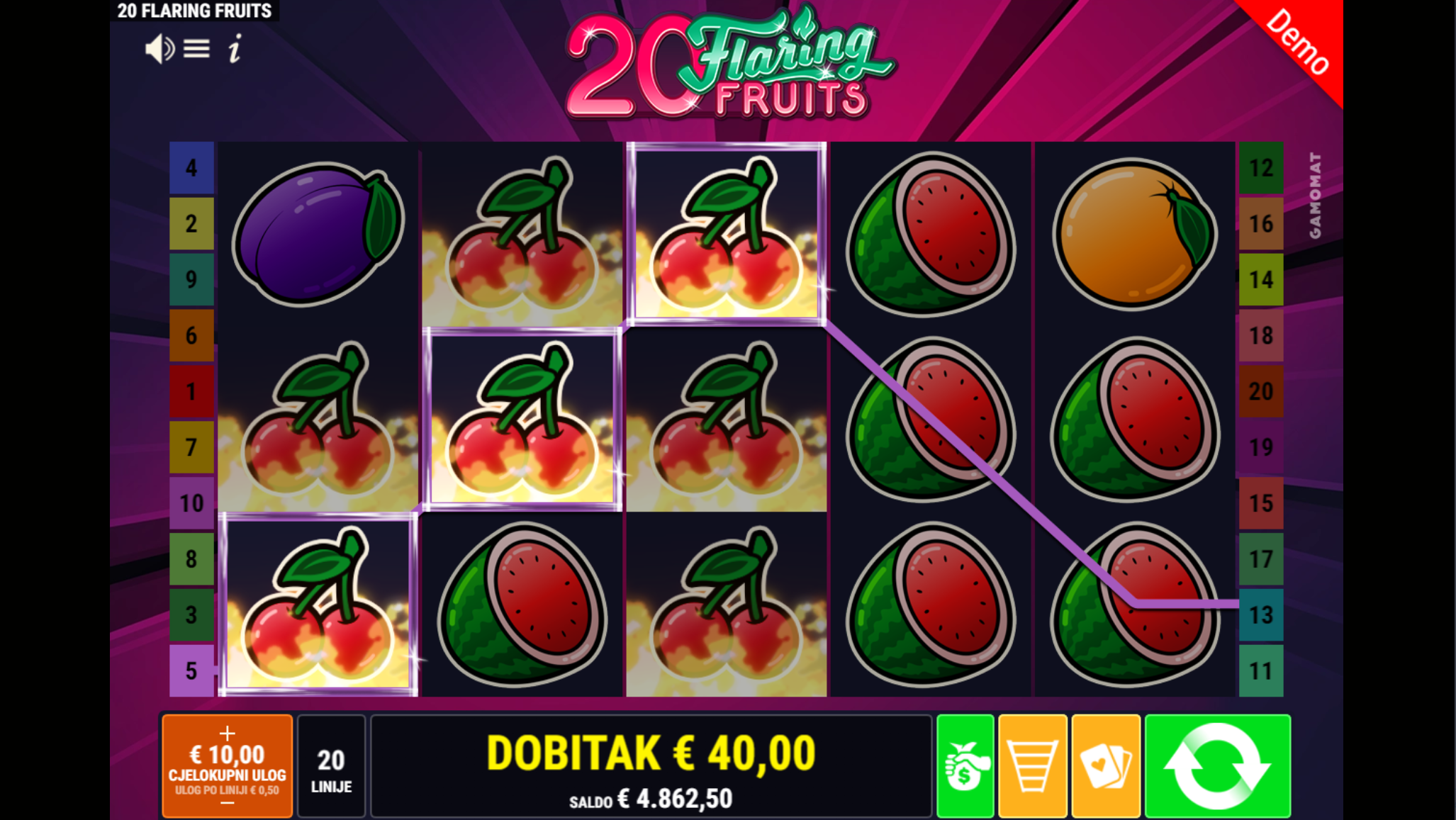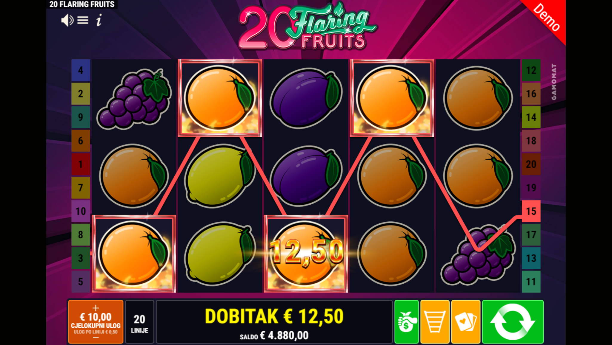 Igra 20 Flaring Fruits ima RTP u iznosu od 96.11%, što znači da igrači imaju dobre šanse za ostvariti dobitak. Volatilnost igre je srednja, što znači da igrači mogu očekivati česte, ali niže dobitke.