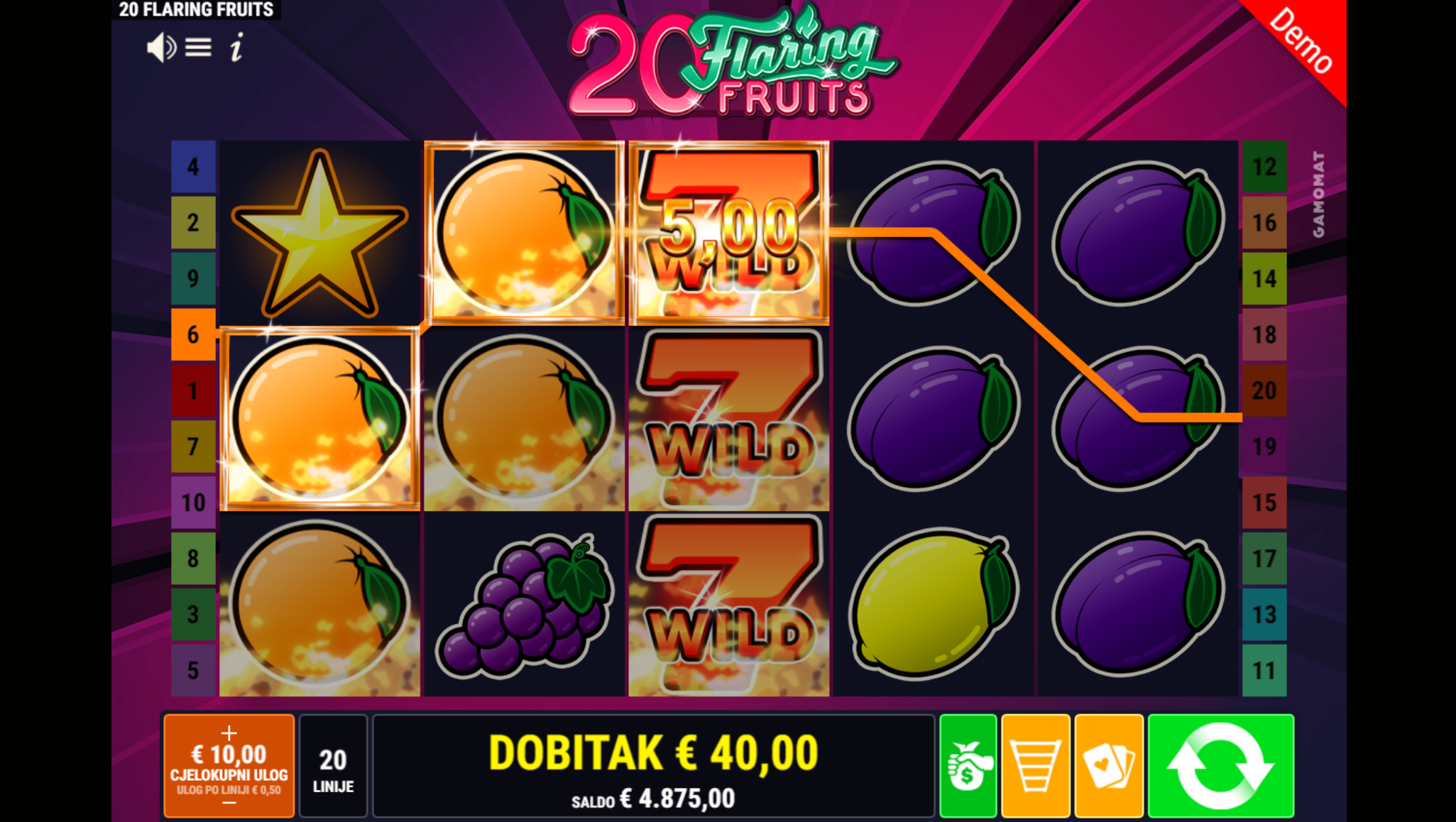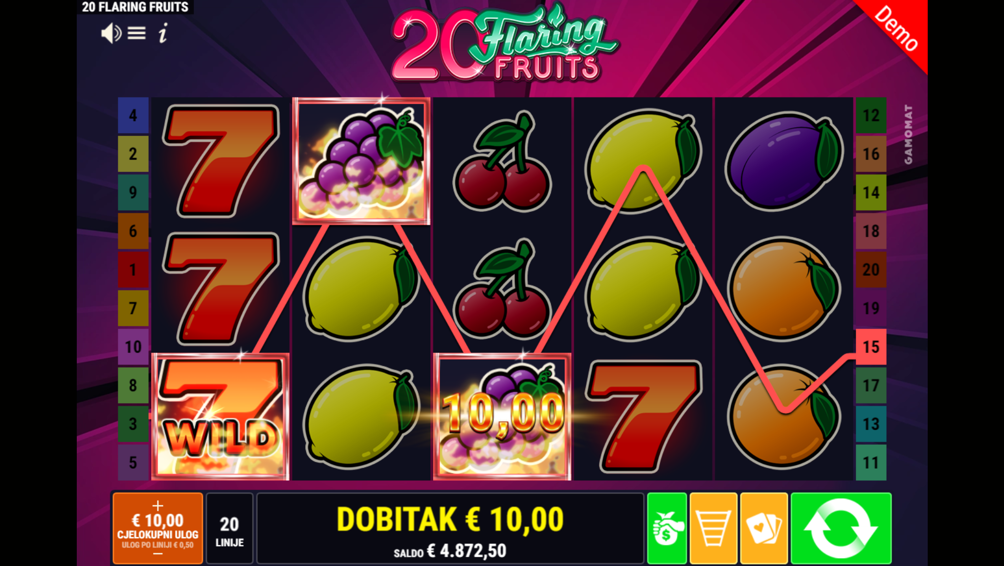 Ljubitelj si klasičnih i jednostavnih slotova? Na pravom si mjestu jer 20 Flaring Fruits pruža sve to, a i mnogo više. Primamljivo ilustrirano voće jednostavnog dizajna kao i način igranja učiniti će dozu zabave i zanimacije nedostižnom! Kako uzbuđenju tu nebi bio kraj pobrinuti će se sedmica kao wild simbol i igranje pretvoriti u super uzbudljivo te bogato po pitanju dobitaka! Kao jedan od najpopularnijih slotova, 20 Flaring Fruits odličan je izbor za sve igrače koji vole izvrstan omjer rizika i dobitaka.