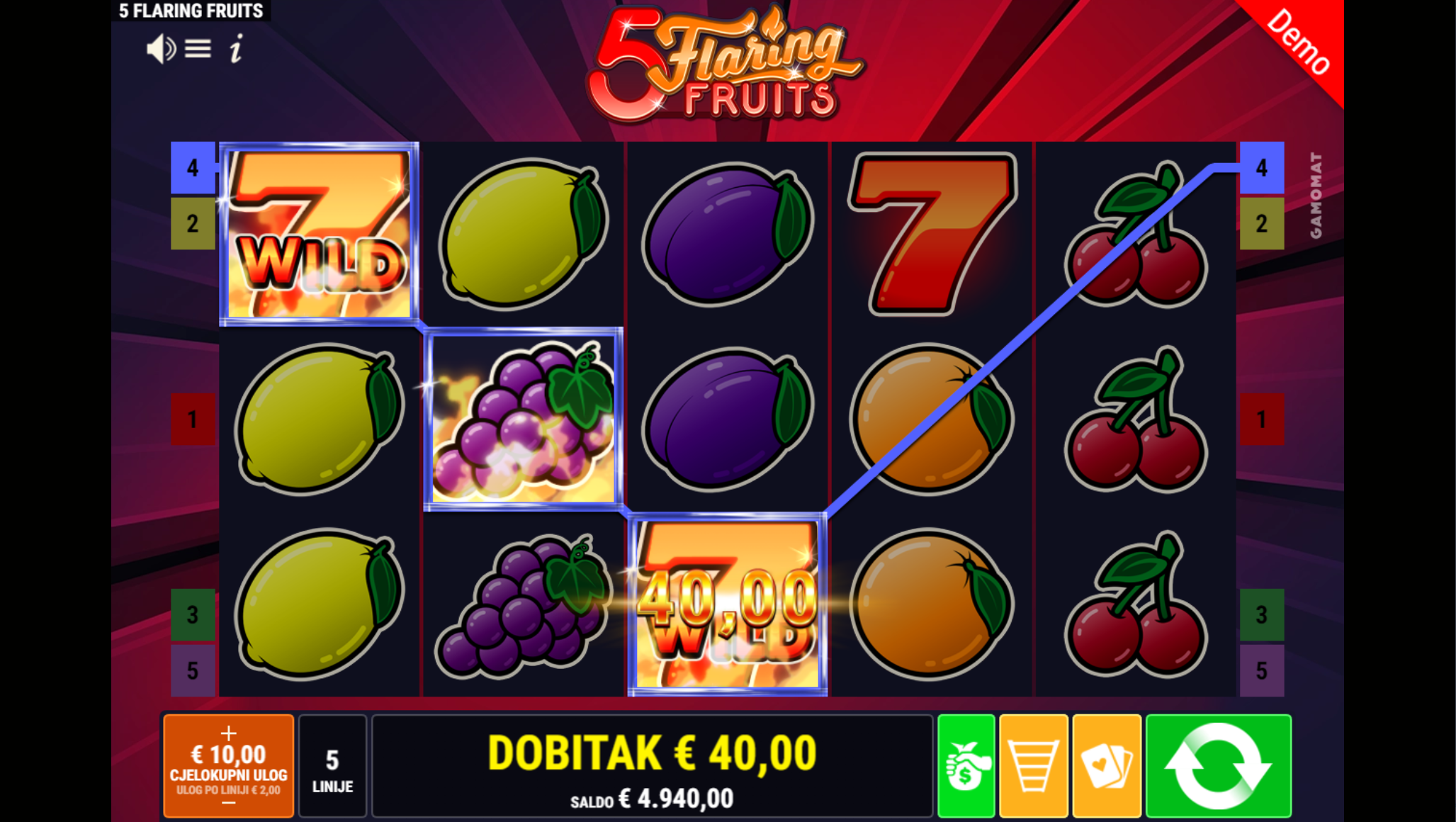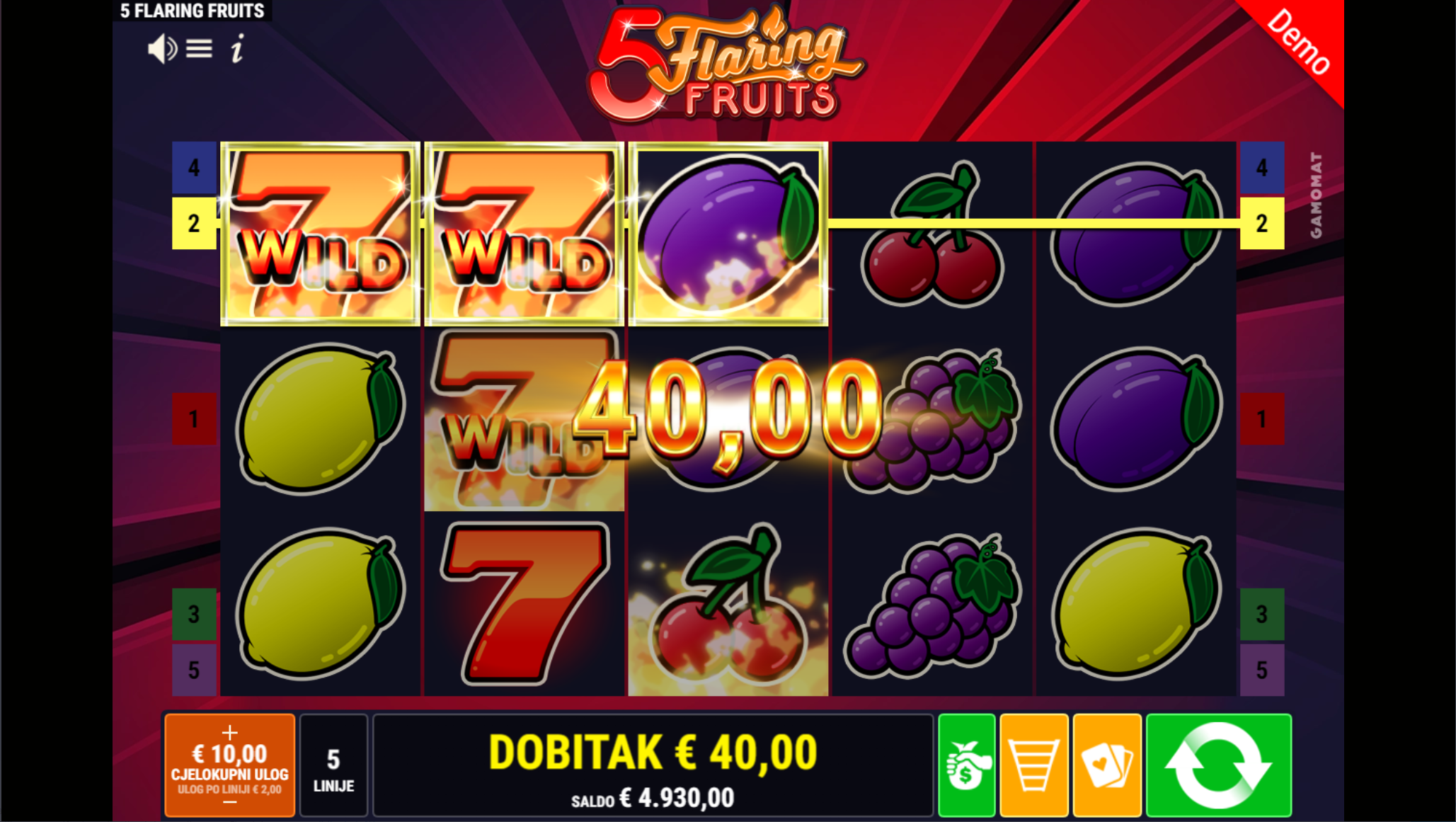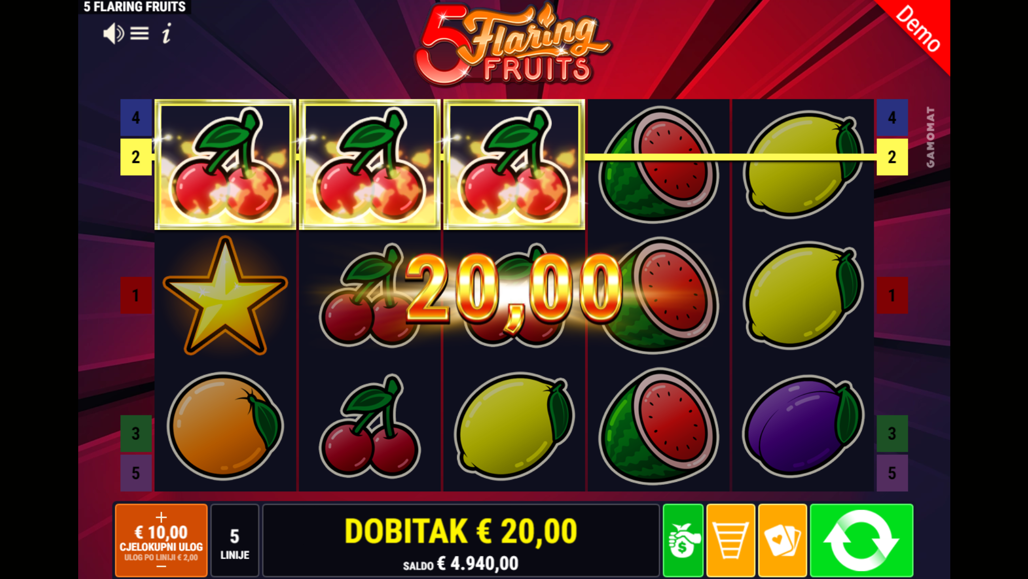Ljubitelj si klasičnih i jednostavnih slotova? Na pravom si mjestu jer 5 Flaring Fruits pruža sve to, a i mnogo više. Primamljivo ilustrirano voće jednostavnog dizajna kao i način igranja učiniti će dozu zabave i zanimacije nedostižnom! Tajanstvena sedmica kao wild simbol pobrinuti će se da je igranje super uzbudljivo te bogato po pitanju dobitaka! Kao jedan od najpopularnijih slotova, 5 Flaring Fruits odličan je izbor za sve igrače koji vole izvrstan omjer rizika i dobitaka.