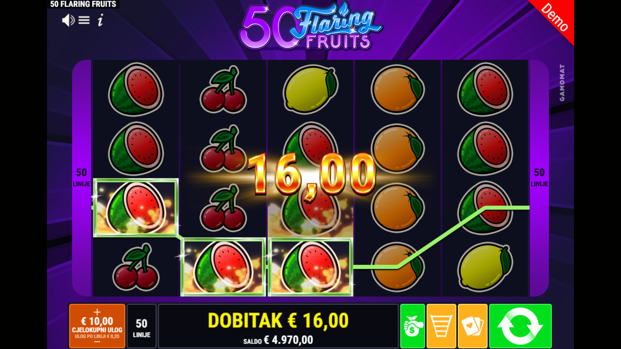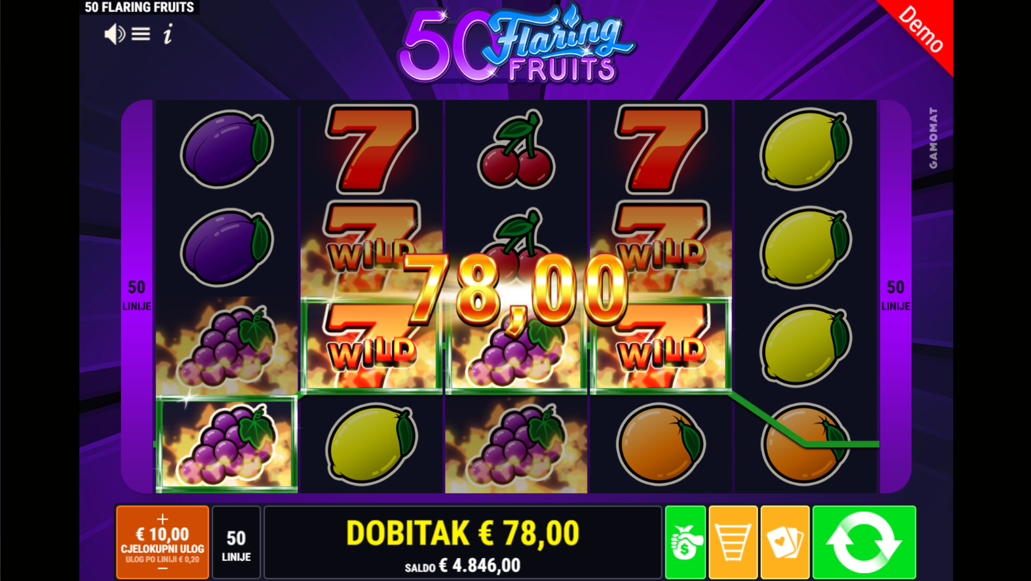 Ljubitelj si klasičnih i jednostavnih slotova? Na pravom si mjestu jer 50 Flaring Fruits pruža sve to, a i mnogo više. Primamljivo ilustrirano voće jednostavnog dizajna kao i način igranja učiniti će dozu zabave i zanimacije nedostižnom! Kako uzbuđenju tu nebi bio kraj pobrinuti će se sedmica kao wild simbol i igranje pretvoriti u super uzbudljivo te bogato po pitanju dobitaka! Kao jedan od najpopularnijih slotova, 50 Flaring Fruits odličan je izbor za sve igrače koji vole izvrstan omjer rizika i dobitaka.