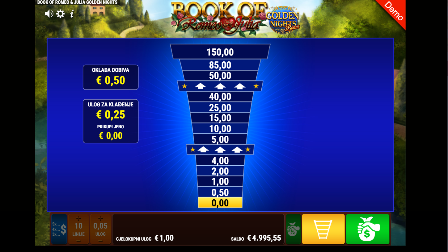 4. Koji su minimalni i maksimalni ulozi u igri Book of Romeo and Julia GDN?