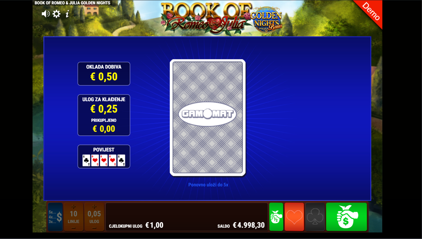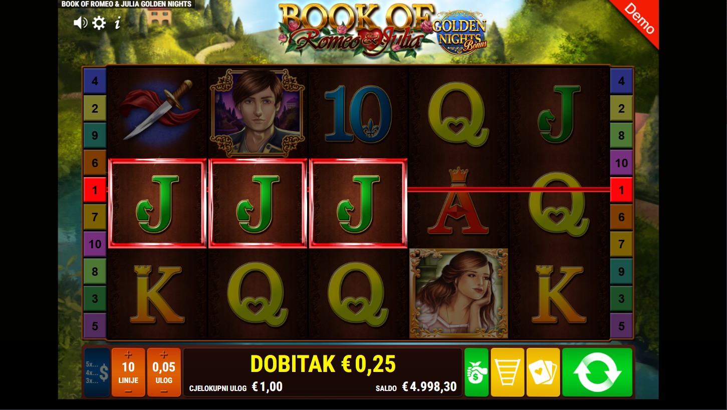 Book of Romeo and Julia GDN spaja Book of mehaniku s bezvremenskom ljubavnom pričom! Od providera Gamomat, igra ima 5 koluta, 3 reda i 10 isplatnih linija, uz knjigu koja djeluje kao wild i scatter. Kada se pokrene bonus runda, nasumični simbol se bira za širenje i veće dobitke. Slot nudi klasičnu strukturu s romantičnom atmosferom i šansom za srcolomne nagrade. Idealna za ljubitelje drame, romantike i velikih simbola!