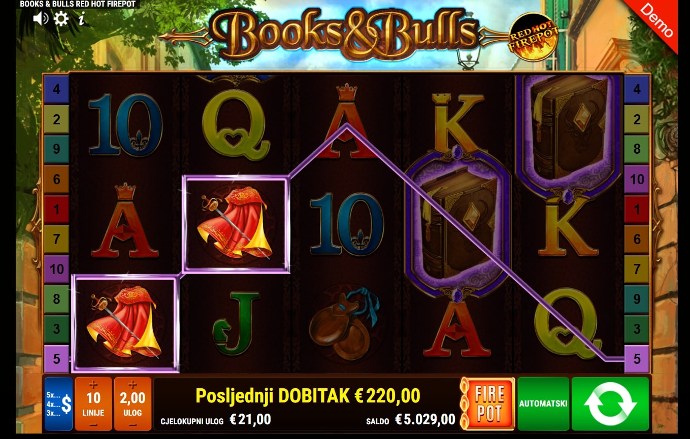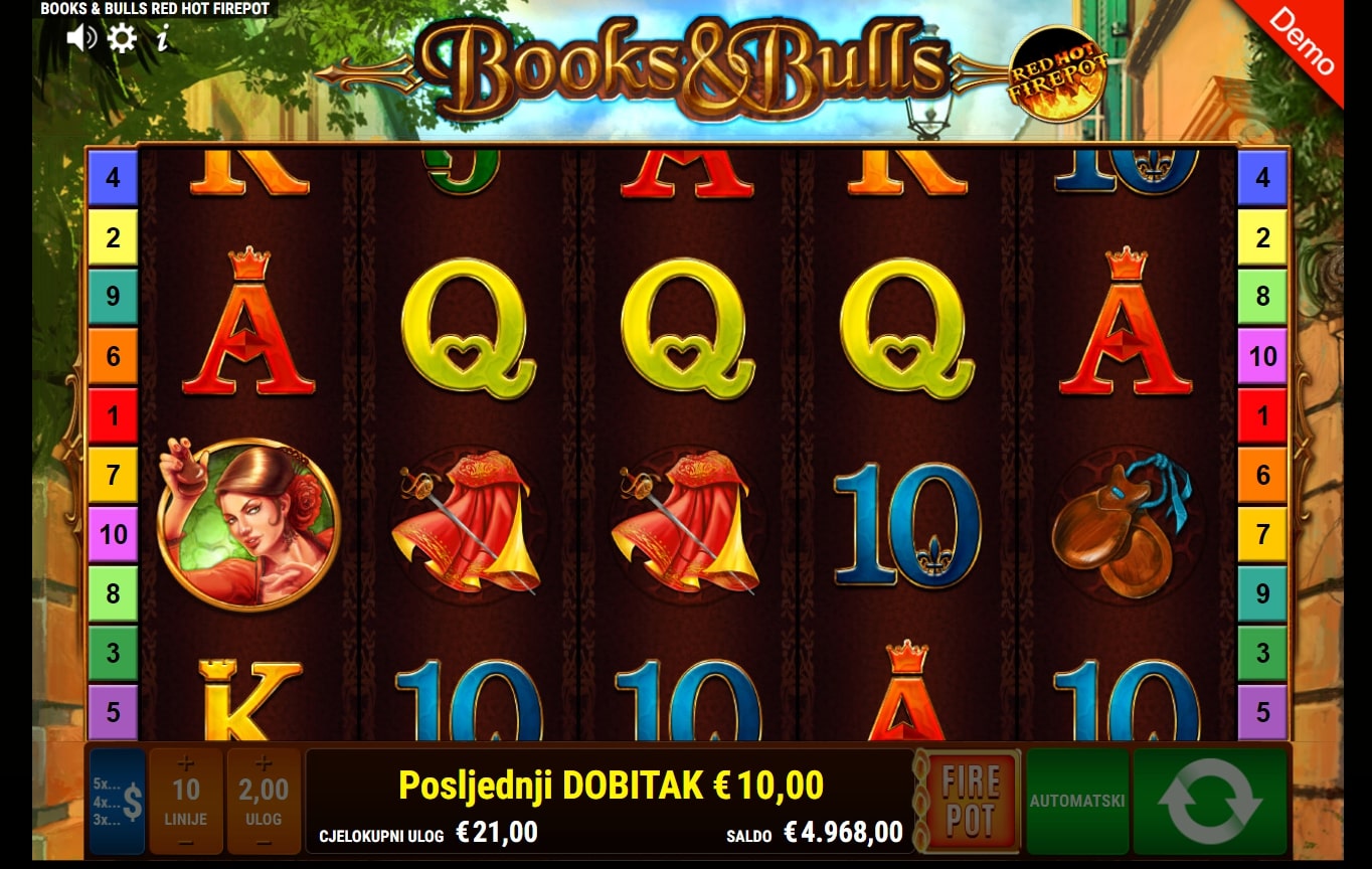 Books & Bulls RHFP tematska je slot igra koja vodi igrača u svijet matadora i bikova u borbu za vrhunske dobitke. Igra je dio Books & Bulls svemira igara gdje najviše isplaćuju plesačice te simboli mača i plašta, dok igrač uz to može okrenuti posebne simbole matadora koji mijenjaju druge simbole te knjige i bika koji mogu aktivirati posebne vrtnje. Također, igra sadrži značajku Red Hot Firepot koja može nasumično aktivirati Jackpot igru. Zaigraj Books & Bulls RHFP te osvoji legendarne nagrade!